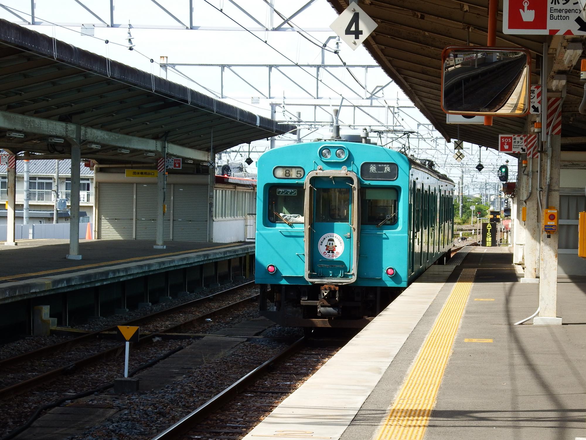 柳本駅から桜井線の105系電車で帰ります。JRでそのまま帰ると高くつくので、天理で近鉄に乗り換えます。2両編成の後ろは昔ずいぶんお世話になった、元常磐緩行線-千代田線の103形1000番代改造車。