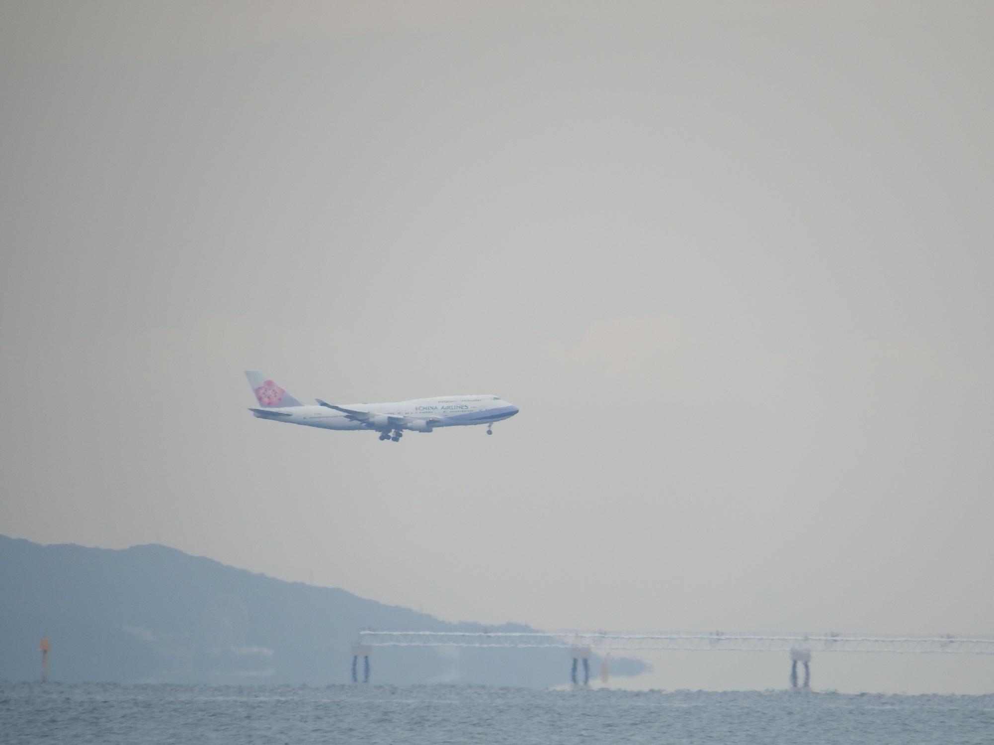 関空まで直線距離で7kmくらいです。着陸するマレーシア航空機とチャイナエアラインのジャンボ。ジャンボが見られる国内の空港は少ないですよね。