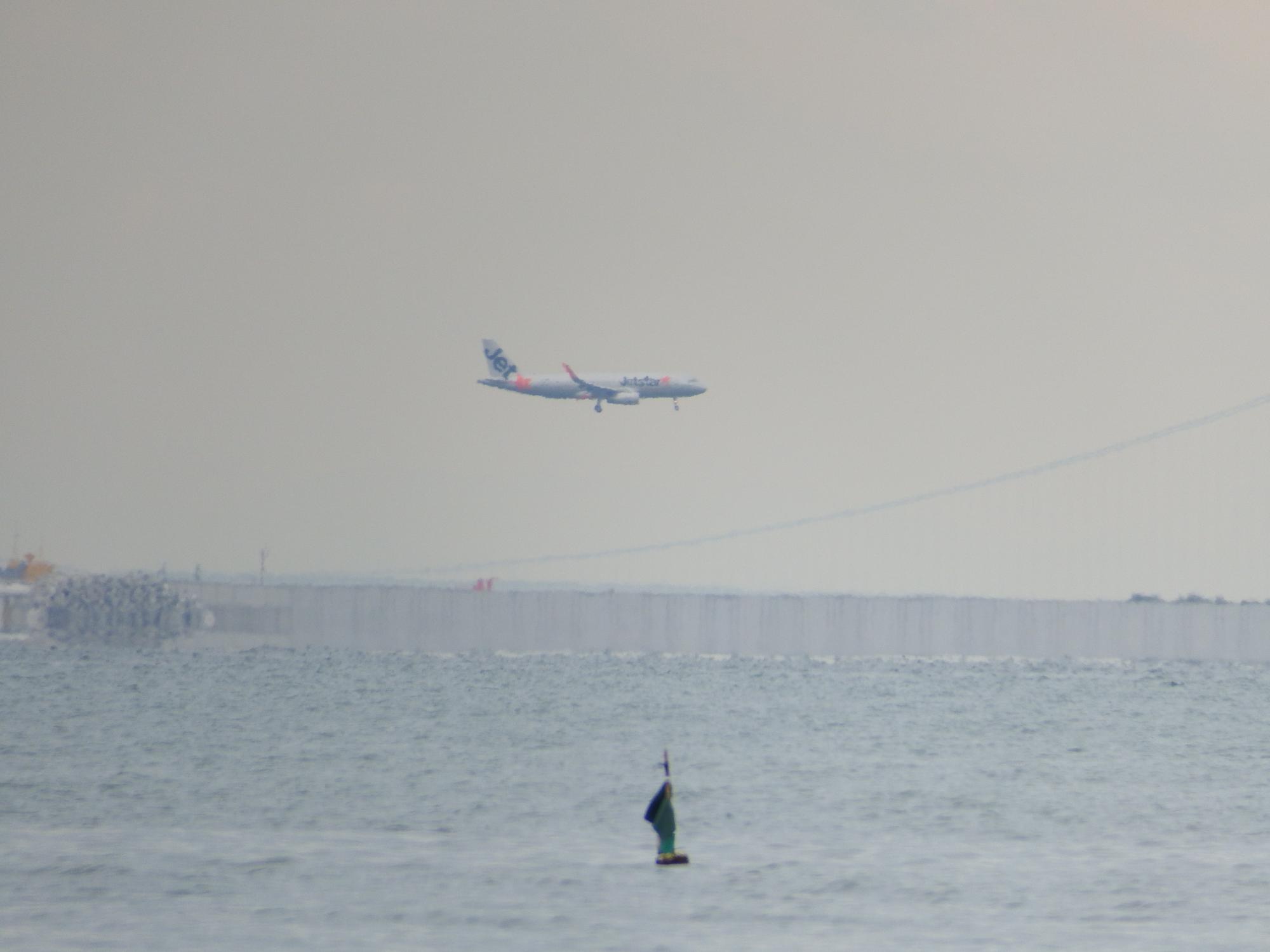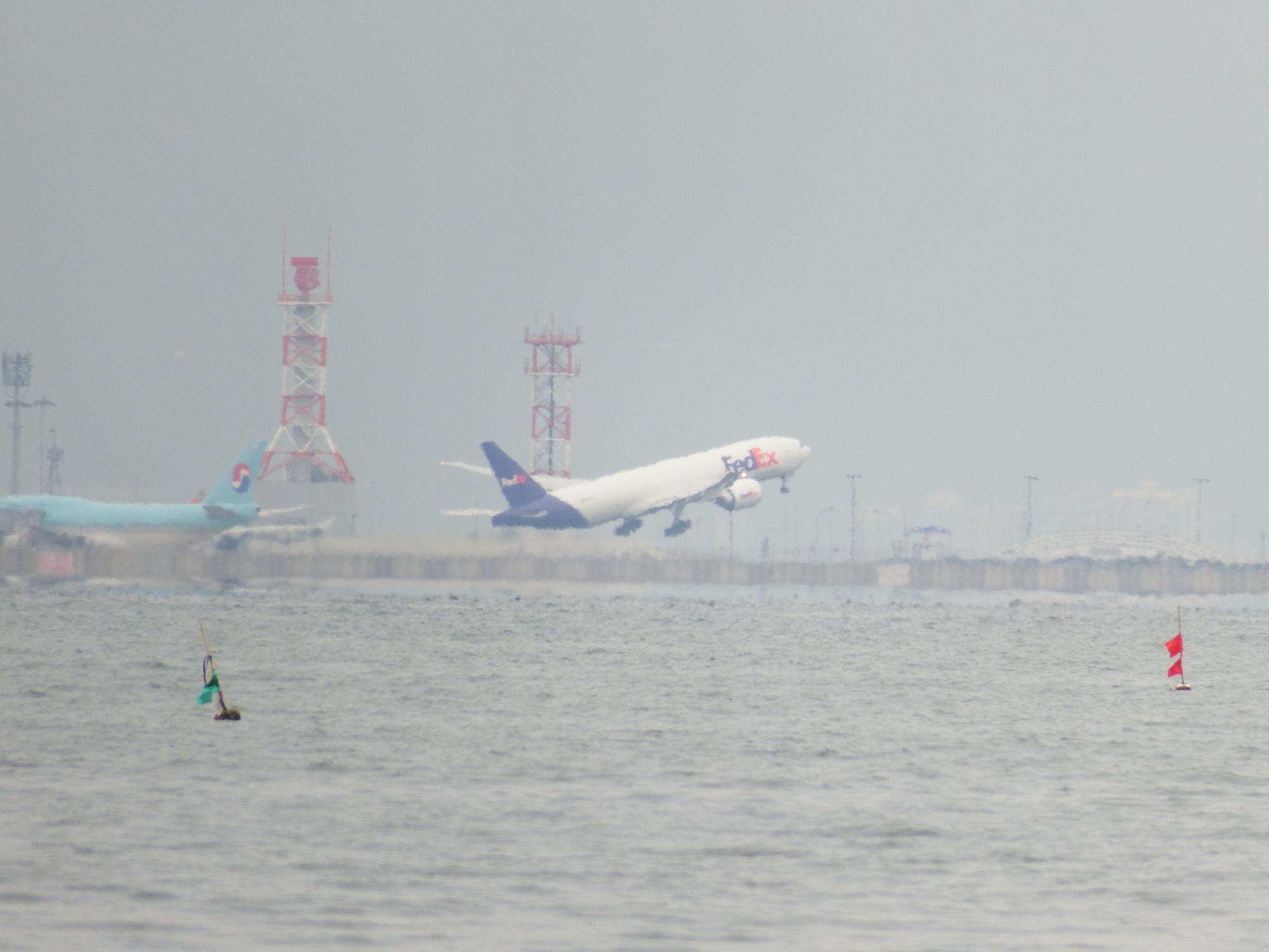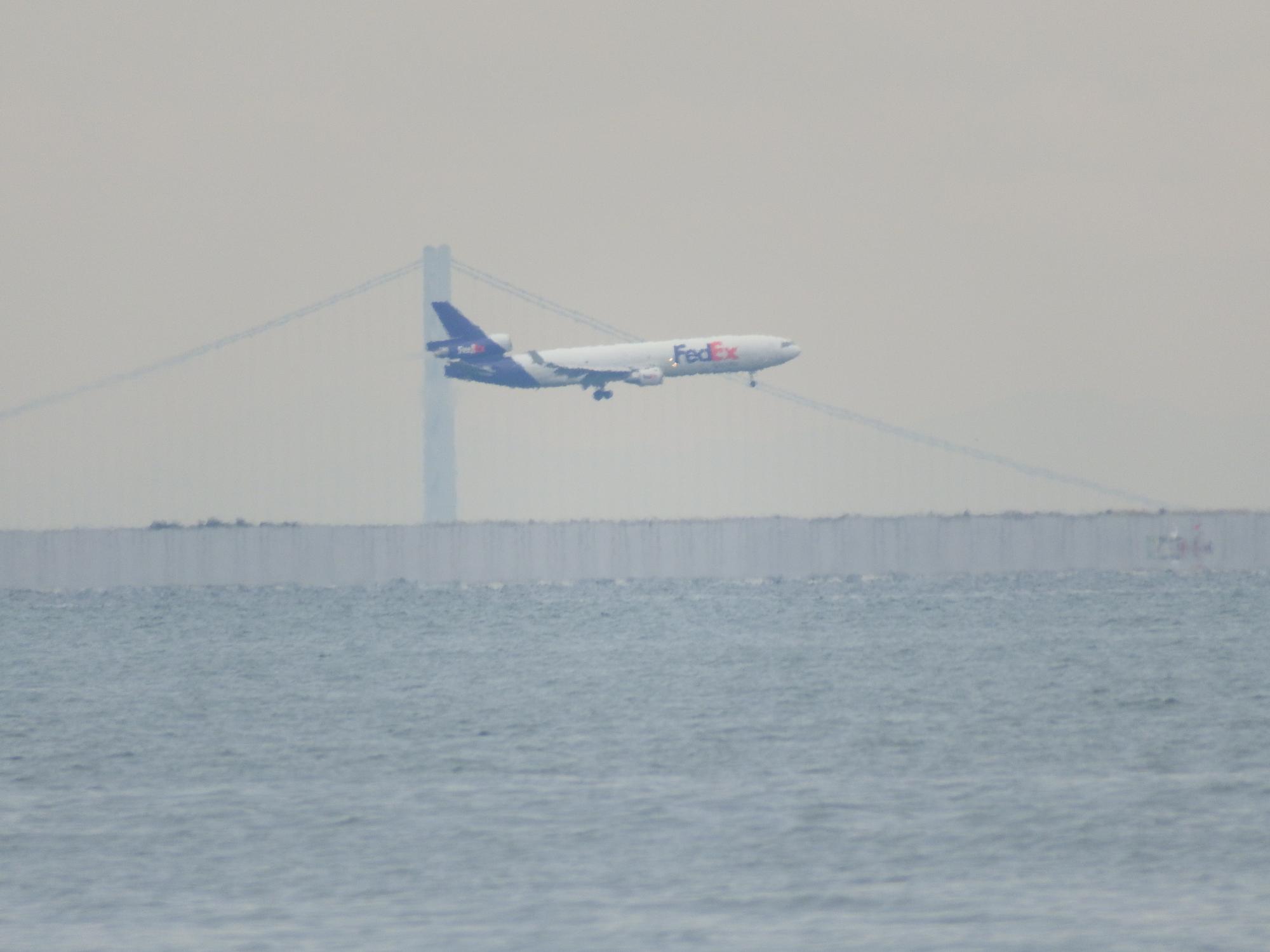 Fedexカーゴの着陸シーンと離陸シーン、今日は曇っているものの空気が澄んでいて遠く明石海峡大橋までよく見えます。直線距離で約34km!