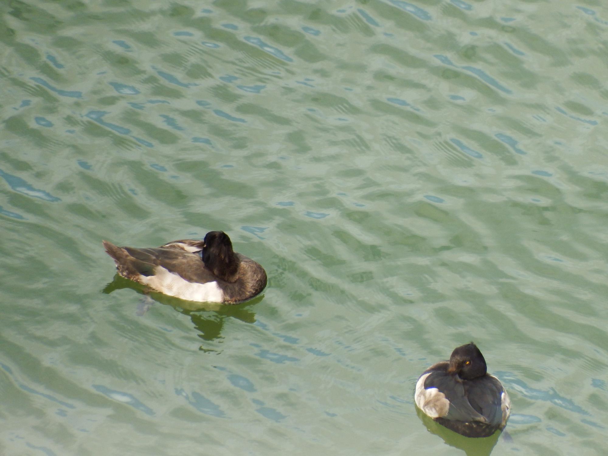 キンクロハジロが2羽、夏の間カルガモとマガモくらいしかいなかったのが、冬に向かって色んなカモで賑わうことになるはずです。
