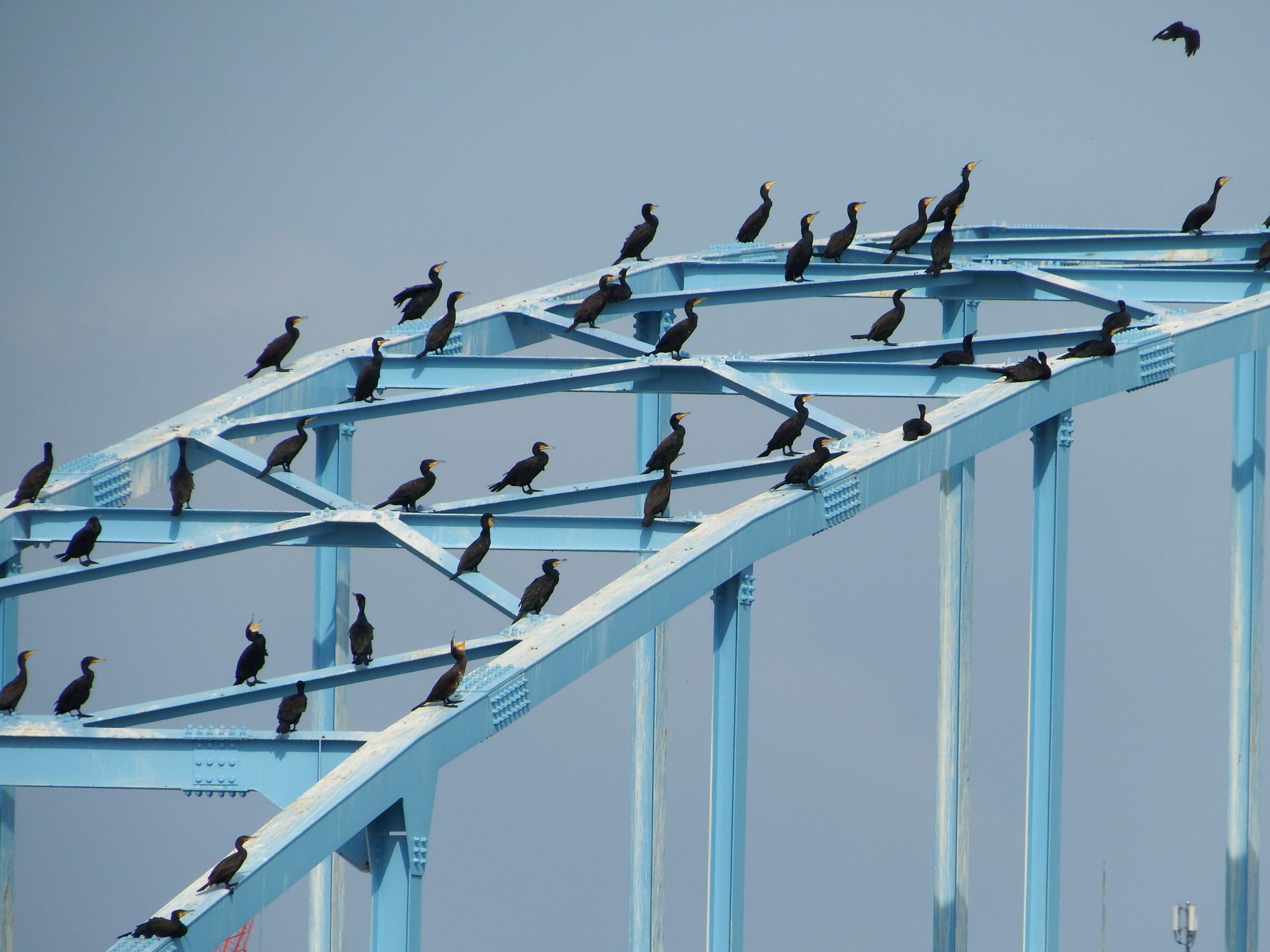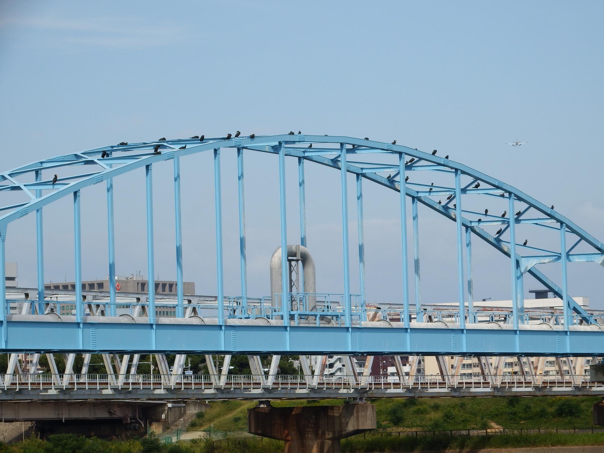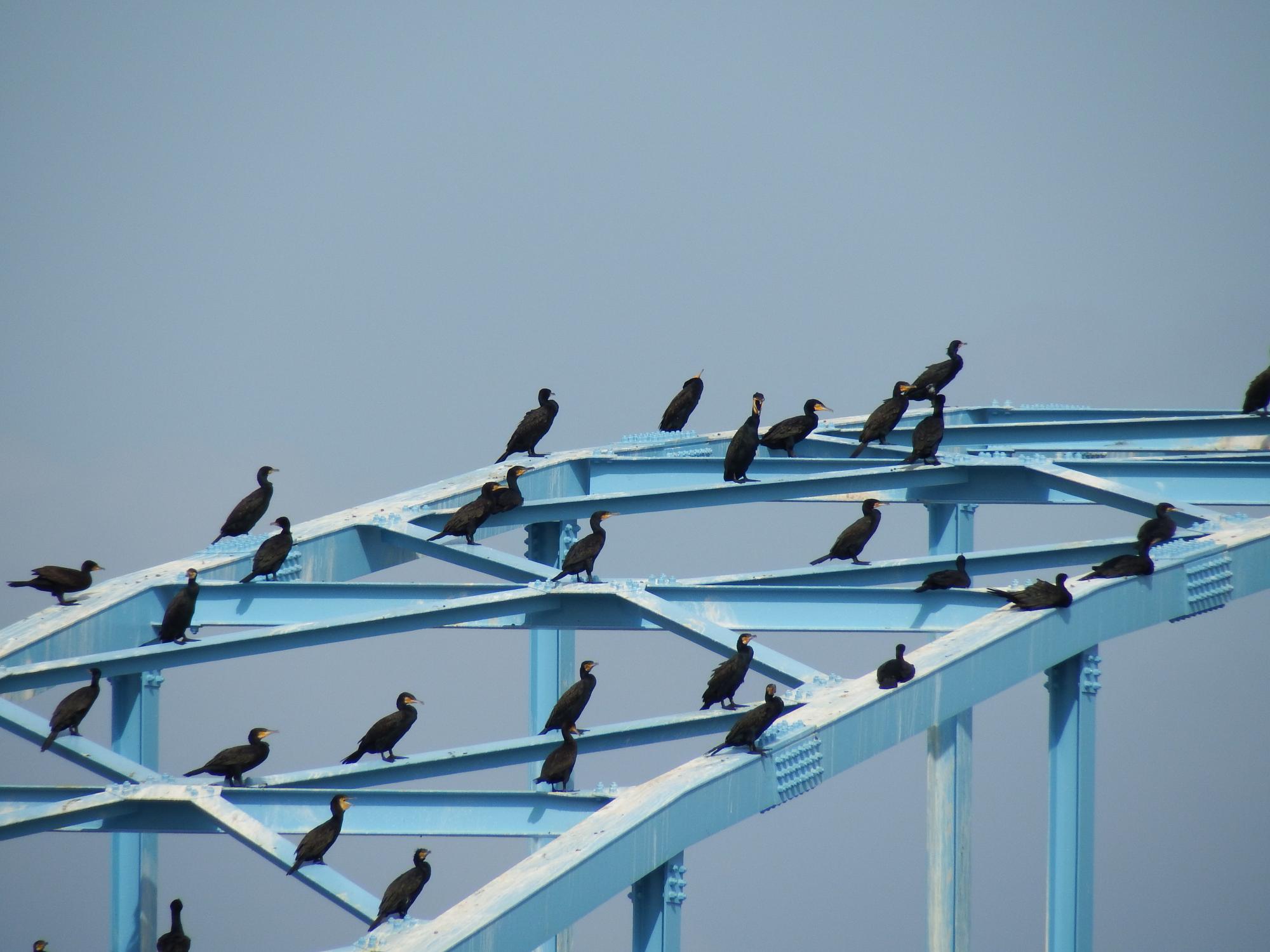飛行機から視点を下げると、長柄水道橋にカワウの大軍団がいました。大体が同じように右上を見ていますが、口を空けて真上を見上げてるヤツ、腰をどっかり下ろしてしまっているヤツ、色々いて見飽きないです。