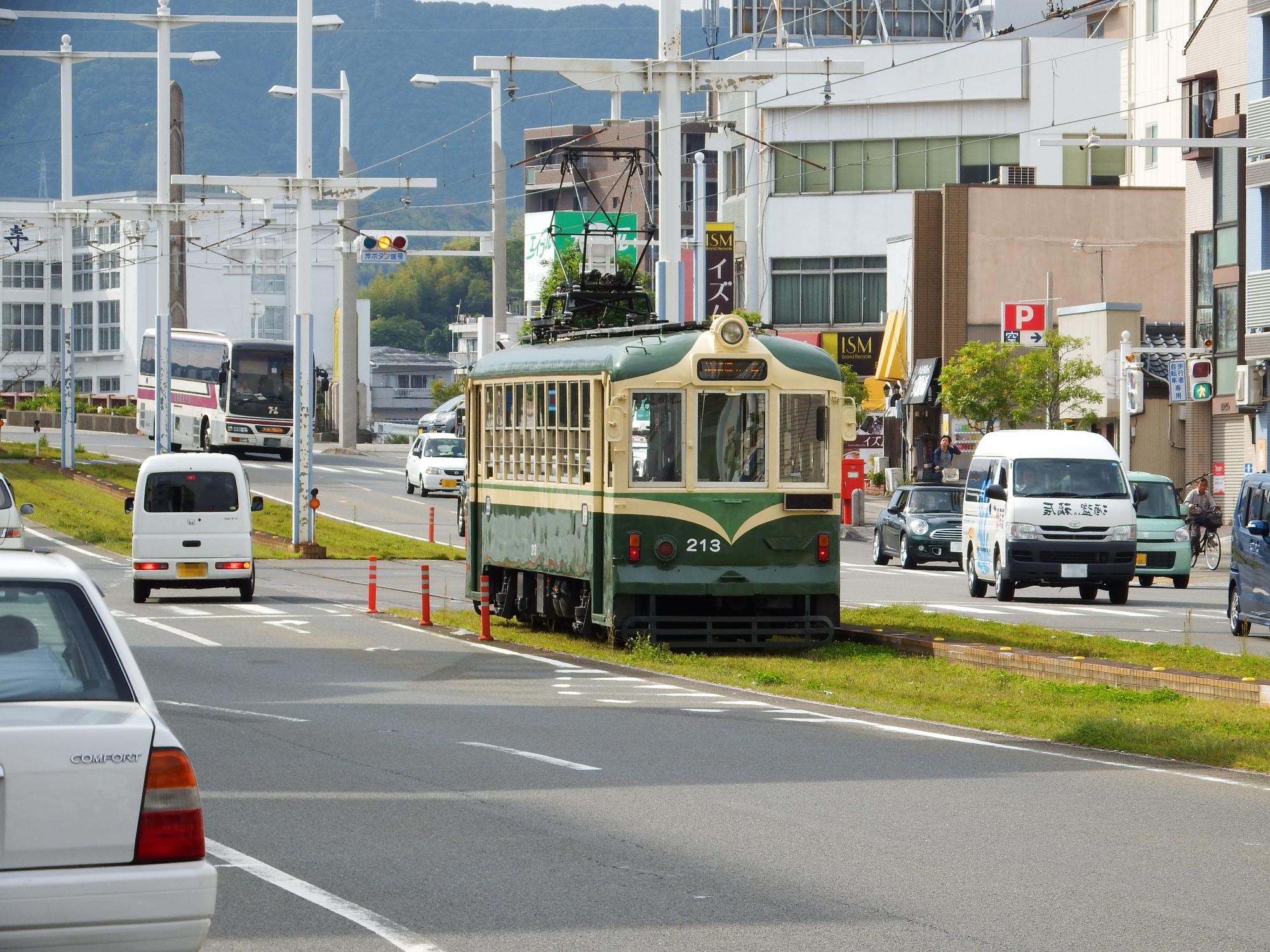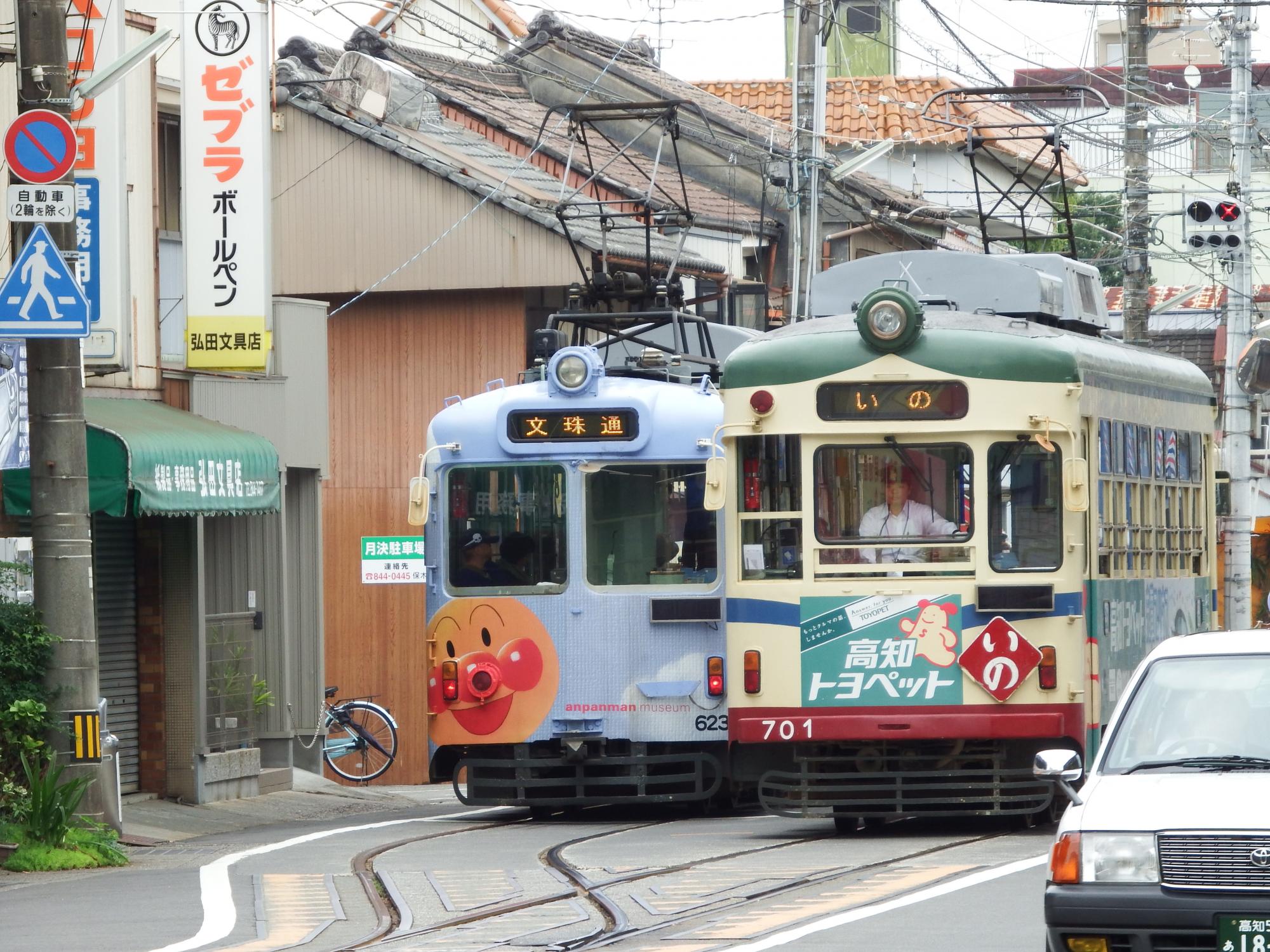 朝倉駅前電停で「いの」行サボを掲げた700形と交換、プラットホームはなく、道路のグリーンの部分がその代わりです。