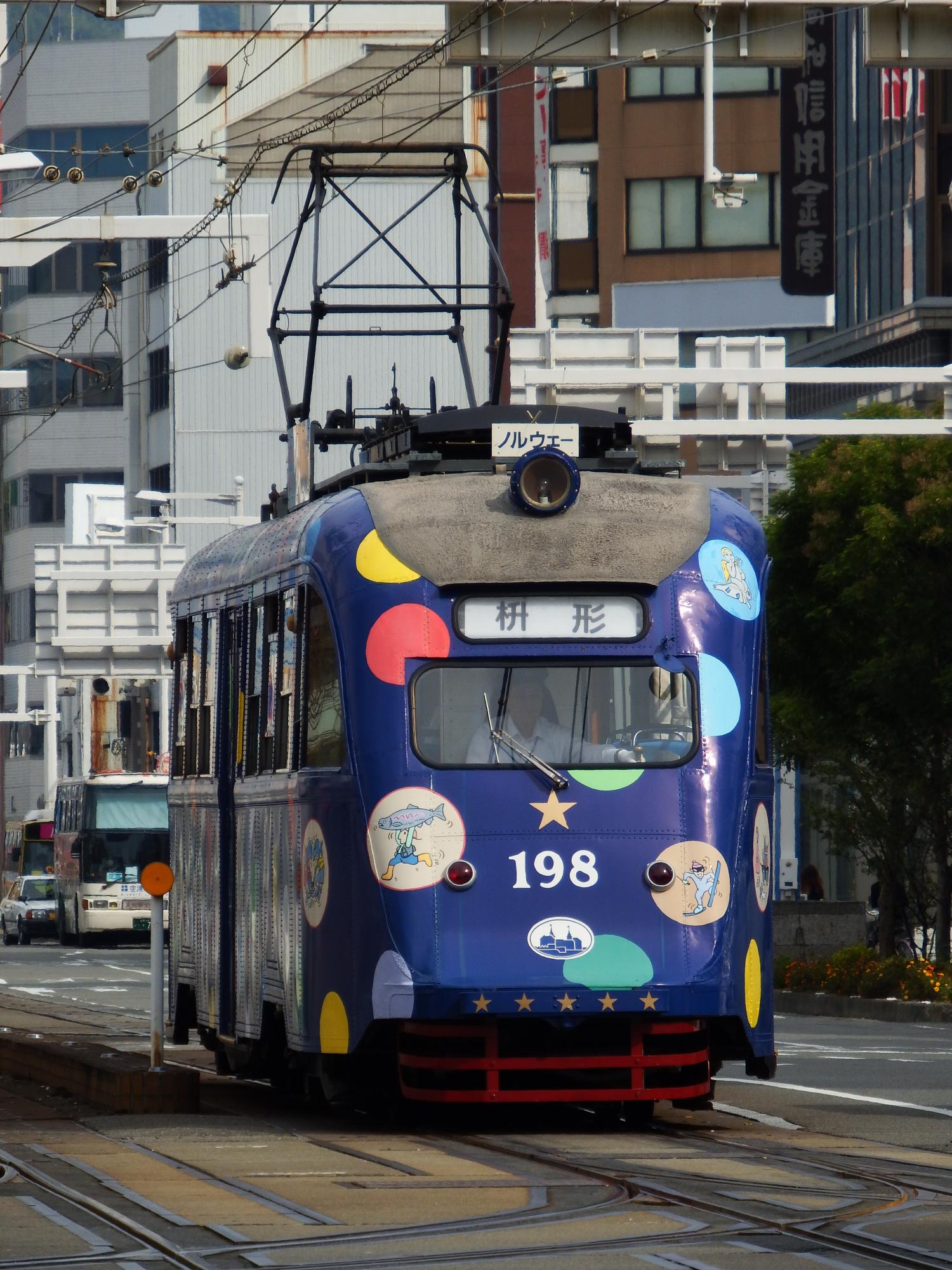 198形の全長は15.9m、600形の約13m、200形の11.6mと較べてかなり大きいです。ちなみに国内の路面電車としては大型の阪堺電車モ161形は13.7m、堺トラム3連接全体で16.7mなので、堺トラムが1両のままで走っている感じです。