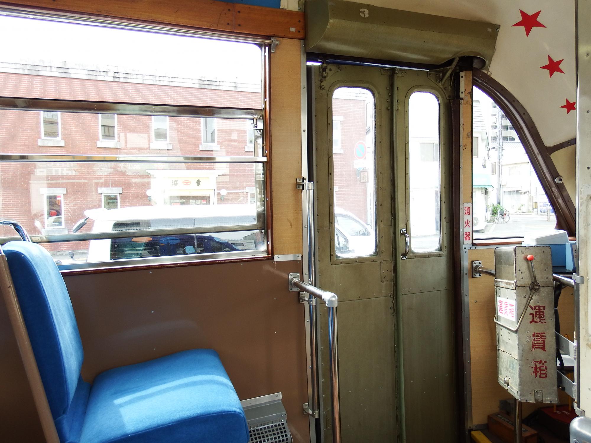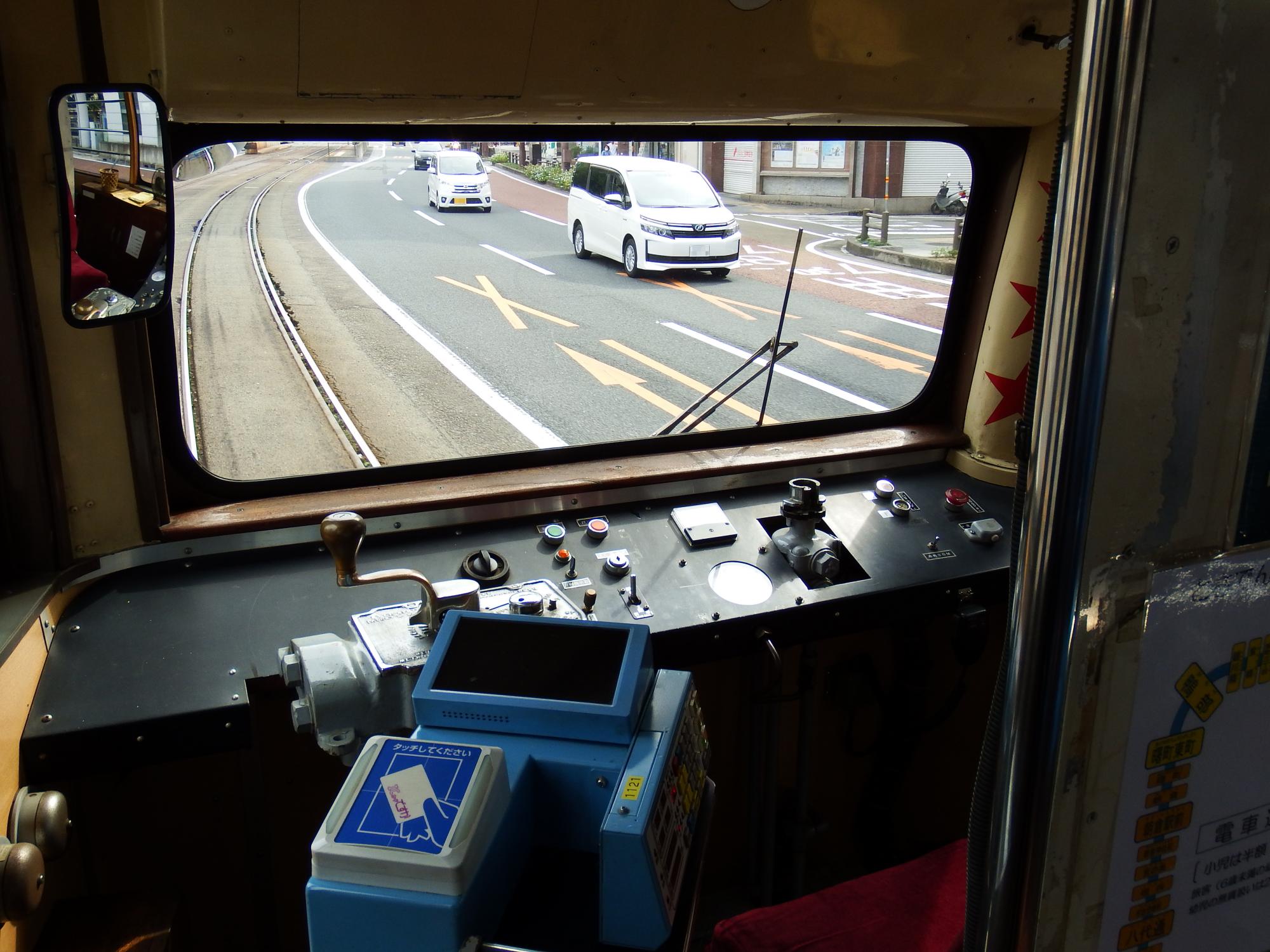 198形のヨーロピアンな車内、日本の路面電車とは全然趣きの異なるレイアウトの運転台。