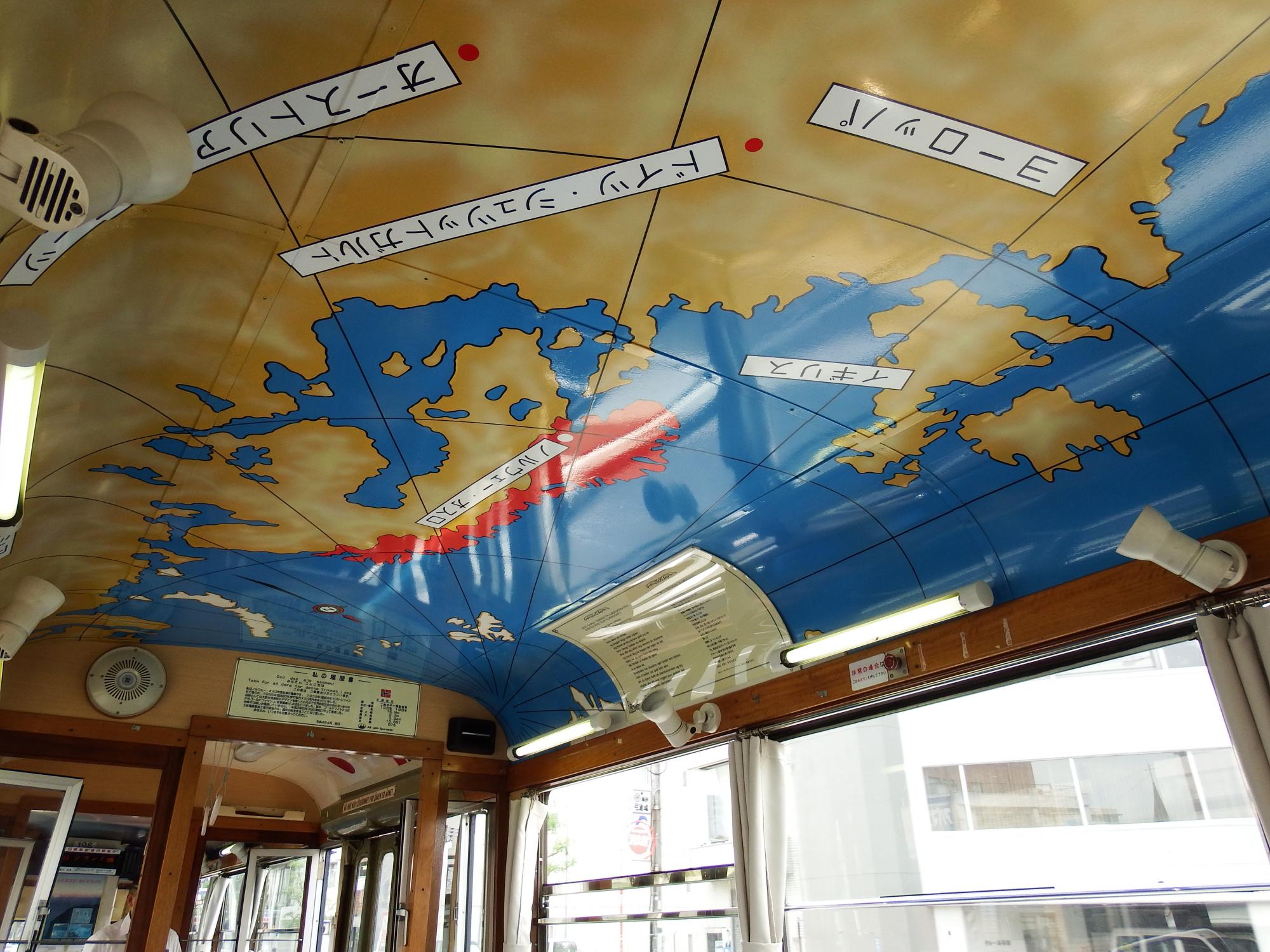 ワンマン化していないので、車掌さんが乗務しています。天井には中世ヨーロッパ風の地図。