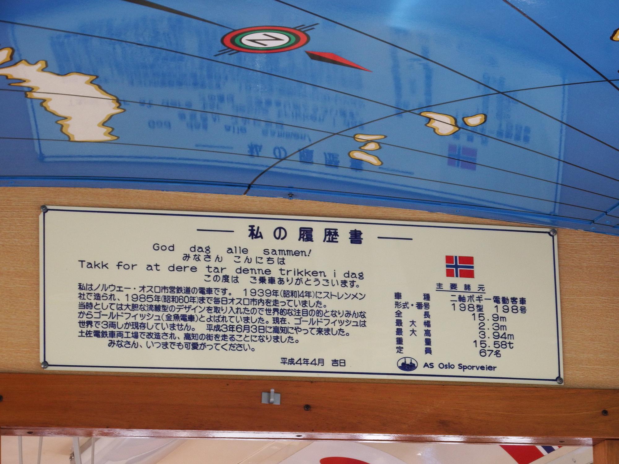 「私の履歴書」は他の車両と違ってちゃんとしたパネルになっていました。1939年製、75歳の電車です。車内も最低限の改造だけで元の姿を大事にしているとわかります。