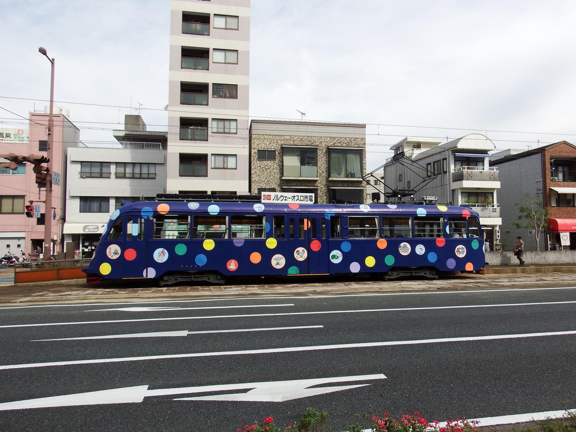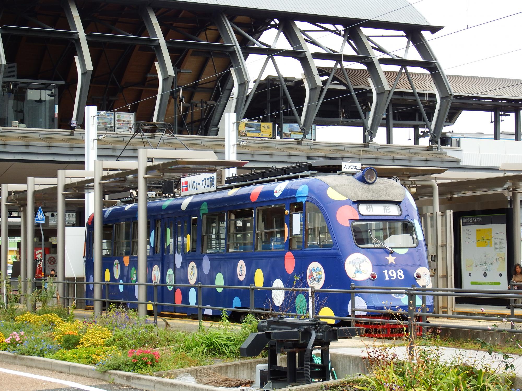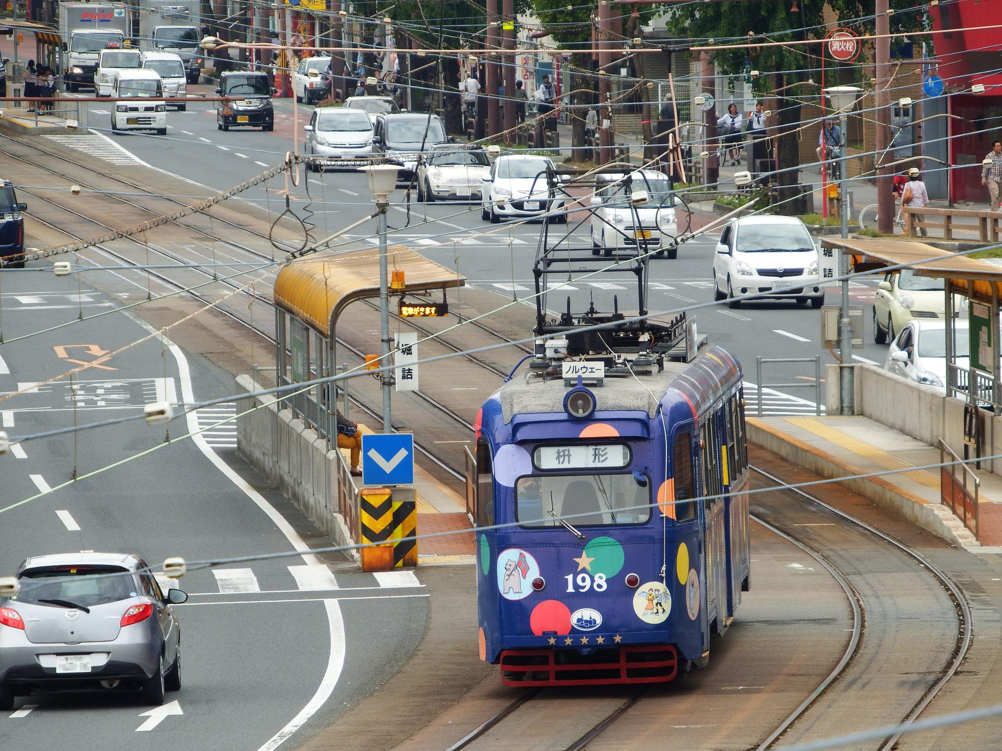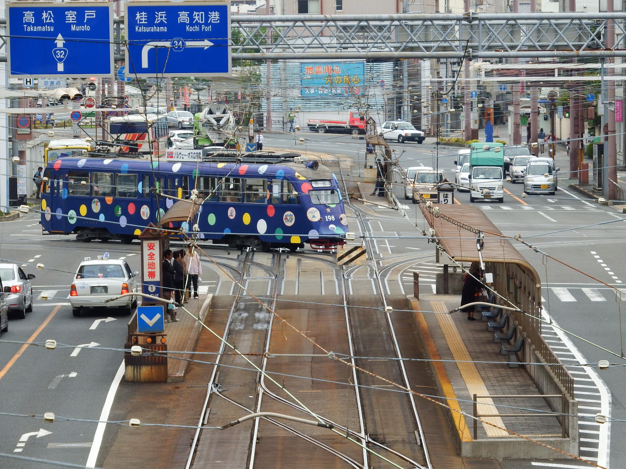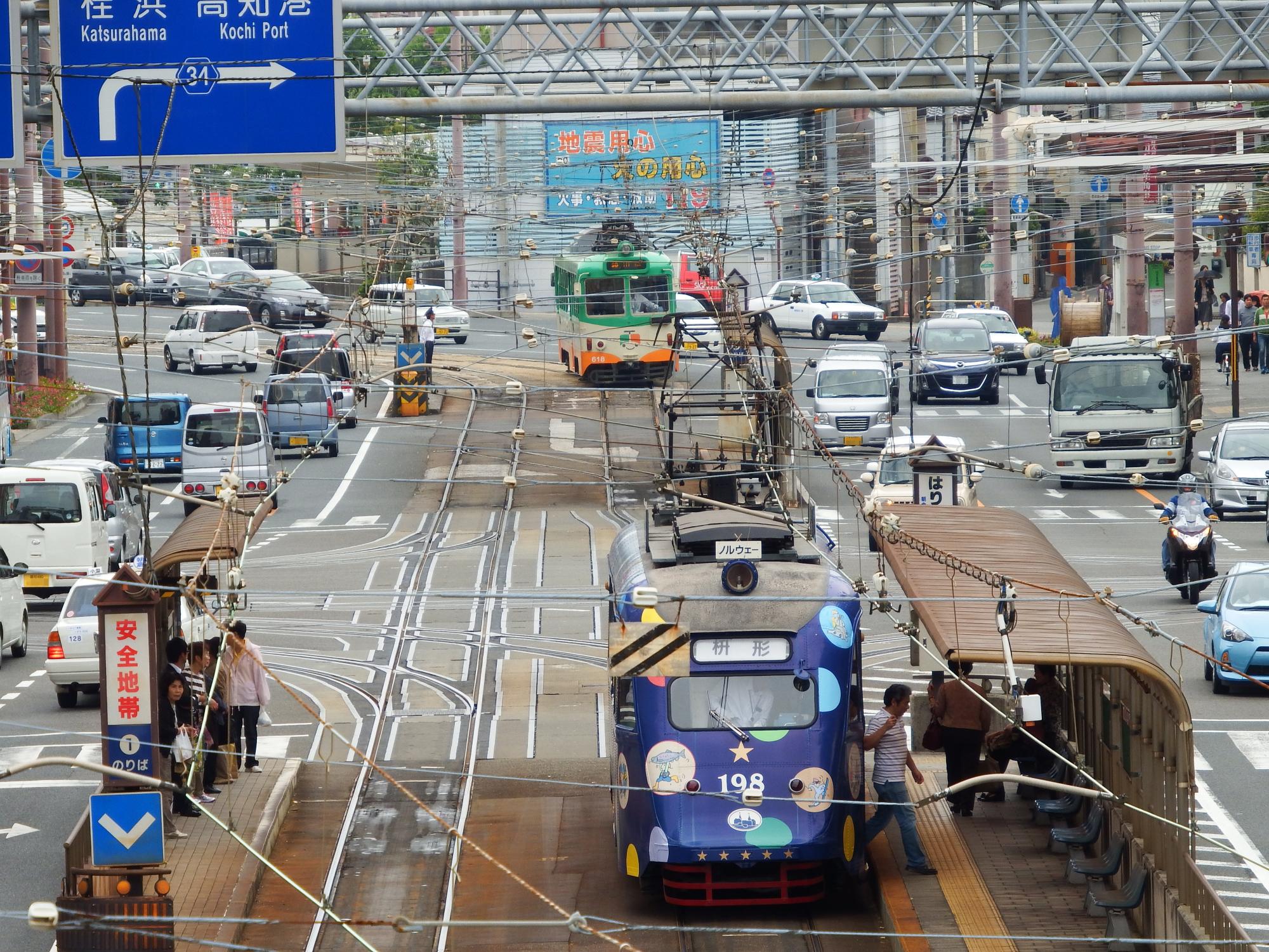 と、その時、高知駅へ向かう元ノルウェー・オスロ市電の198形がやって来ました。