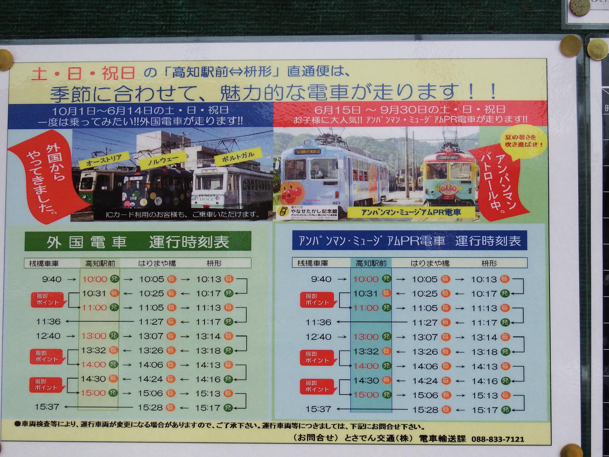 『土・日・祝日の「高知駅前⇔枡形」直通便は、季節に合わせて、魅力的な電車が走ります!!』というポスター。今日は198形ですが、元オーストリア・グラーツ市電の320形や元ポルトガル・リスボン市電の910形が走る日もあるようです。「外国電車」はクーラーががついていないので、夏場は「アンパンマン」ということのようです。