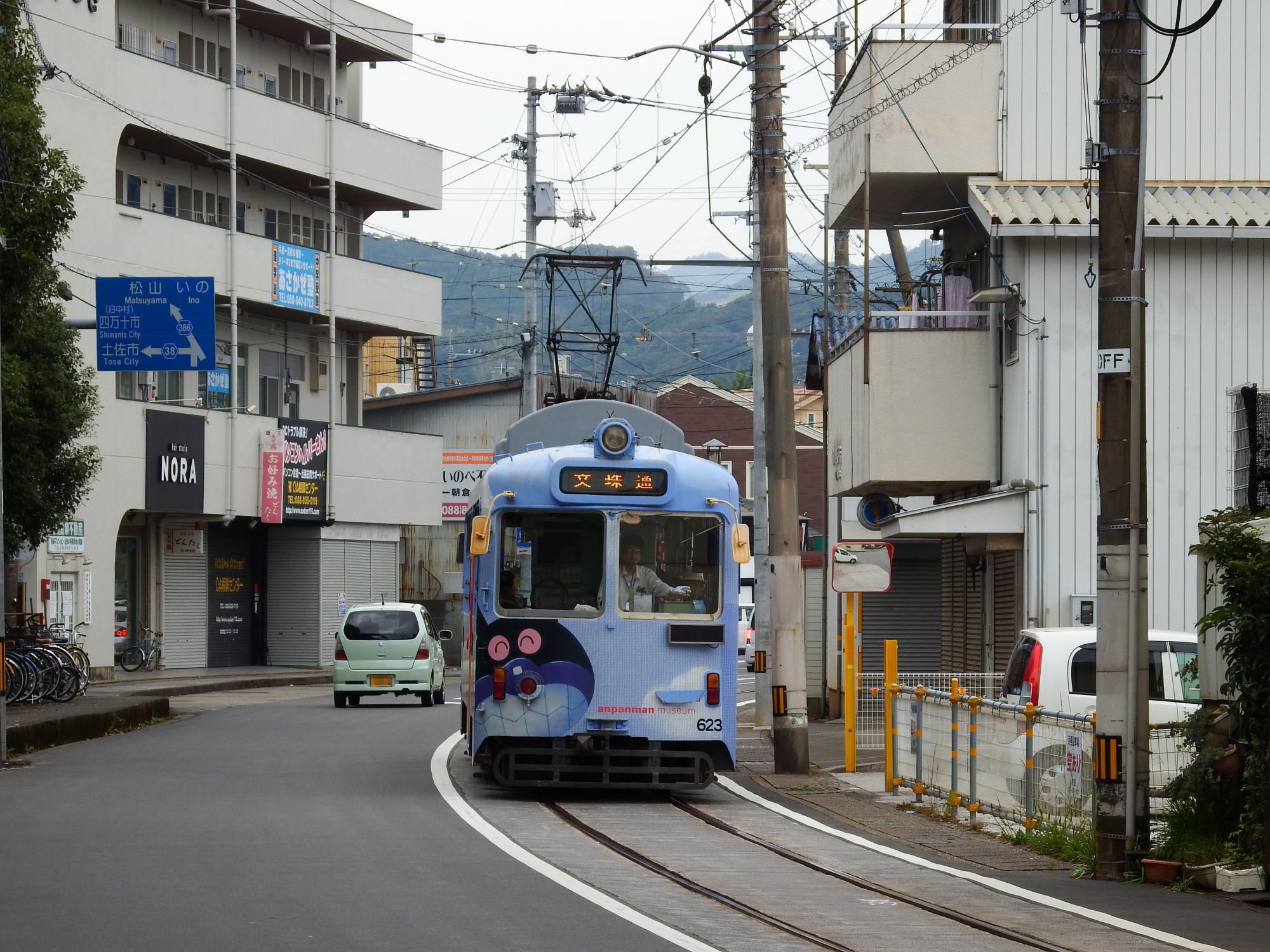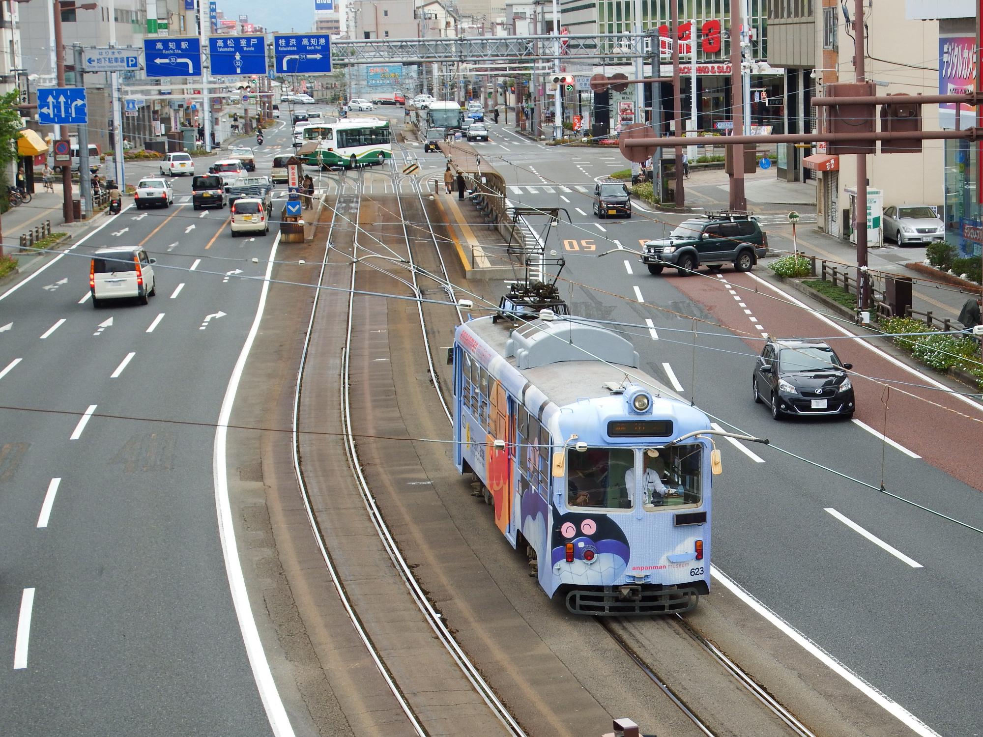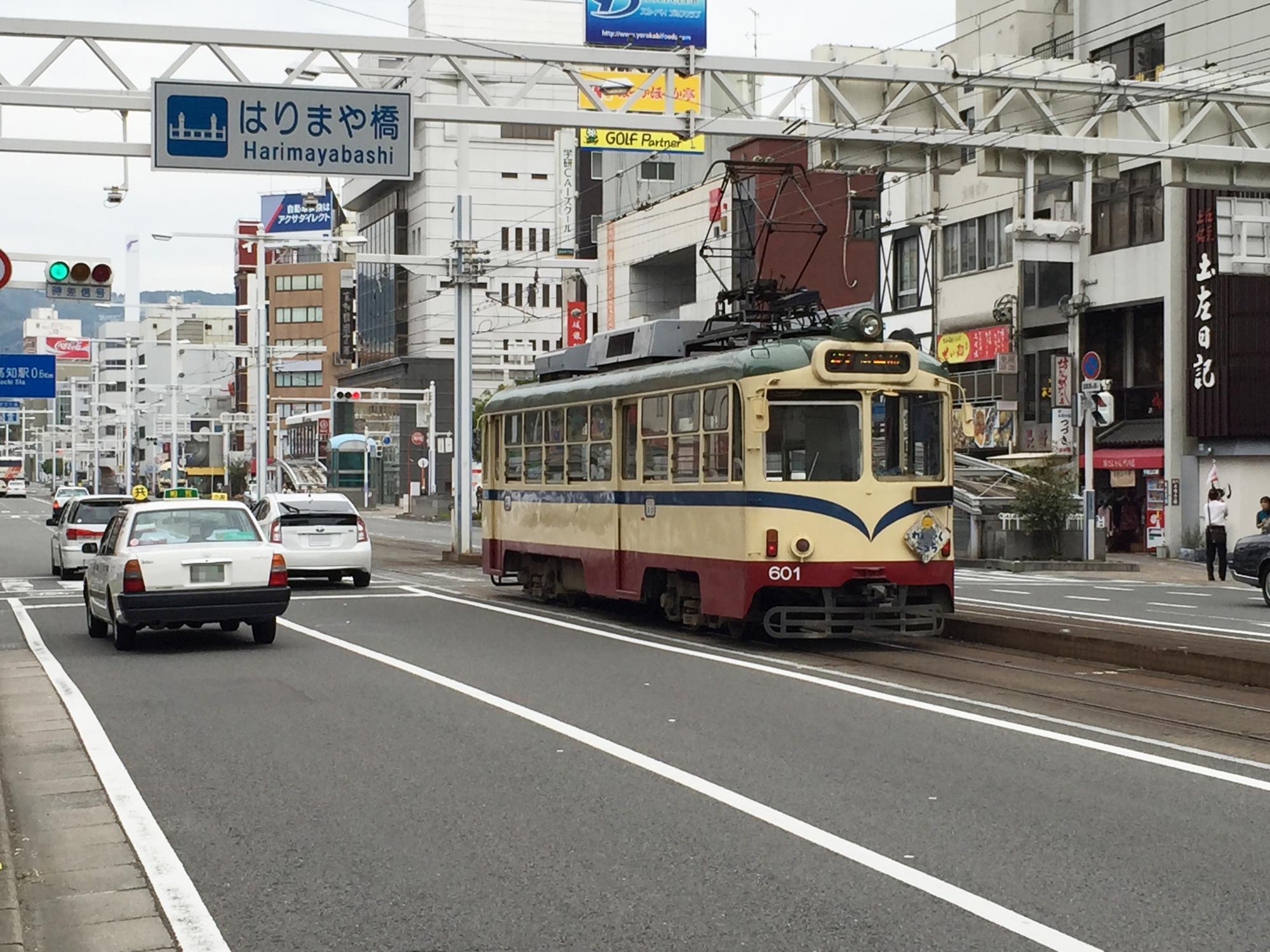 知寄町方向からやってきたのは新しいとさでん交通のCIカラーになった600形です。