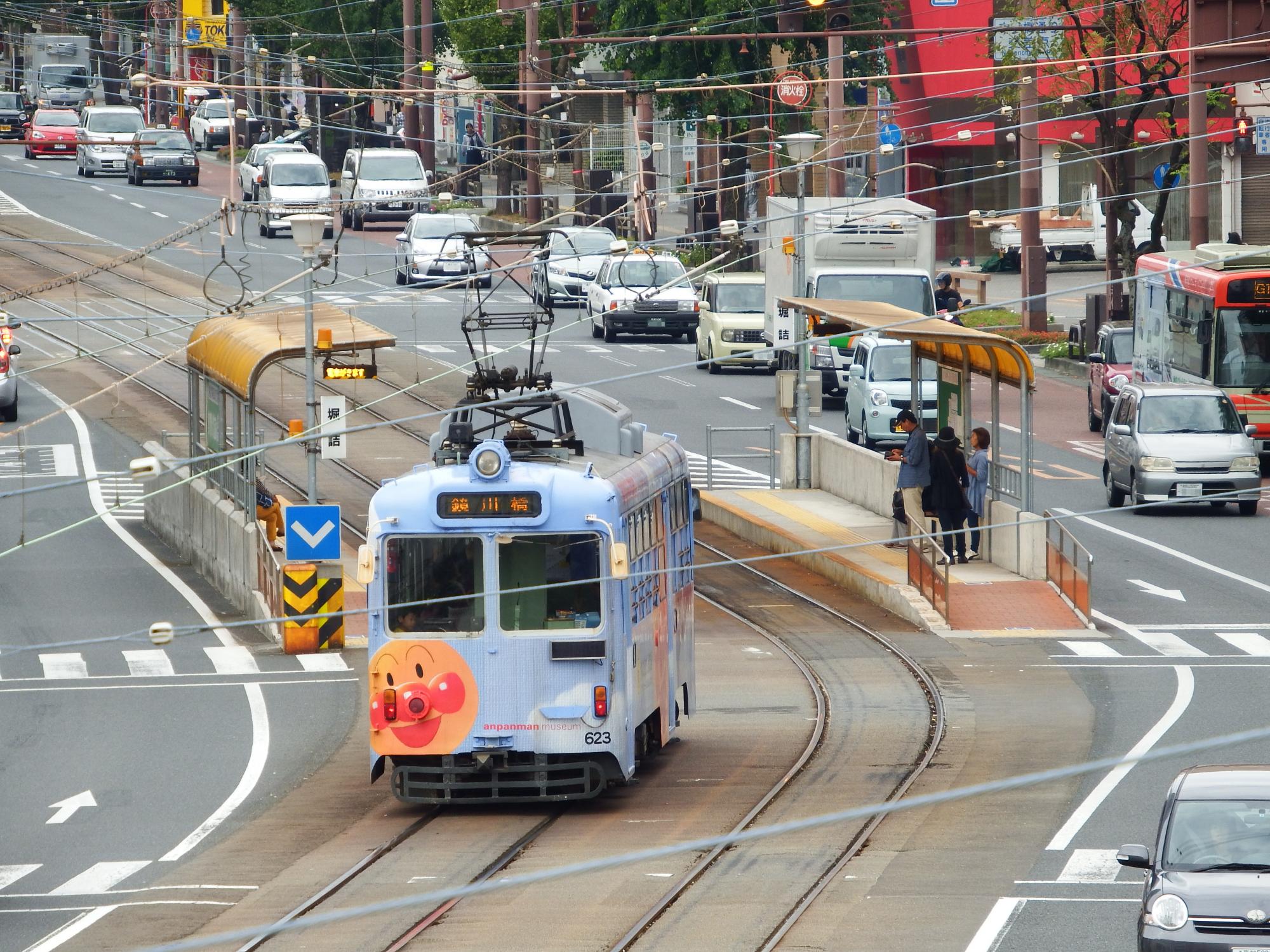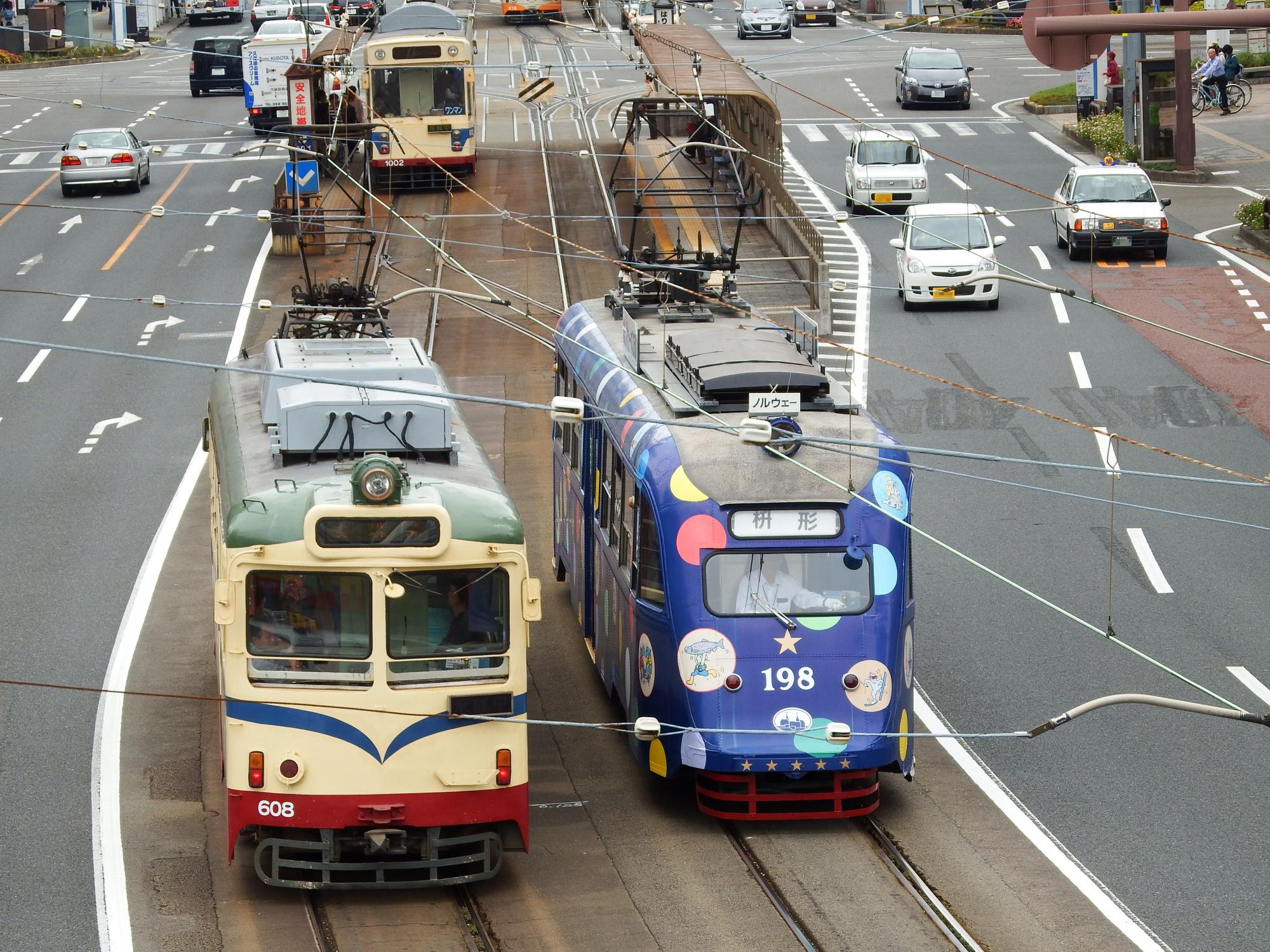 堀詰電停で600形と行き違い。