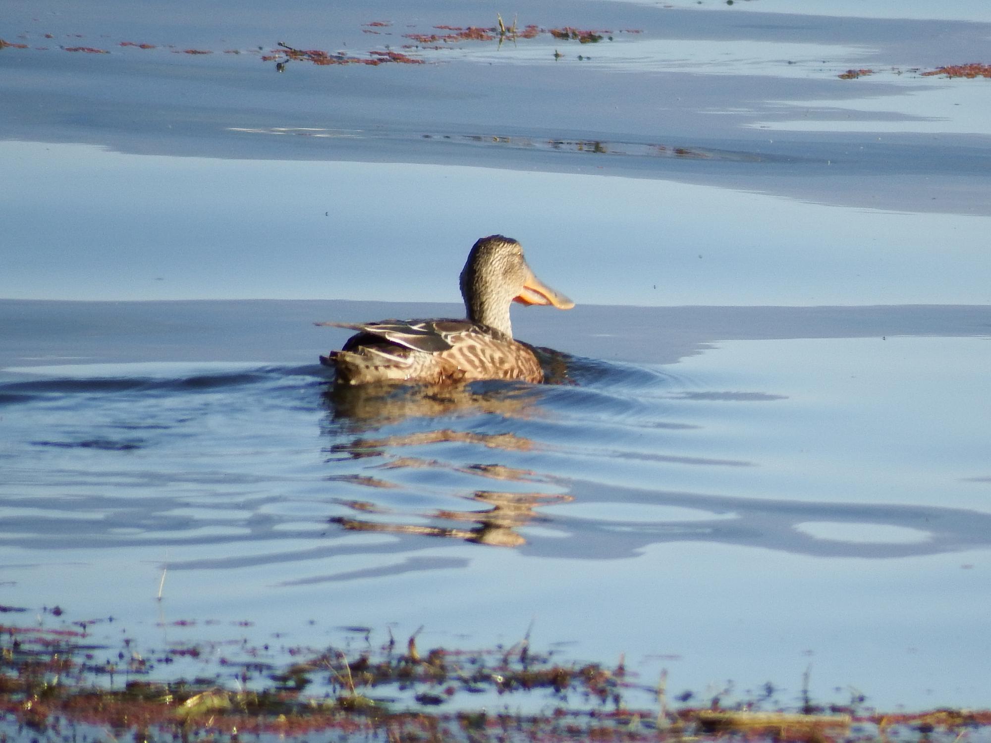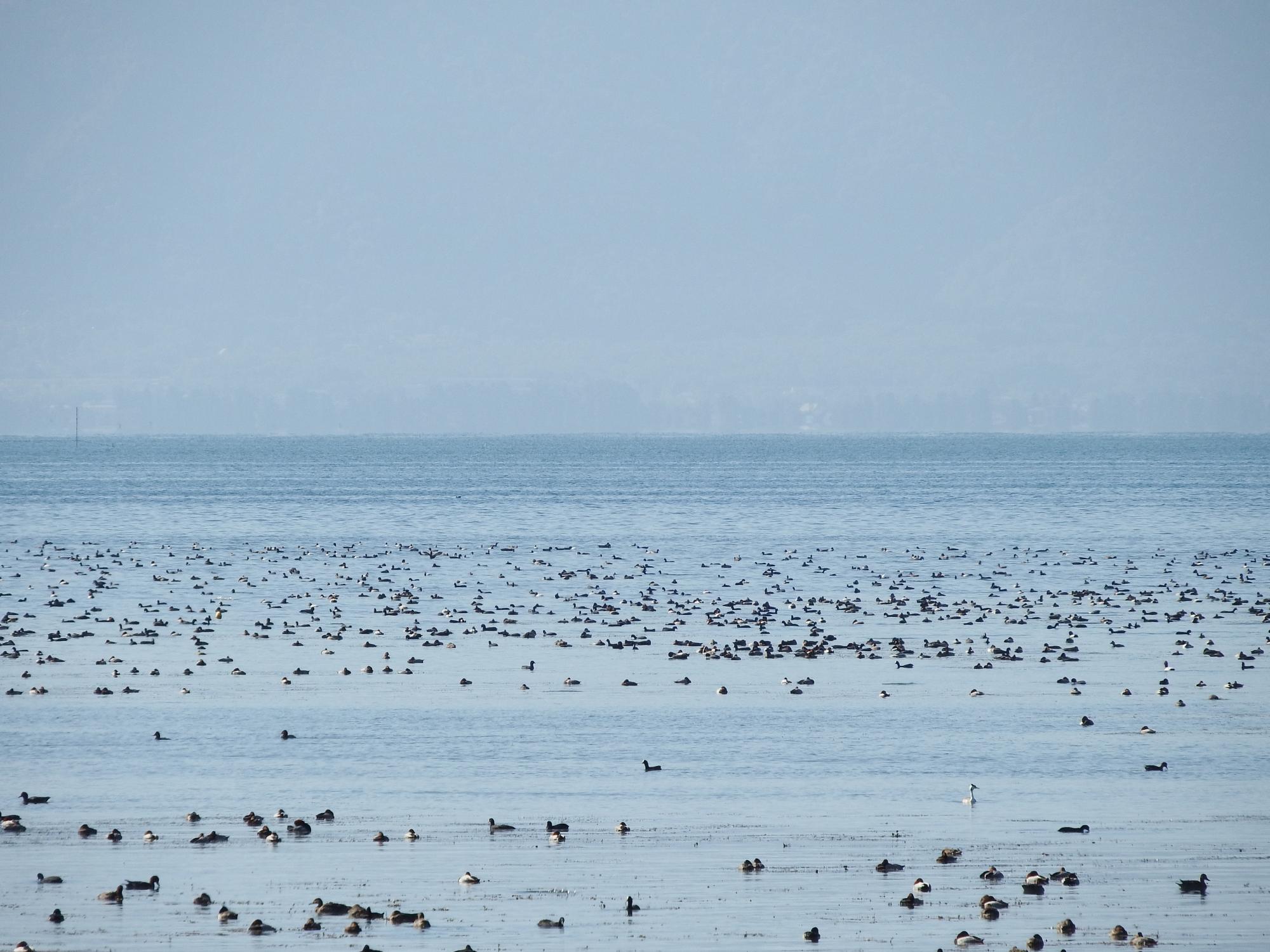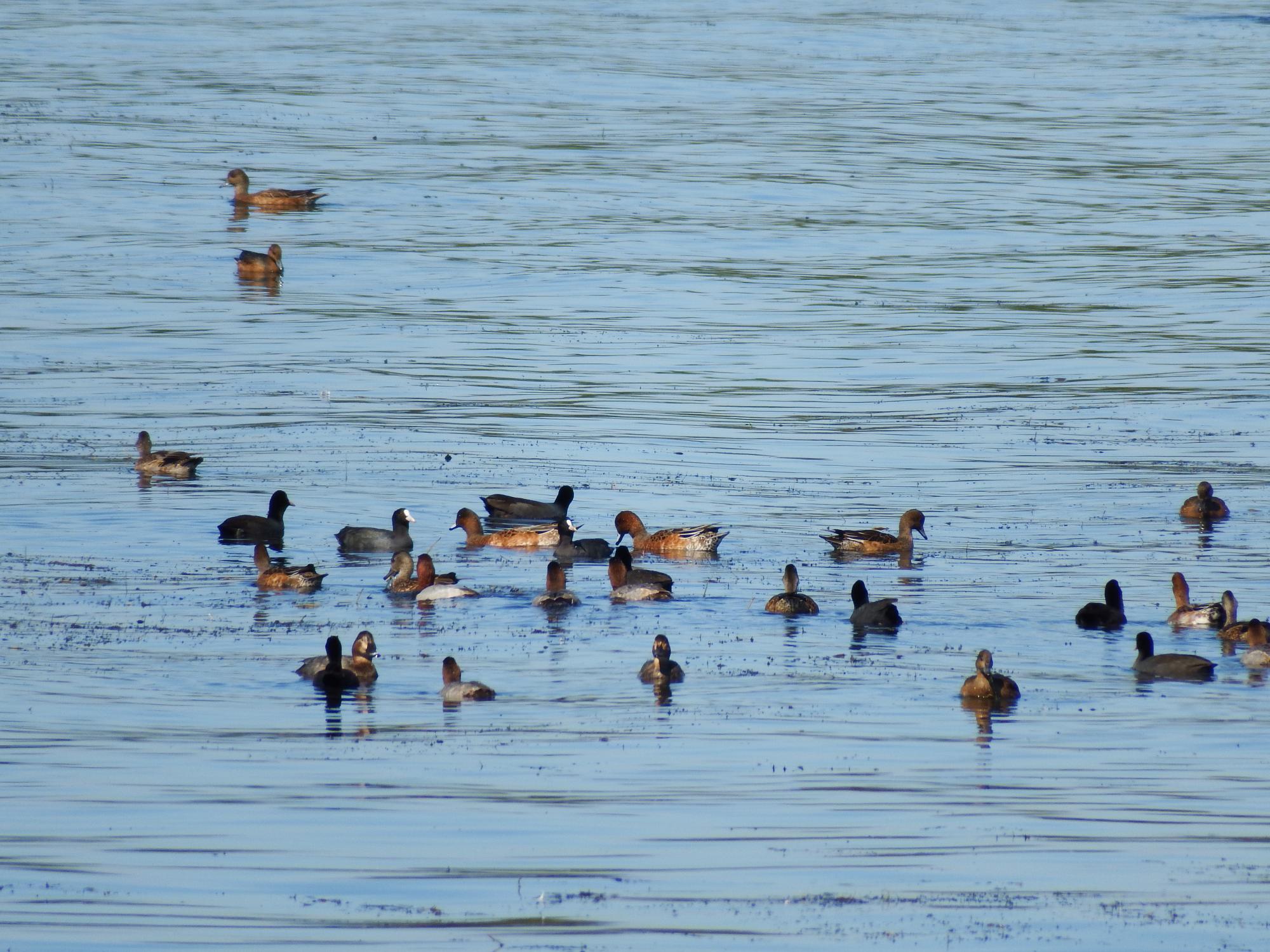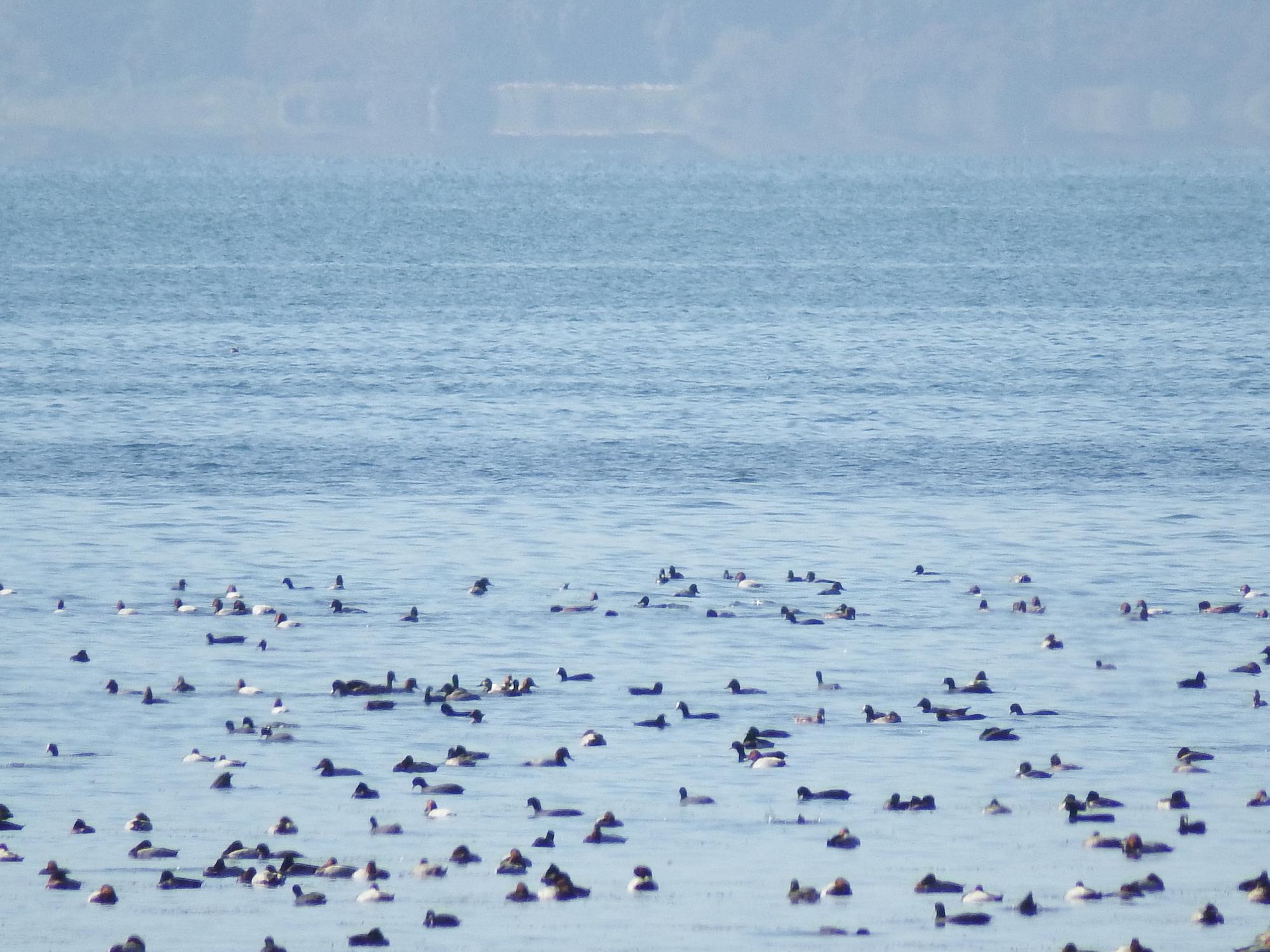 沖の方、ものすごいカモの大群です。ぜひクリック(タップ)して拡大してみてください。殆どヒドリガモとオオバンのようですが、よ~く見るとカンムリカイツブリがいます。探してみてください。