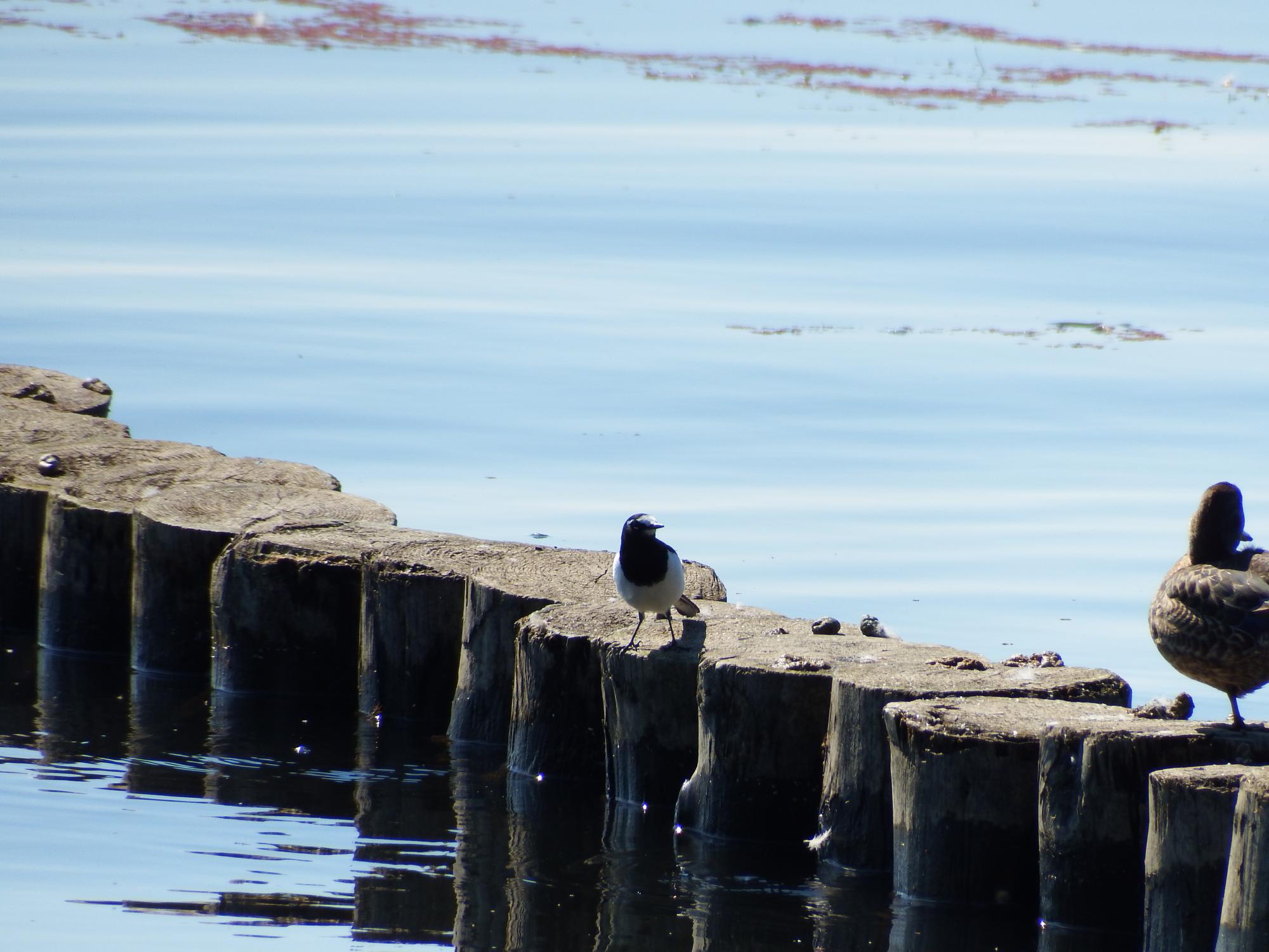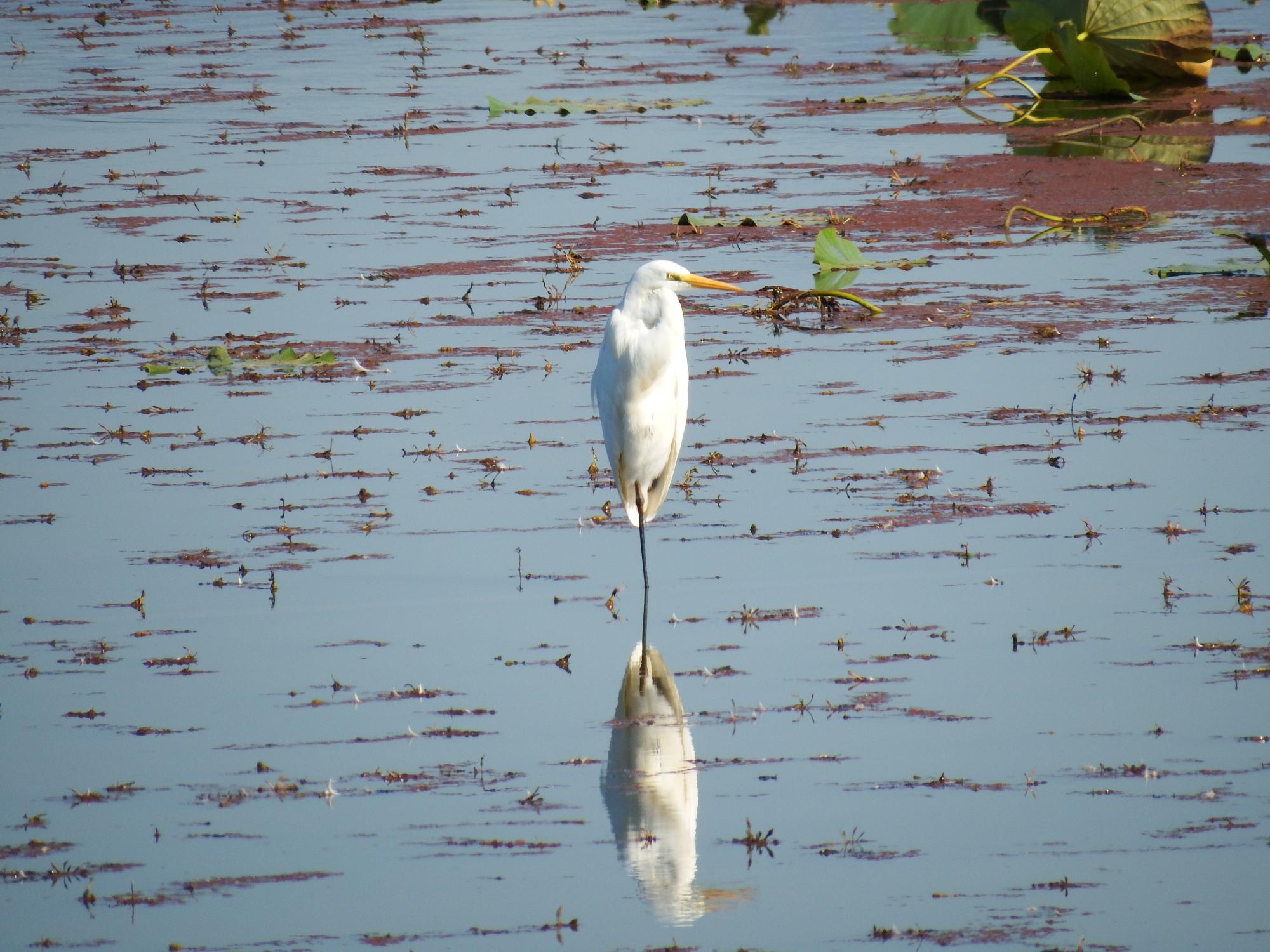 湖岸の内側に池が続いています。一本足でじっとしているアオサギの幼鳥とダイサギ。