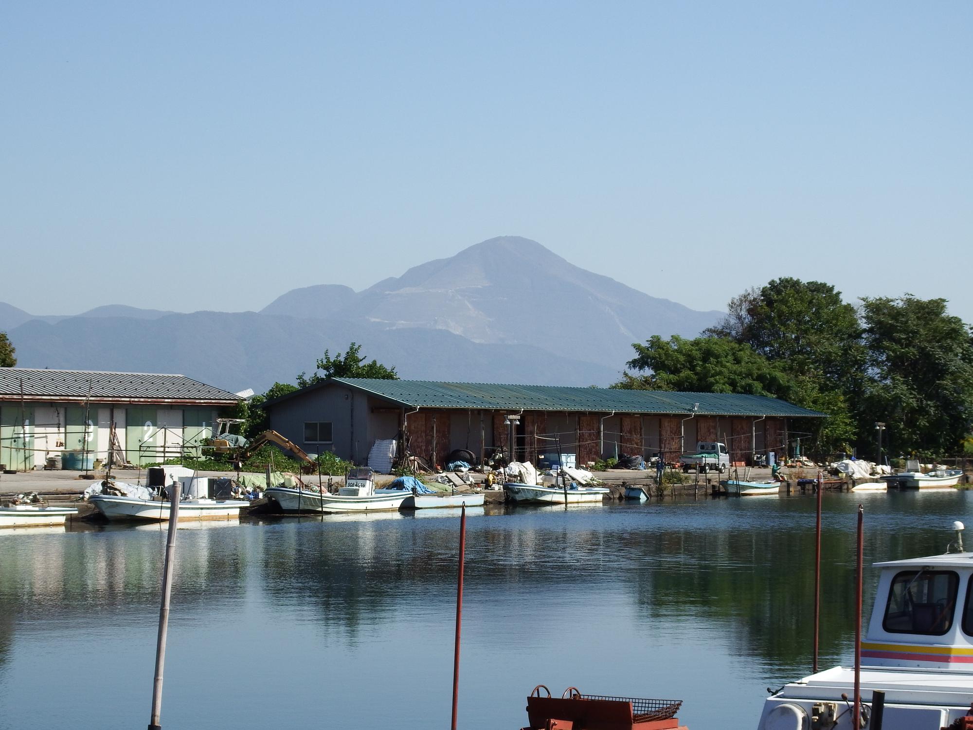 南浜港と端麗な伊吹山。姉川の河口近くを渡ります。織田徳川連合軍vs朝倉浅井連合軍の姉川の合戦の舞台です。