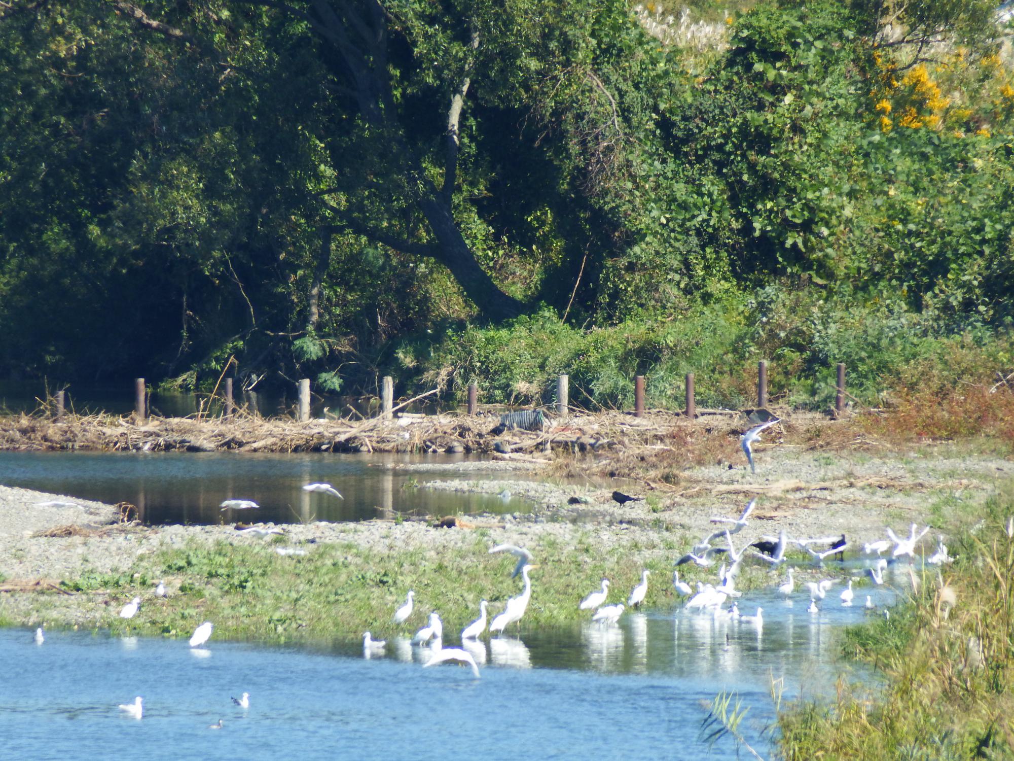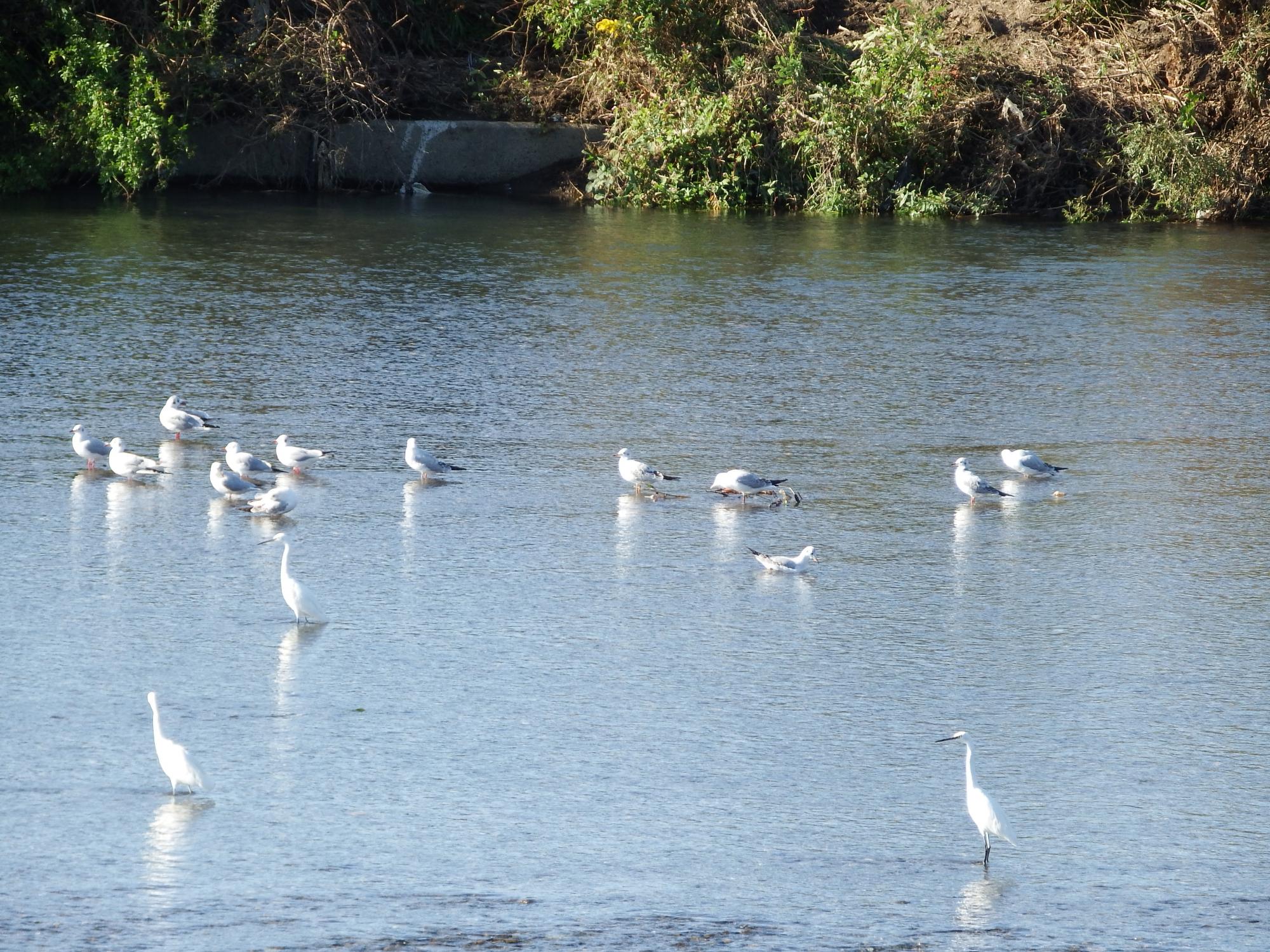 姉川河川敷にコサギの大群、ユリカモメも混じっています。
