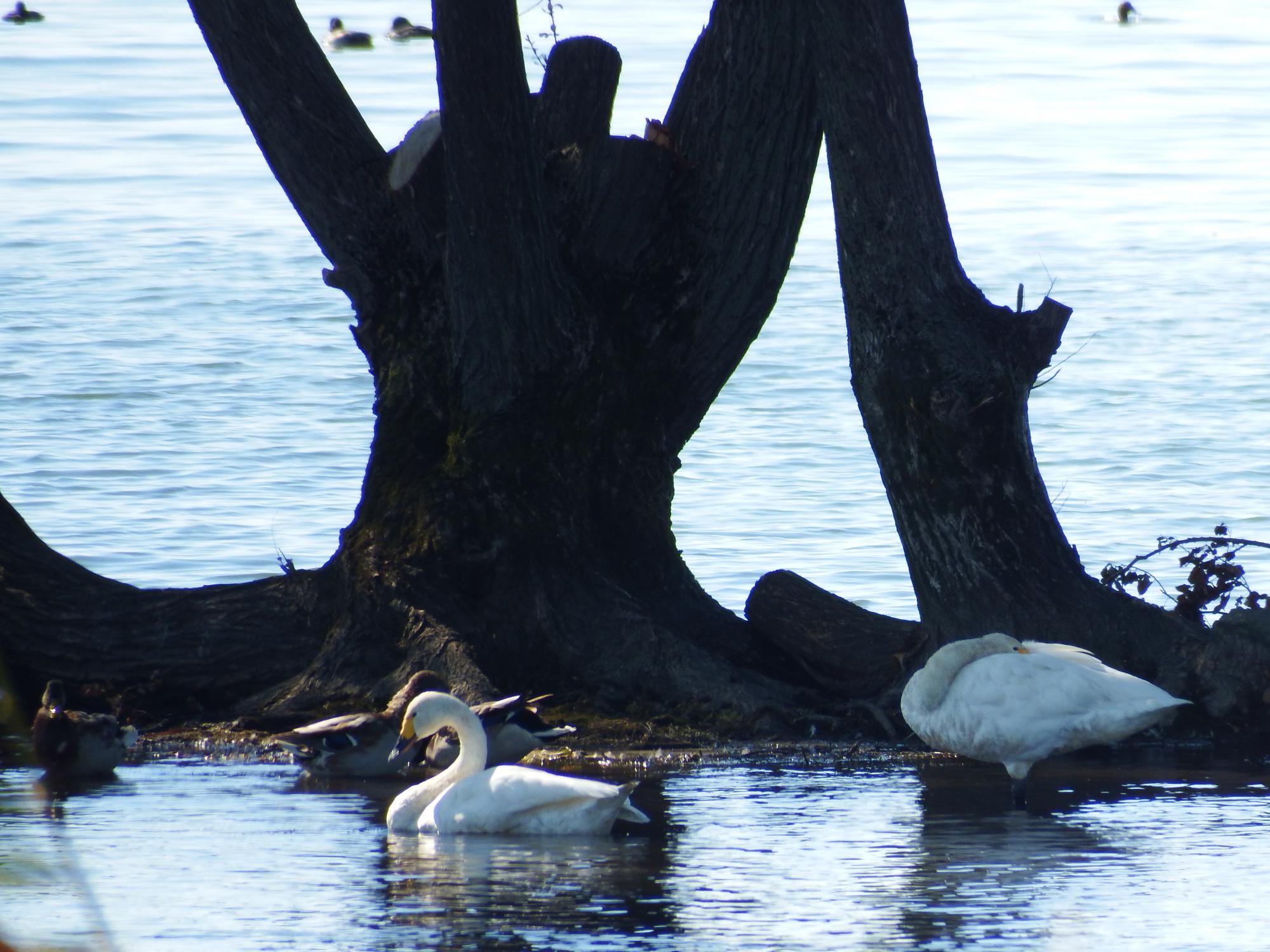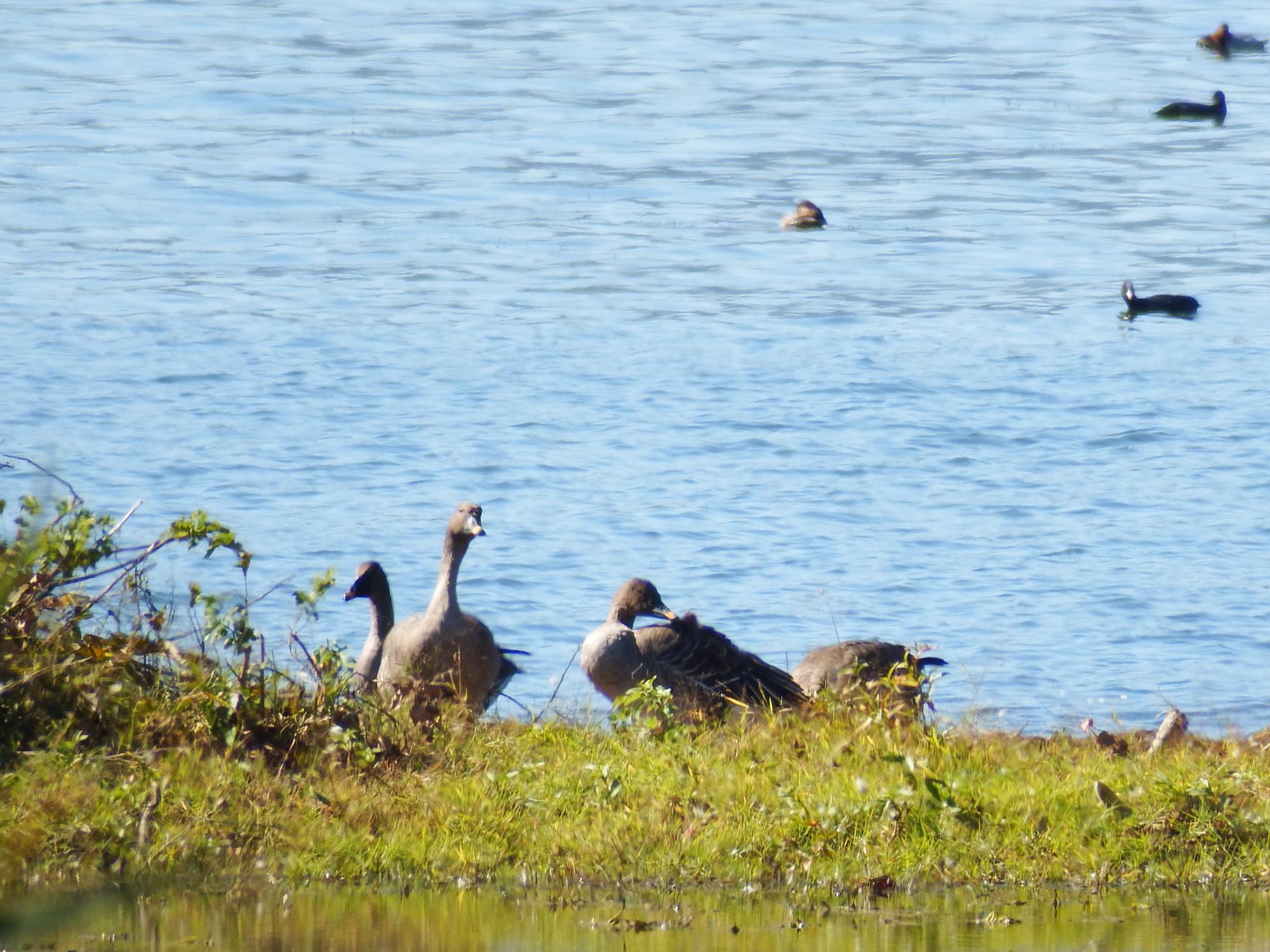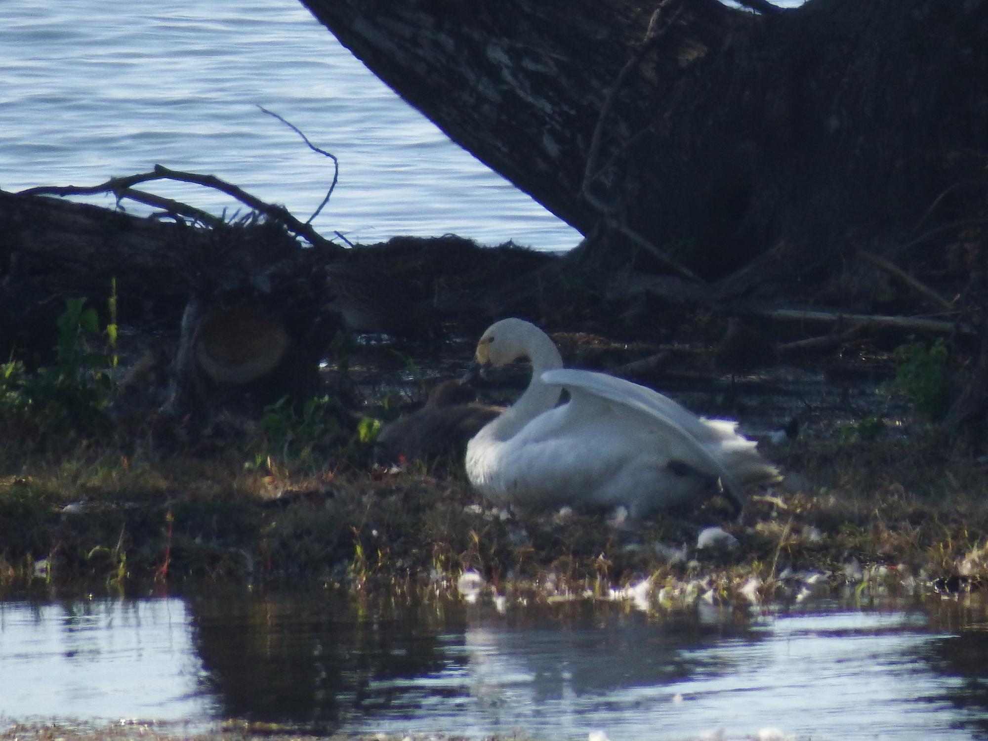 200円の入館料を払って入ると、20台くらいのフィールドスコープが並んでいて、道路と水路を隔てた砂州のようなところにいるコハクチョウとオオヒシクイにレンズ向けられていました。職員の人が丁寧に説明もしてくれるのですが、なぜこの真正面にコハクチョウやオオヒシクイがいるのか、餌付けしているのか、聞き損なってしまいました。