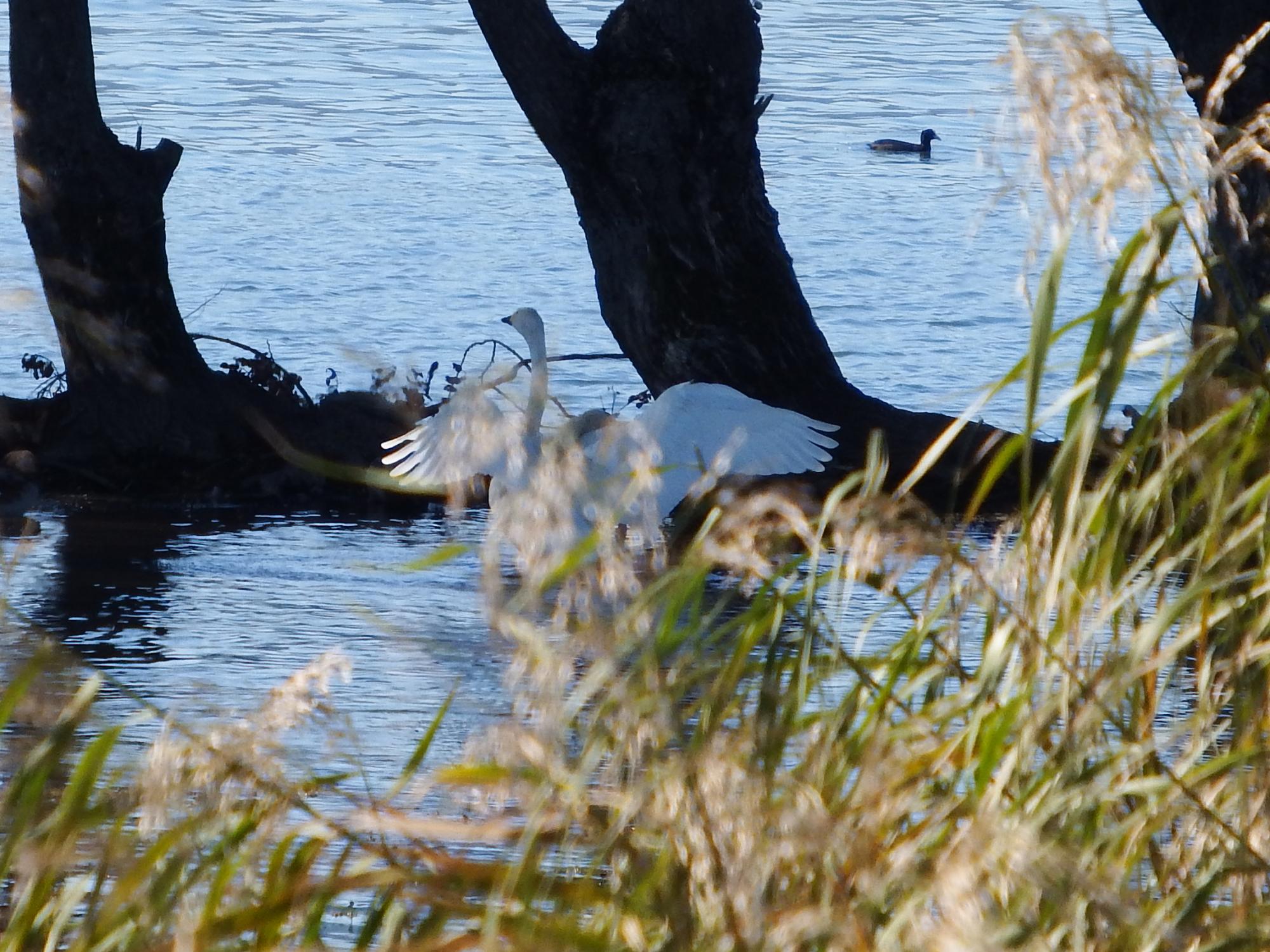 外へでて道路脇の歩道からコハクチョウを撮ってみました。ススキがちょっとジャマでなかなかピントが合ってくれませんがなんとか羽を広げたところが撮れました。