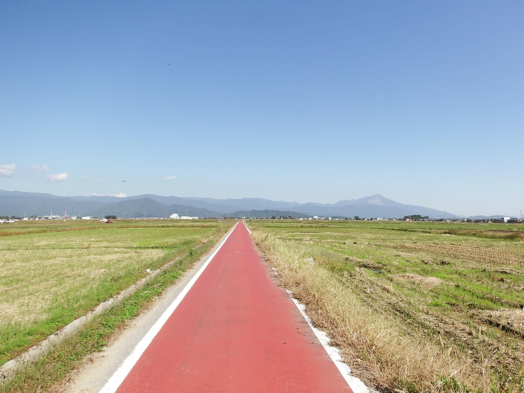 ピーヒョロロが響き渡る湖北の大地、刈り入れの終わった田んぼの中に自転車専用道が真っ直ぐ、思いっきり気持ちのいい場所です。