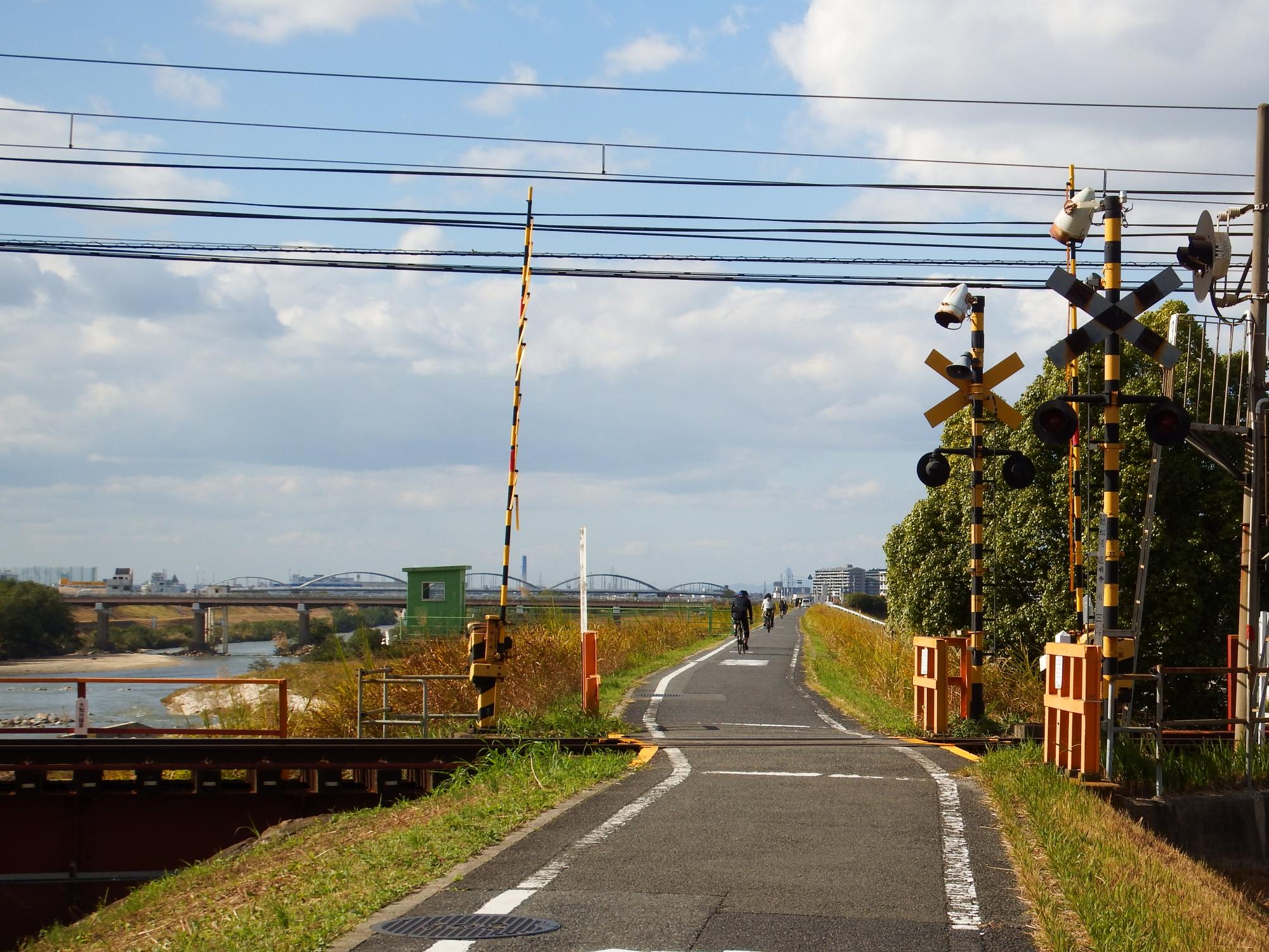 下流の阪堺電車の大和川駅と違うのが、自転車歩行者専用道の踏切で、クルマは土手下でガードをくぐります。