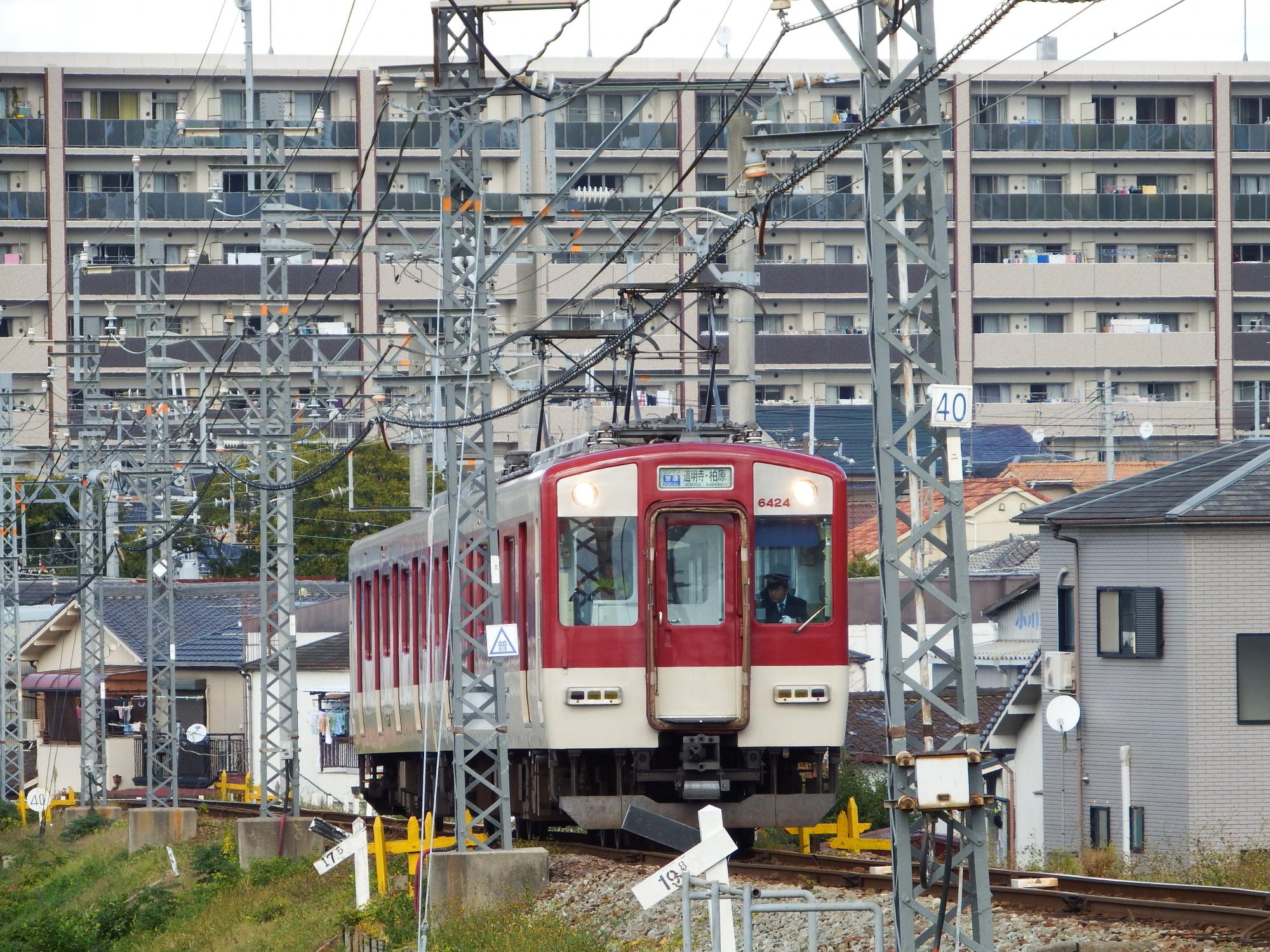 マンションをバックに築堤を登る道明寺行二両編成、都会のローカル線の雰囲気がたっぷりで、自分のお気に入りの一枚になりました。