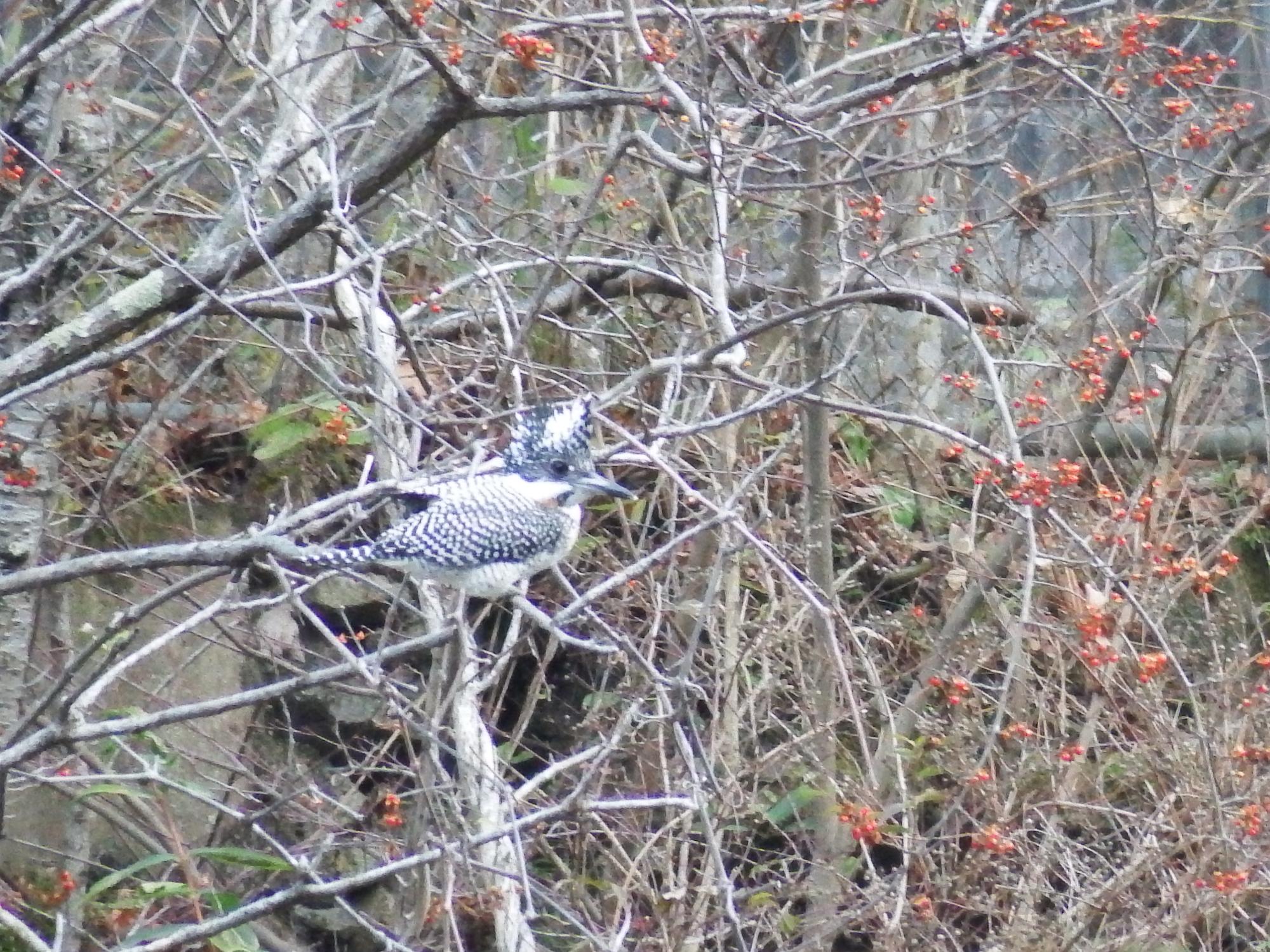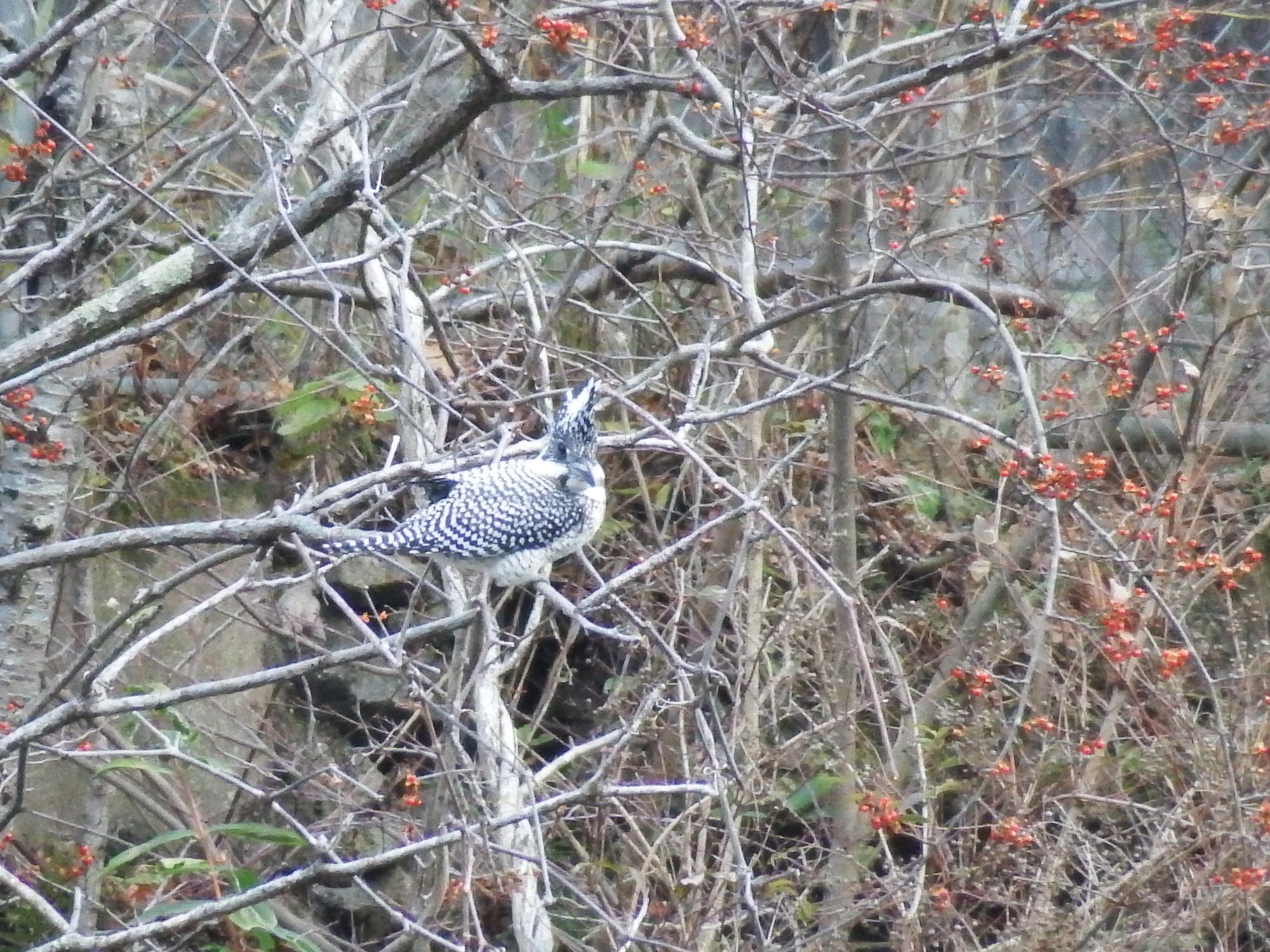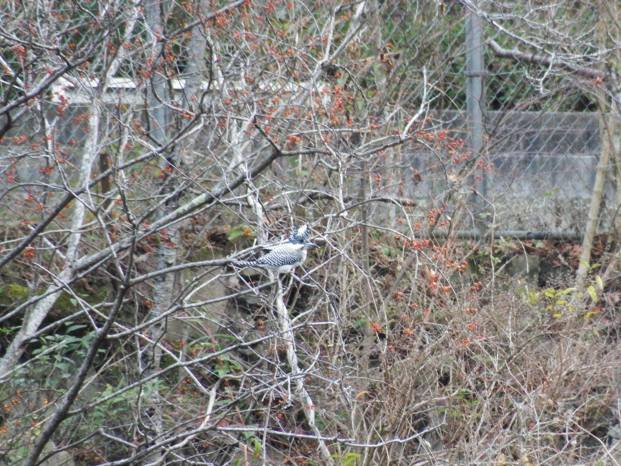 聞いていた8時半に駅近くへ戻ってきたら、川の上を白い鳥がスーッと飛んできました。ヤマセミです。情報通りにやってきてビックリ。