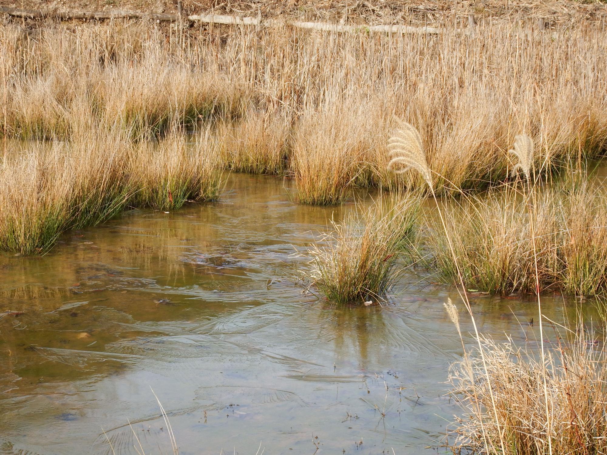 公園の管理者と思われるおじさんいわく、今朝はちょうど0°Cだったそうです。田んぼが凍っていました。
