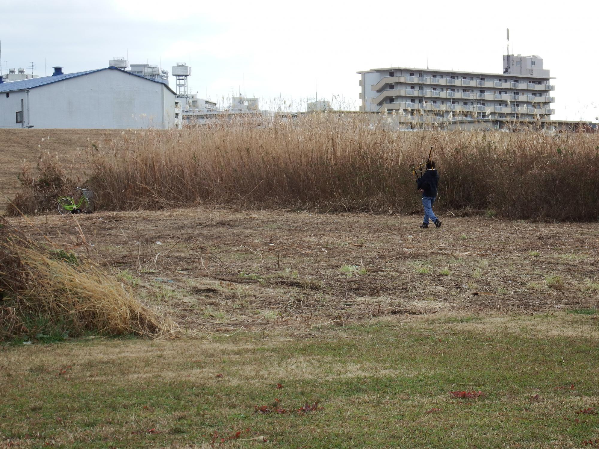 葦原を刈ったところで練習中、ちょっと失礼して後ろ姿を撮らせてもらいました。淀川の河川敷がスコットランドみたいです。