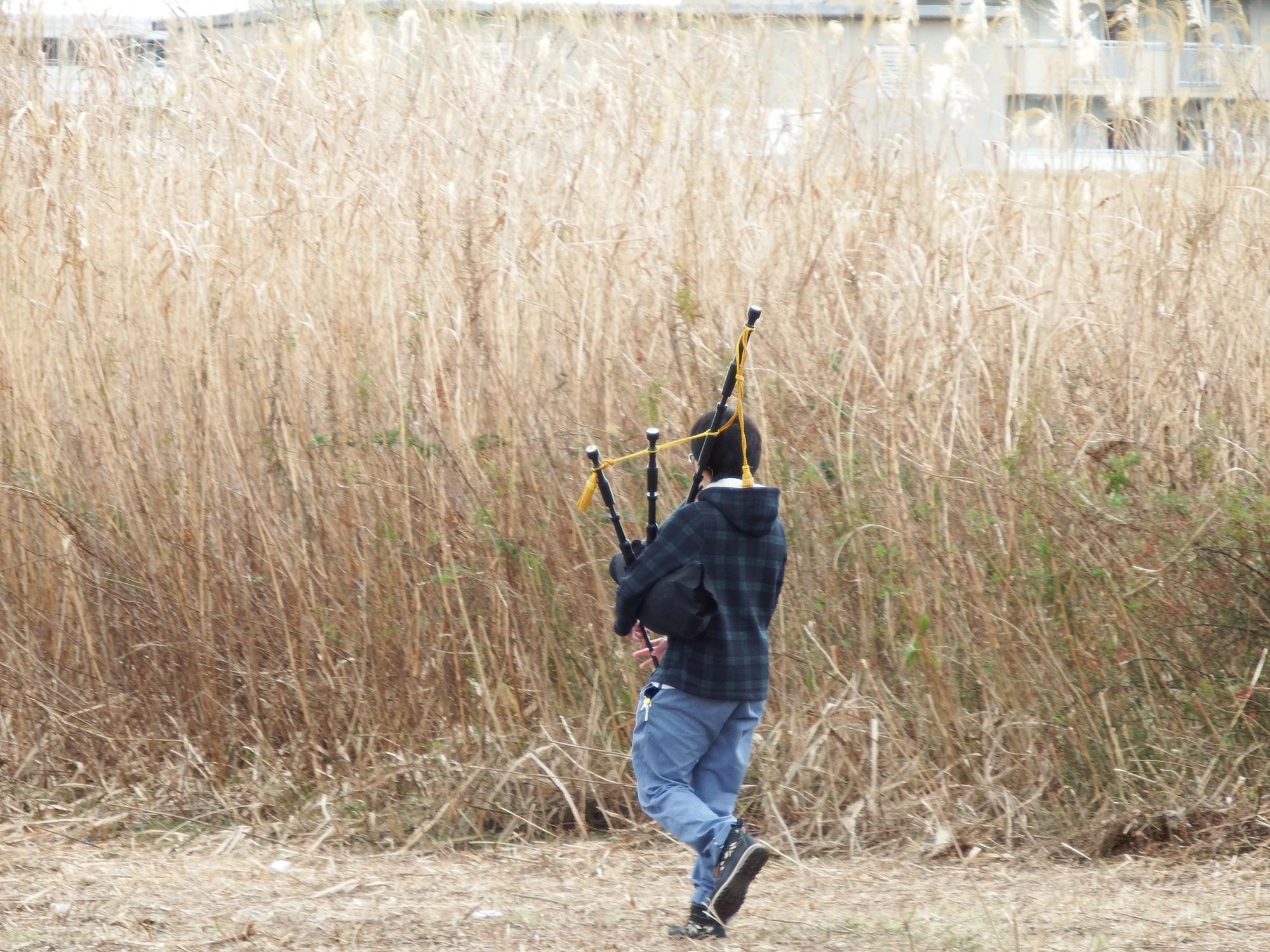 風に乗ってバグパイプの音が聞こえてきました。河川敷でいろんな楽器の練習をしているのはよく見かけます。トラッペット、トロンボーン、チューバとか金管が多く、サンバのバンドがいたりもしますが、バグパイプは初めてです。