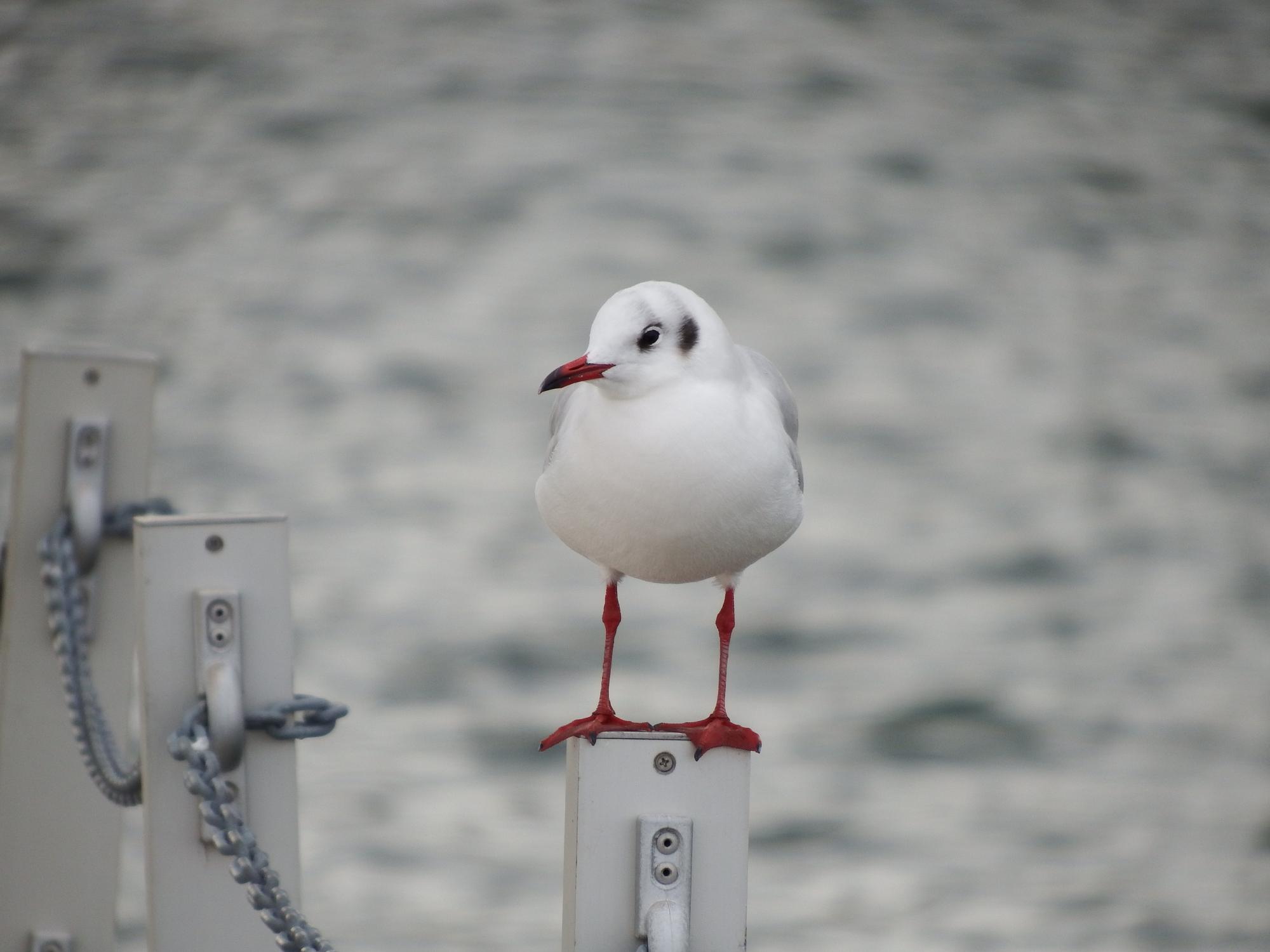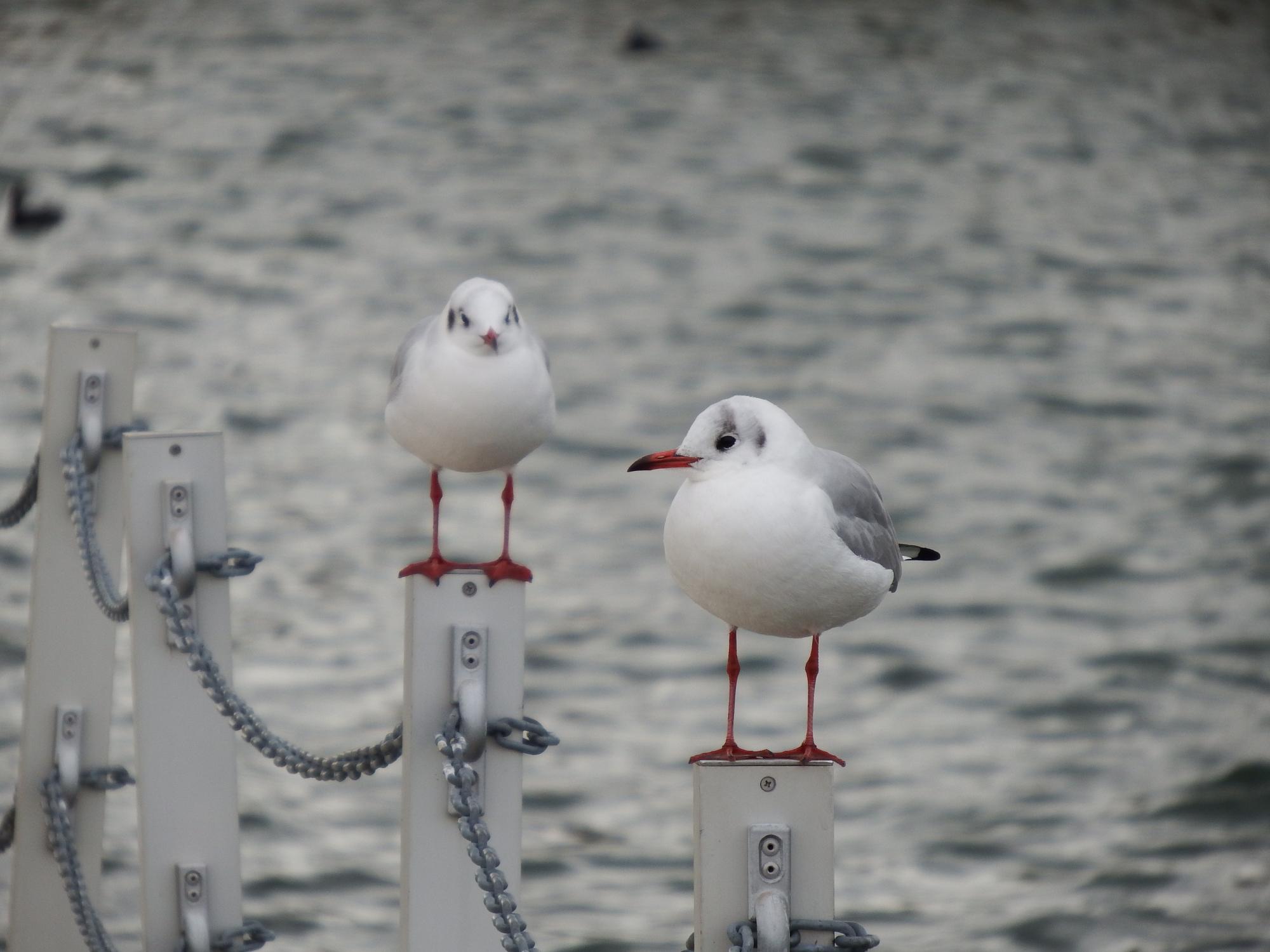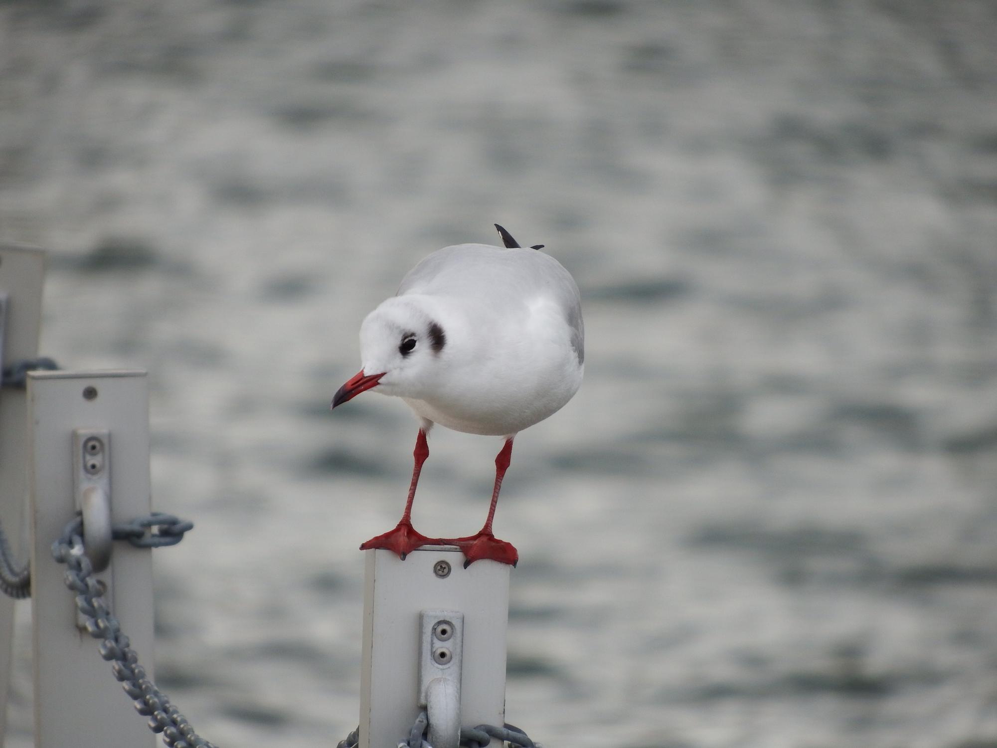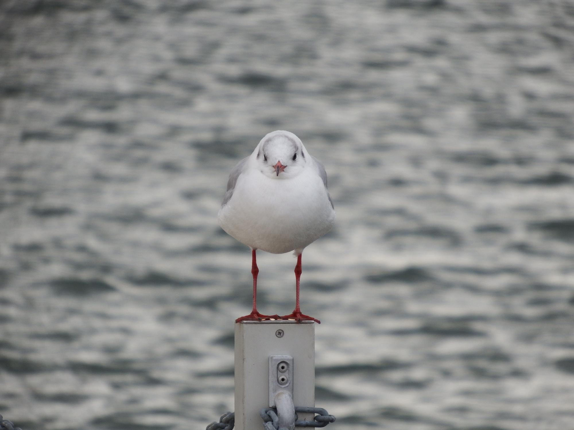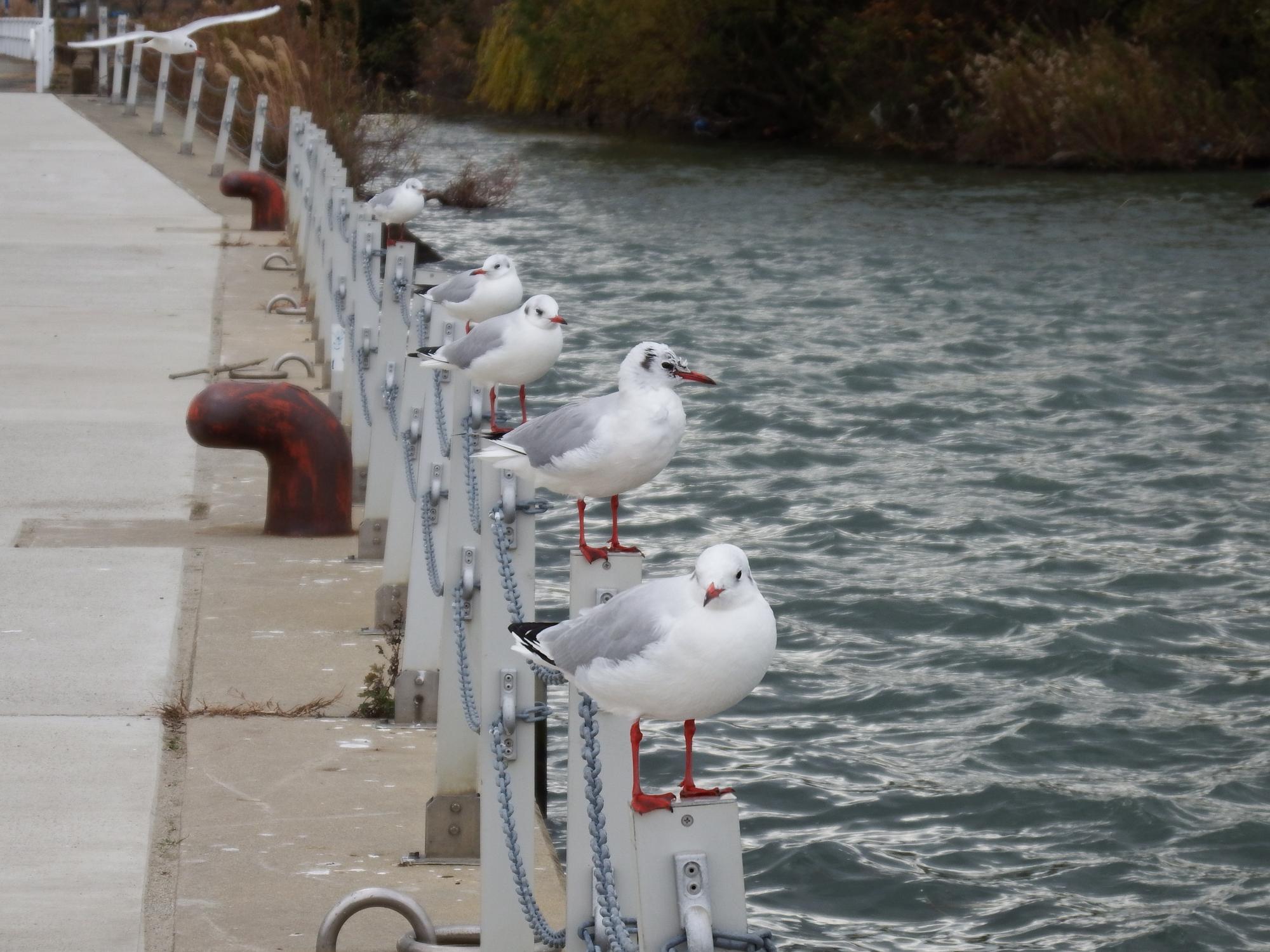 船着場のユリカモメ。遠い昔話ですが、スコットランドのお隣、ウェールズでのこと、海辺の町を歩いていて、上空のカモメのフンが自分の頭を直撃したことを思い出しました。