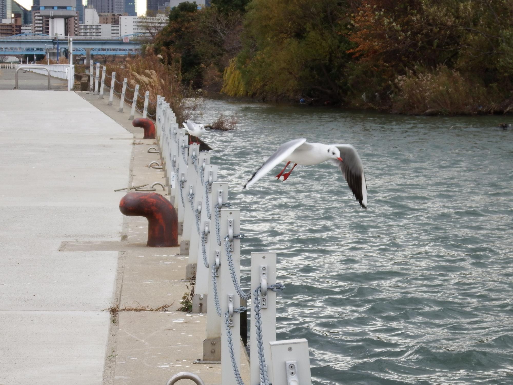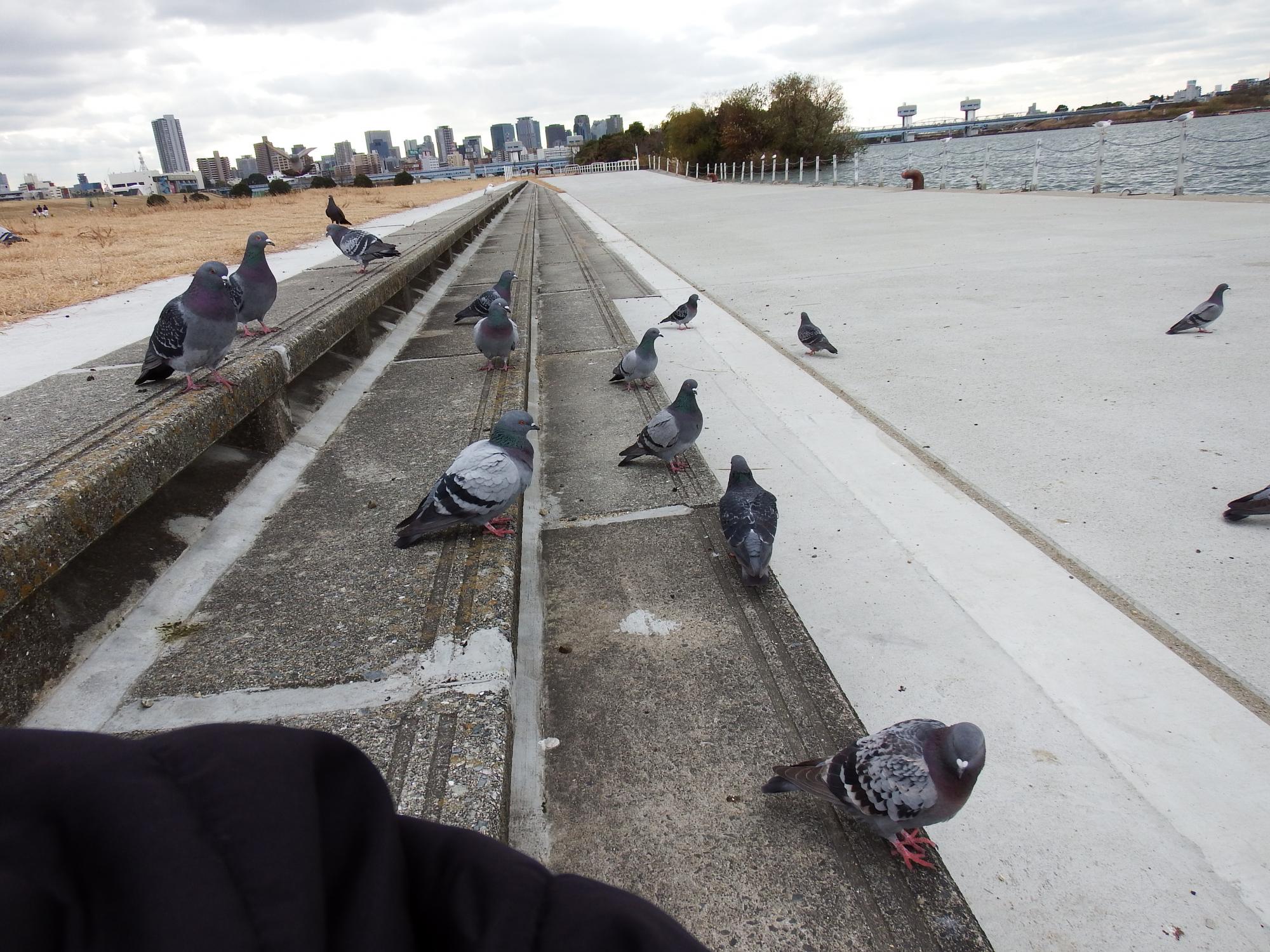 じっくりカモメさんたちを眺めようと階段に腰を下ろしたら、バタバタバタとハトが自分に向かってきました。どうやら、ここでエサをあげる人がいるようで、ハトたちに間違われたようです。