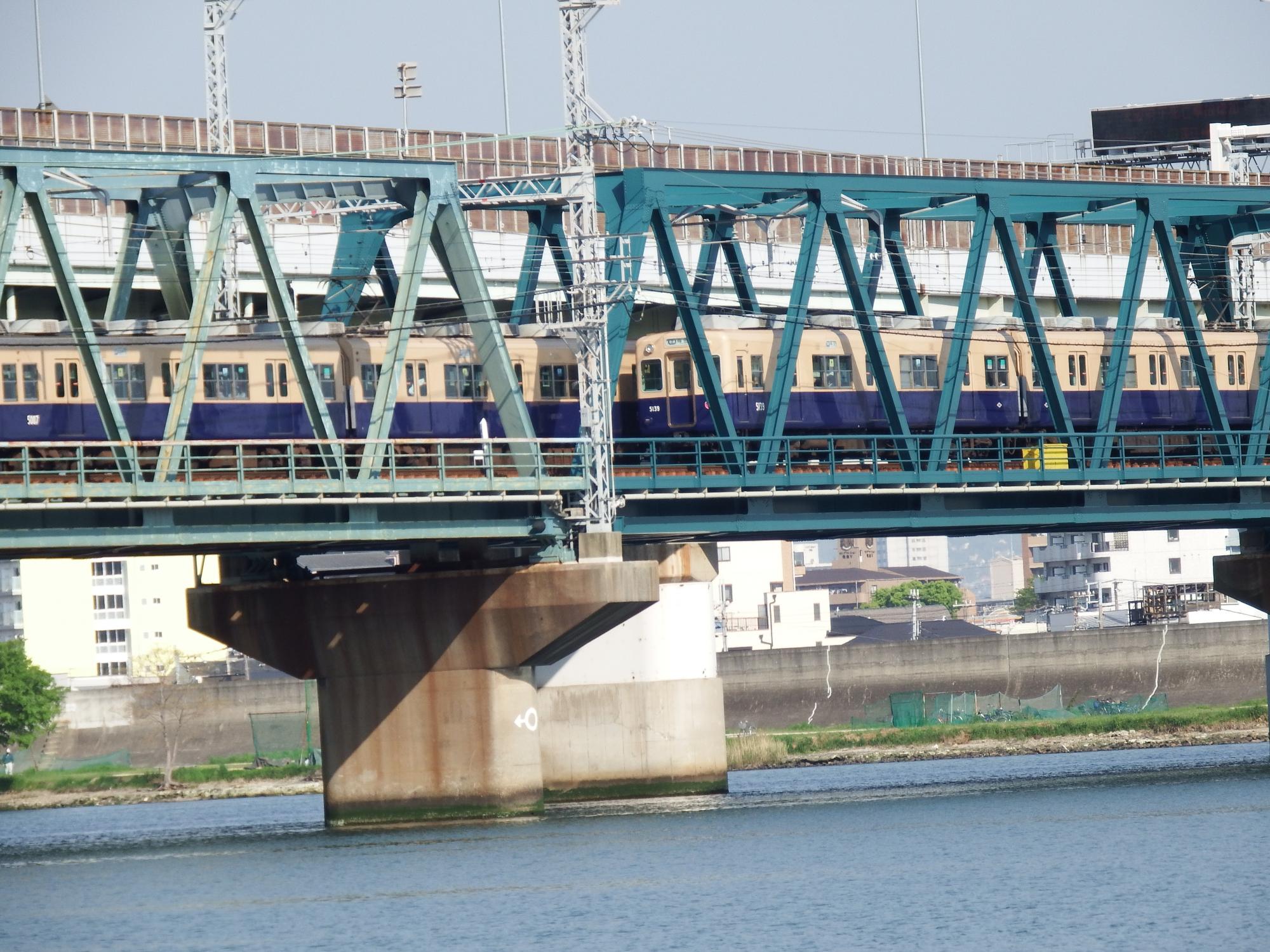 今朝の海老江干潟はここまで。阪神5000系が淀川鉄橋上ですれ違い。