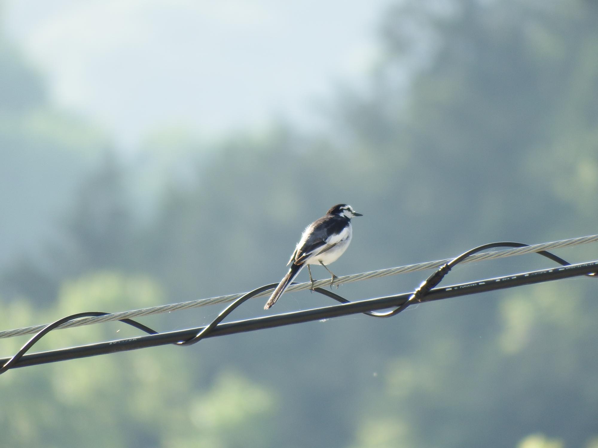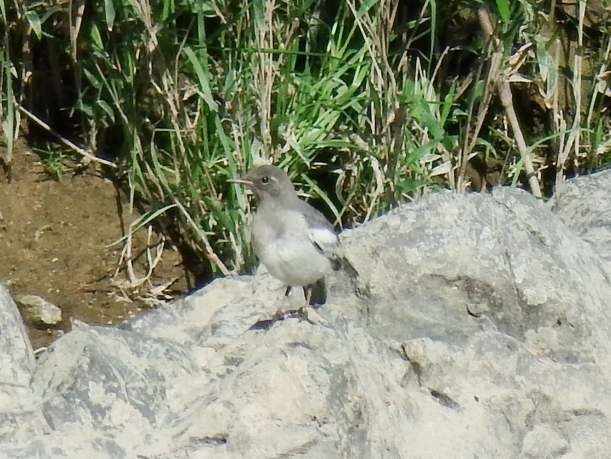 いつもこの電線にハクセキレイが止まっています。ん?河原に見たことのない鳥、ハクセキレイの幼鳥のようです。