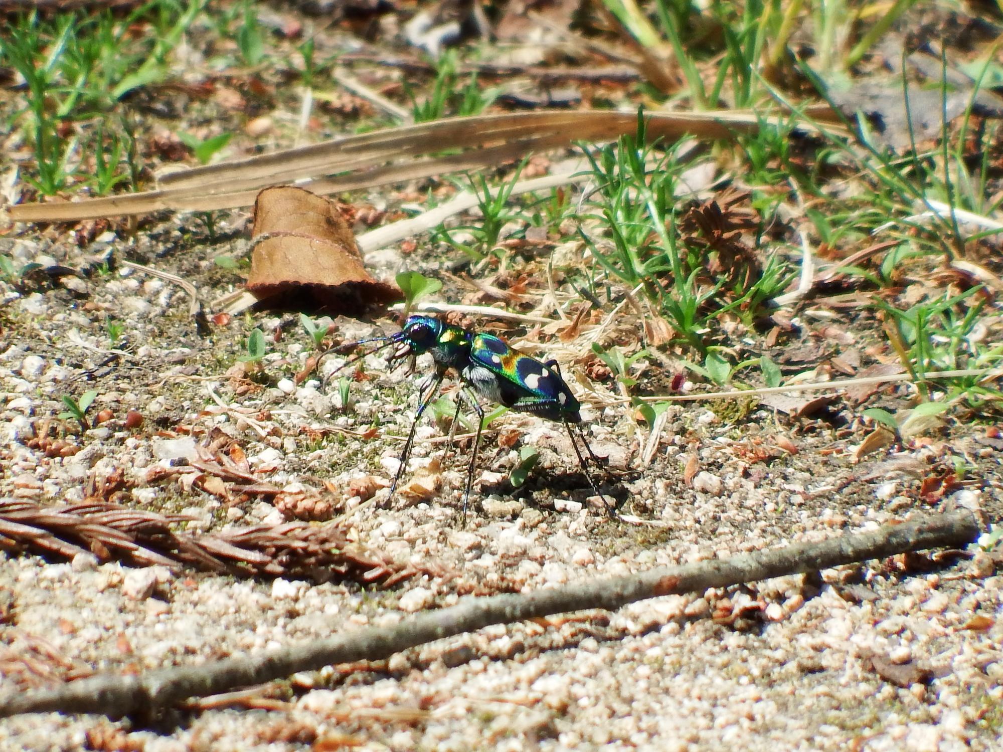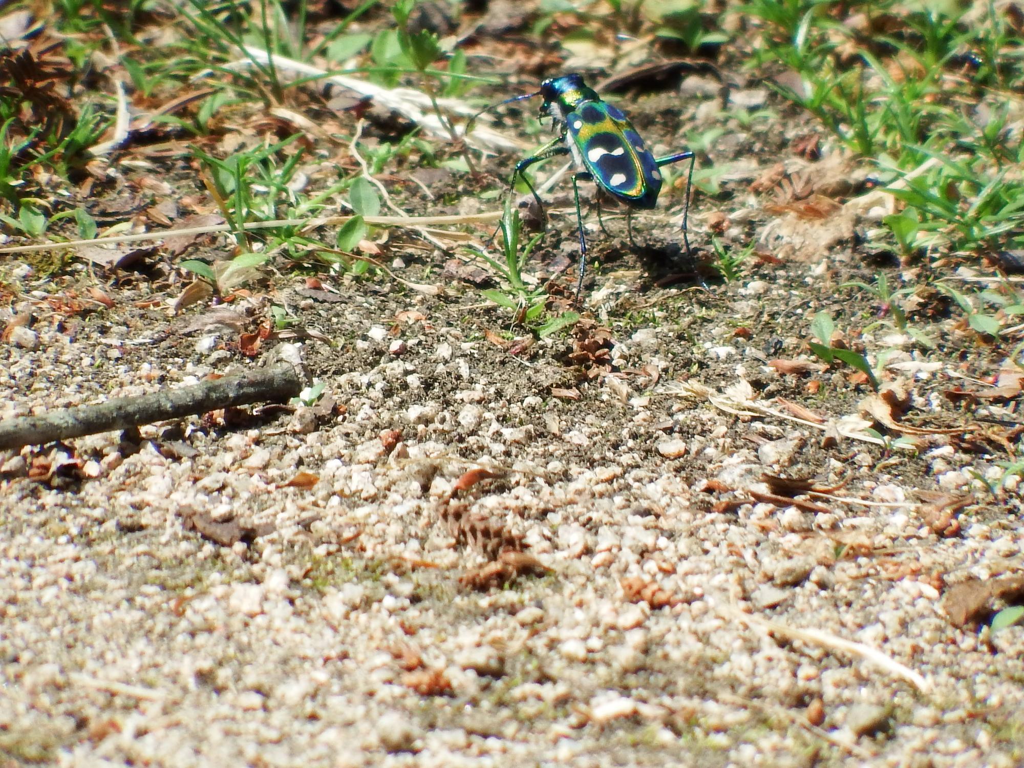 ずいぶんカラフルなヤツがいました。ハンミョウです。何度も後を振り返るのでミチオシエとも呼ばれるそうです。