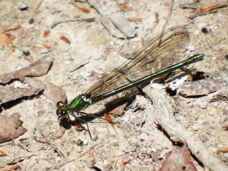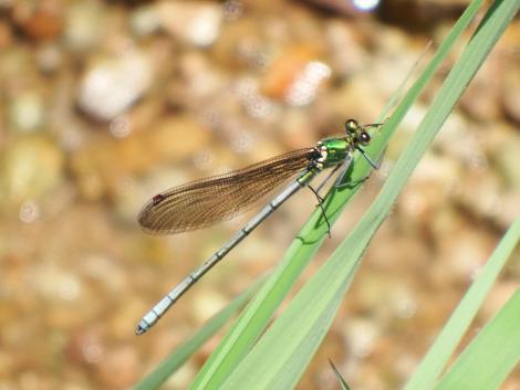 キレイなメタリックのブルーグリーンのボディ、やはりアオイトトンボではないかと思うのですが、未解決です。(6/1追記:ニホンカワトンボのようです。)