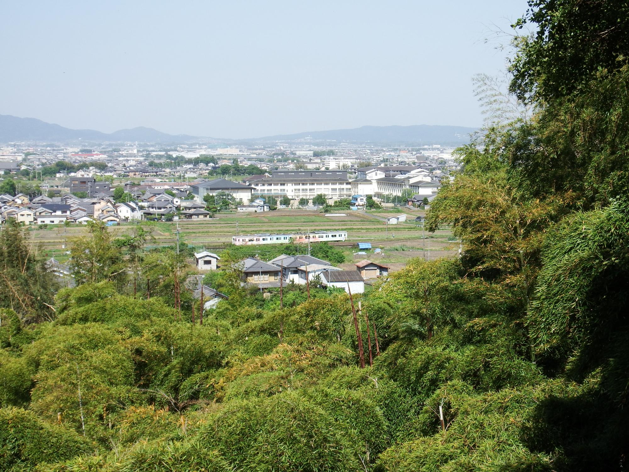 大神神社(三輪明神)末社のひとつ、久延彦(くえひこ)神社からの眺めです。ちょうど桜井線の105系電車が通りすぎて行きました。