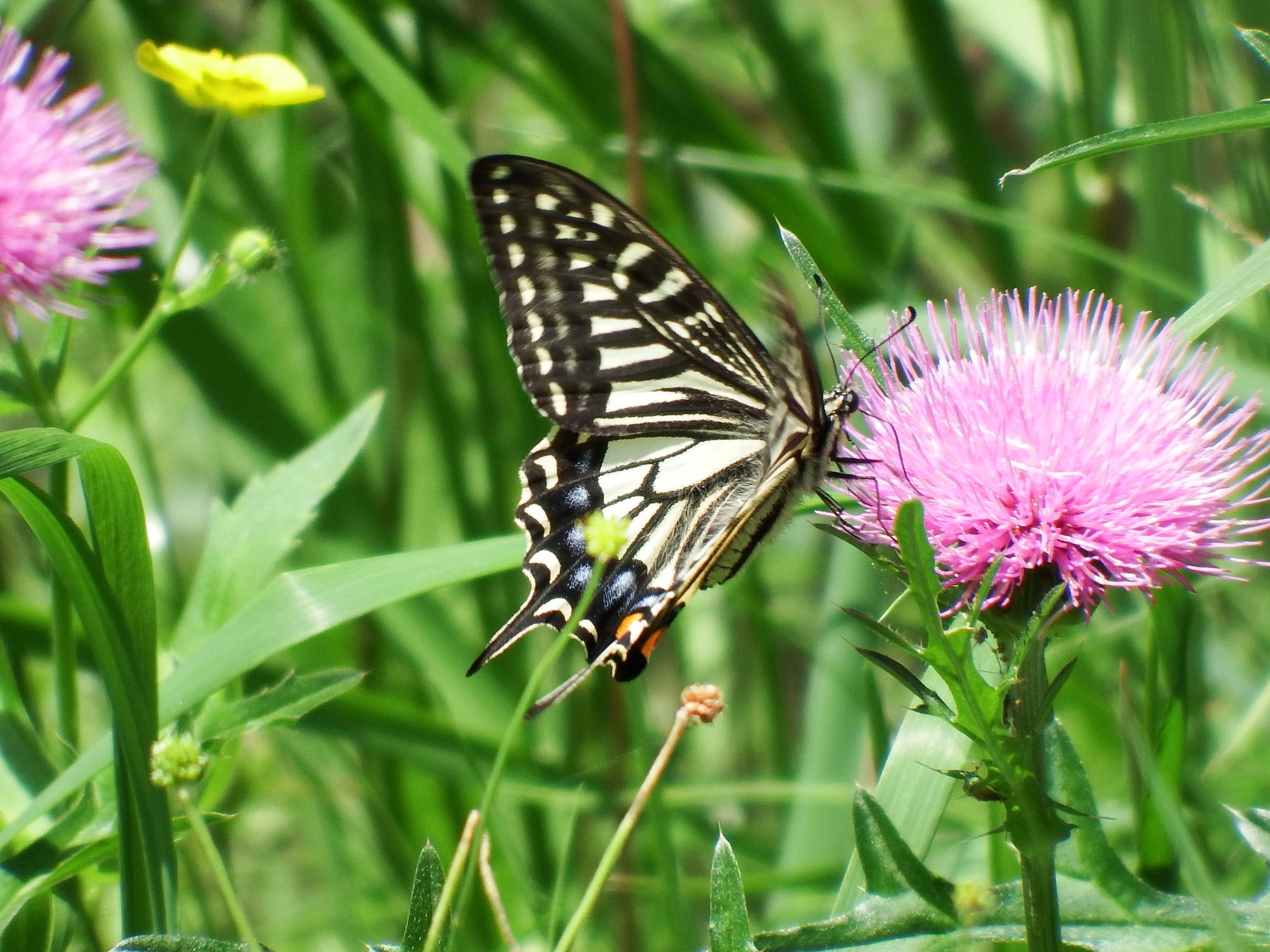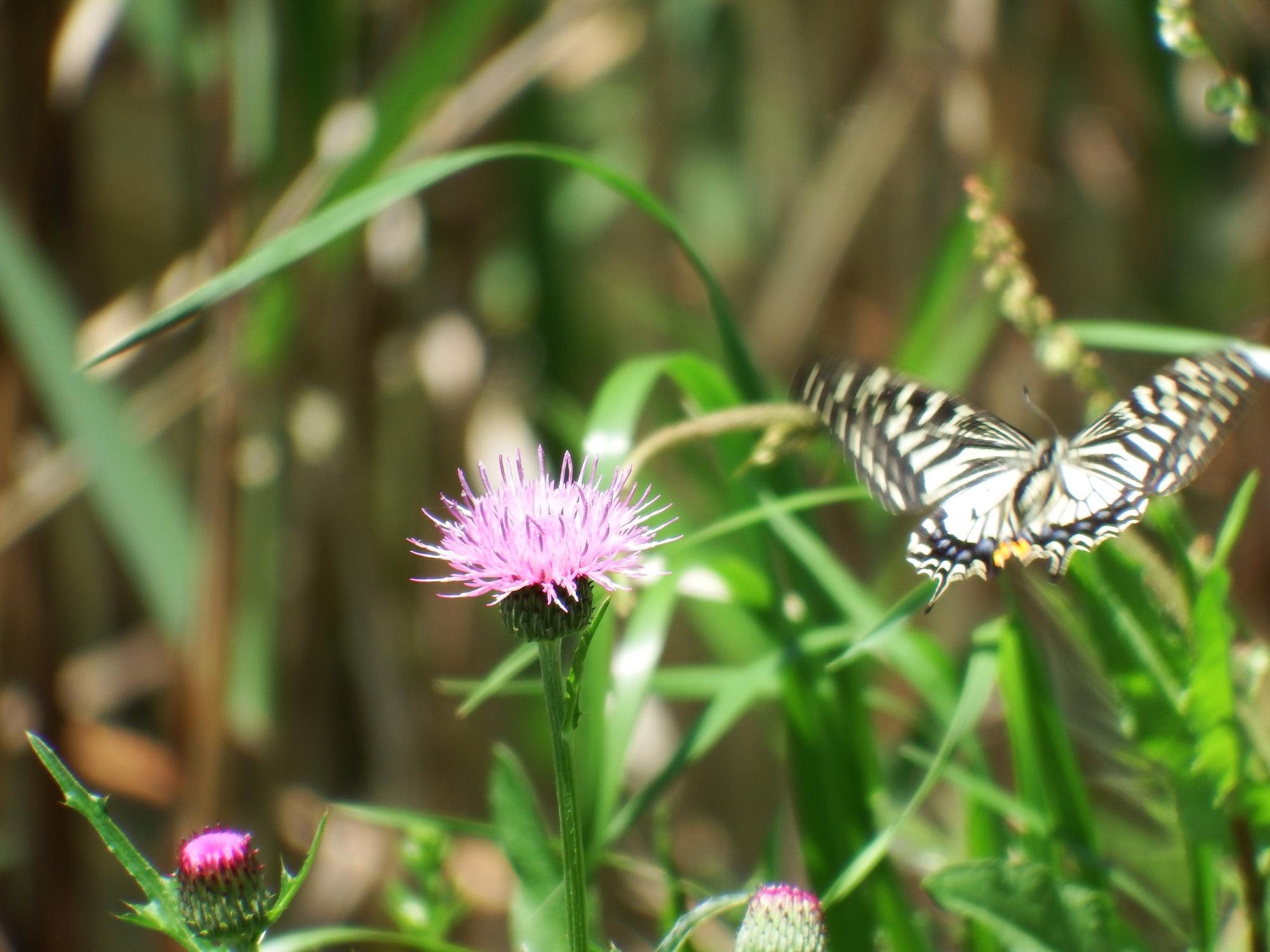 景行天皇陵のお堀のナミアゲハ。止まってアザミの蜜を吸っているのではなく飛びながらです。