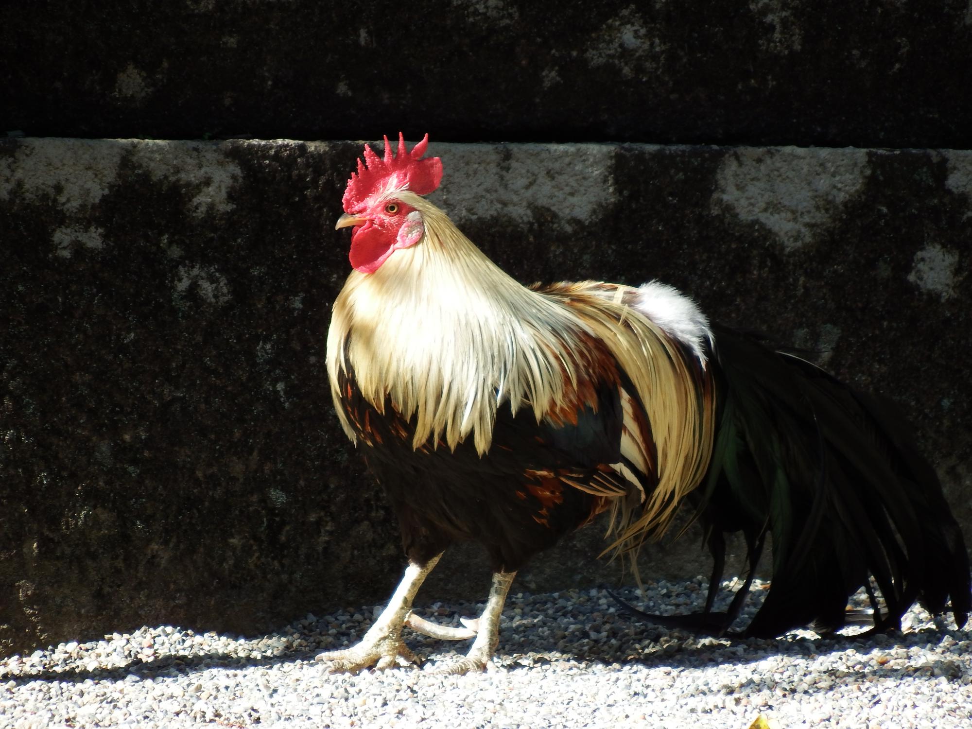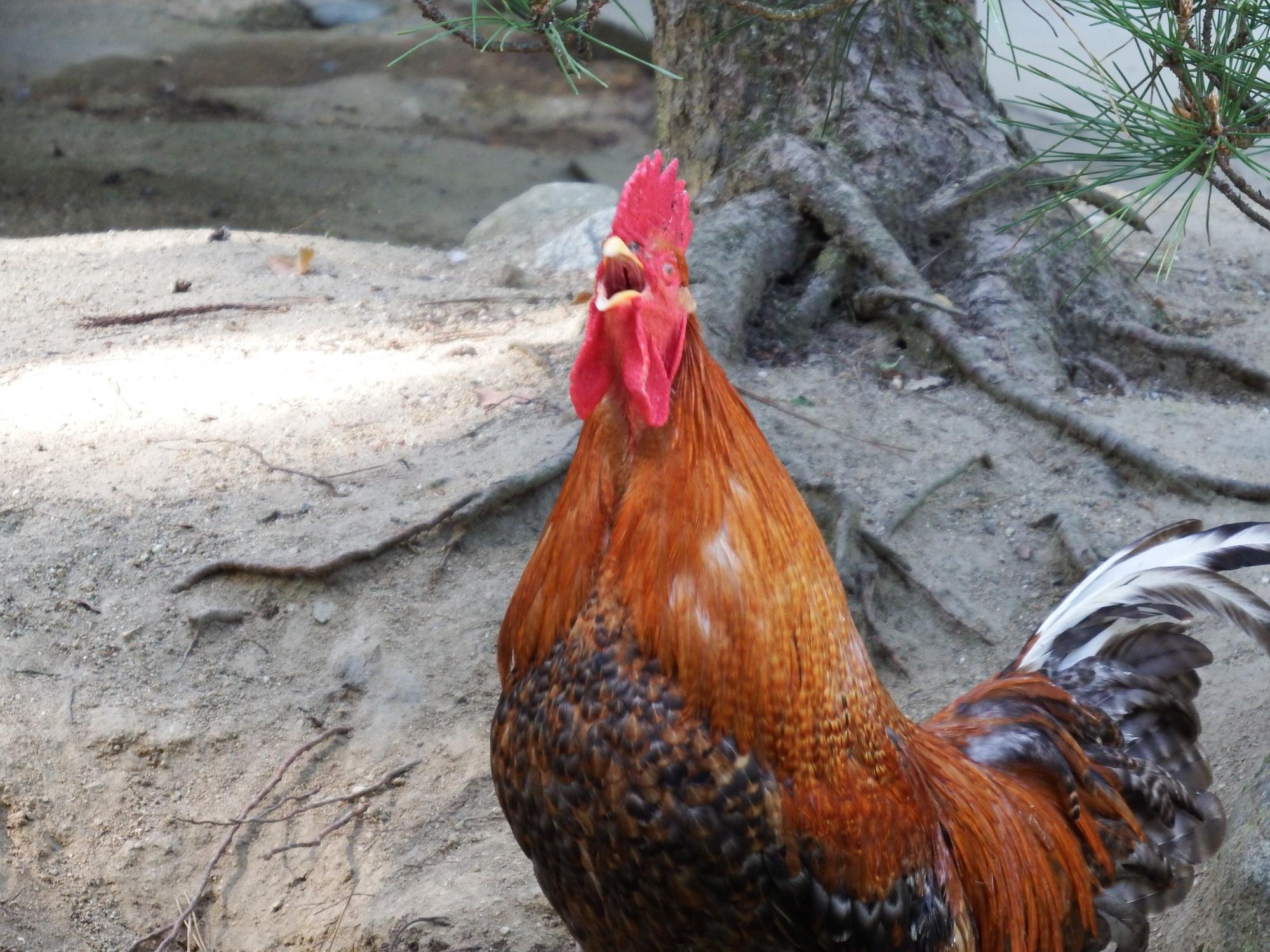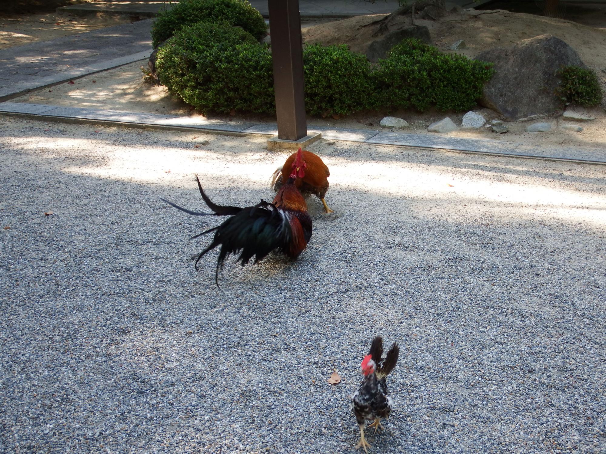 東天紅がケンカを始めて、そそくさと逃げ出す碁石チャボと、雄叫びをあげる東天紅。