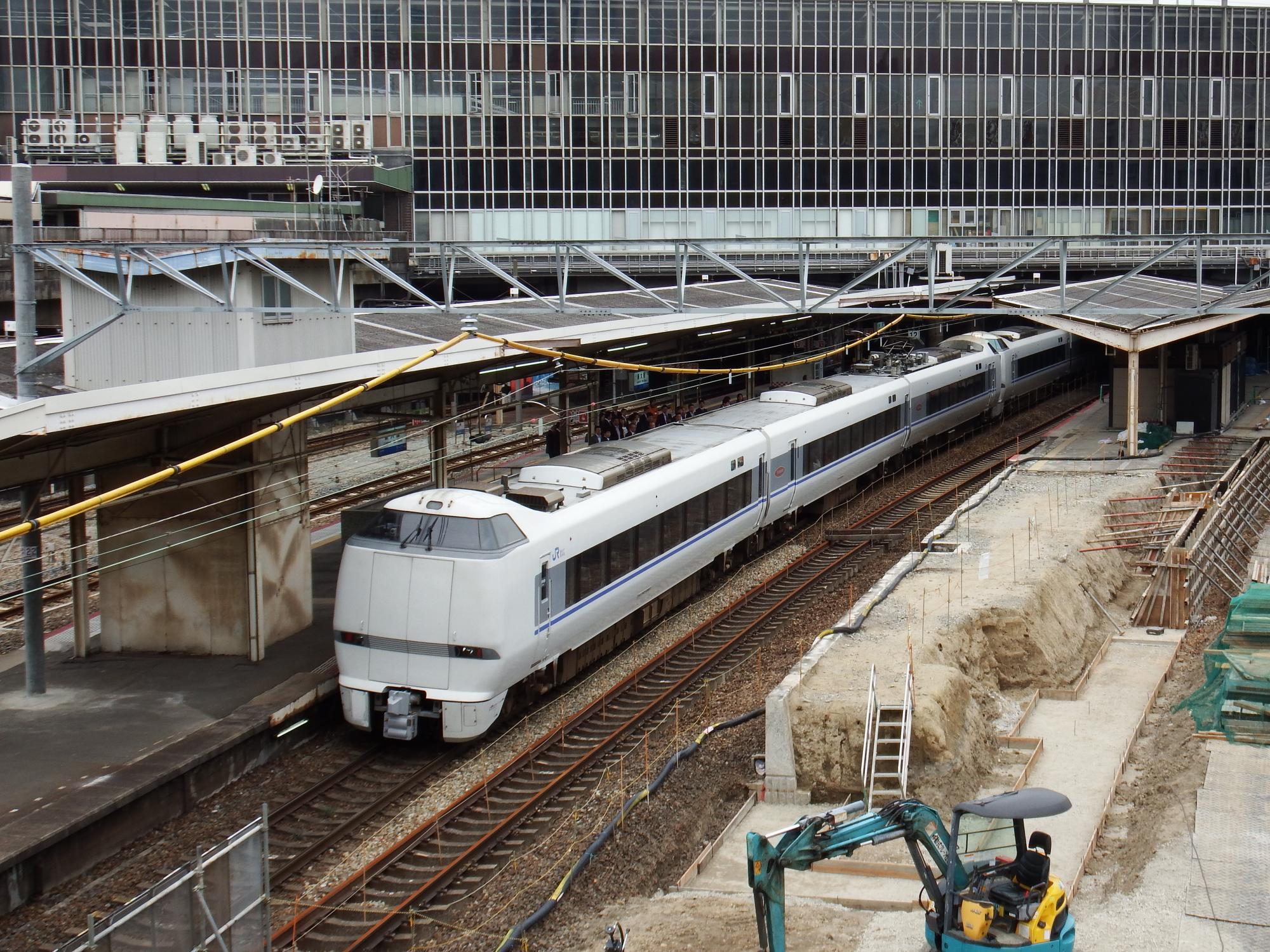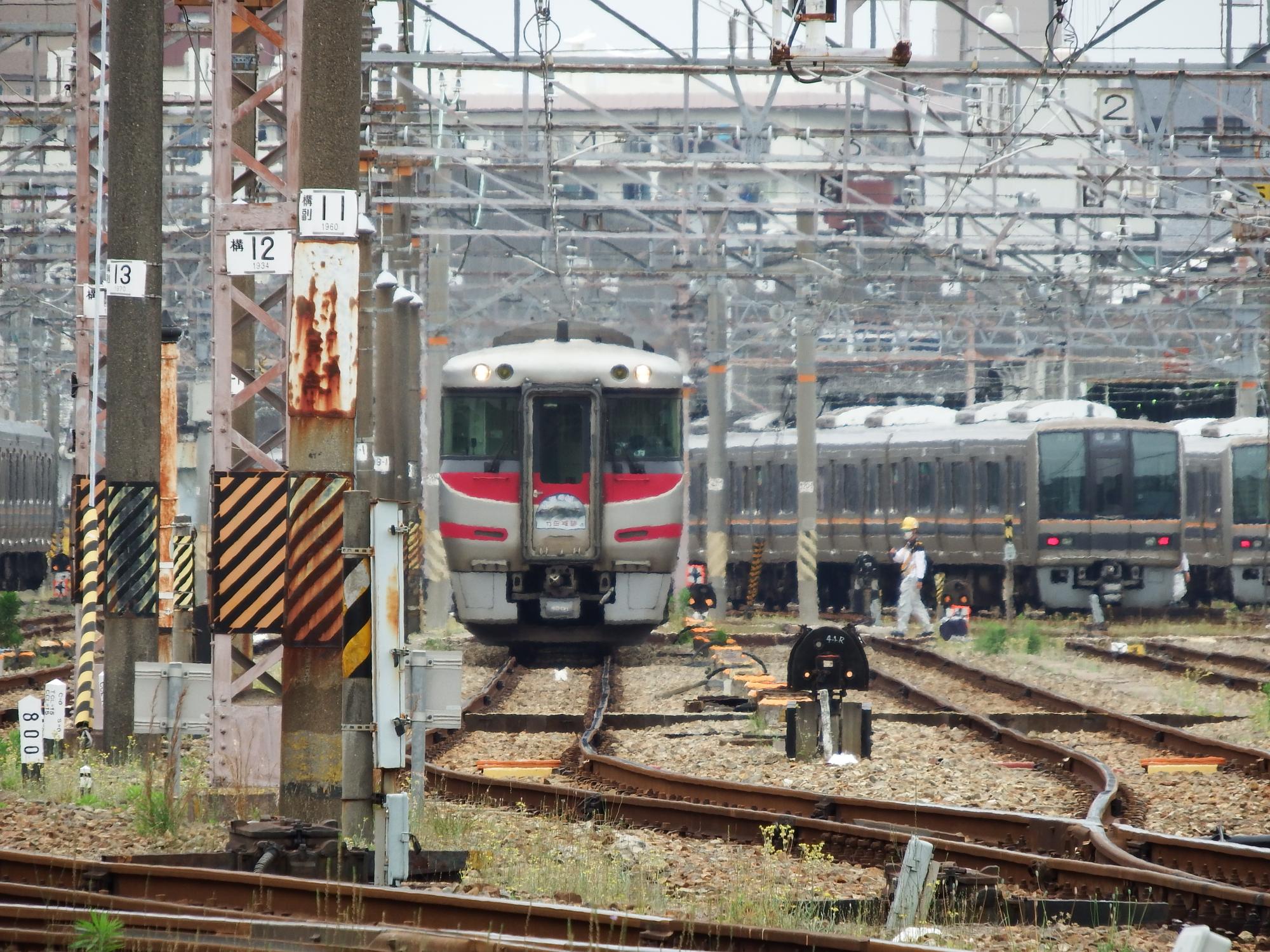221系の上を行くのは宮原操車場から出庫する223系です。12番線に金沢行きサンダーバードが入線。