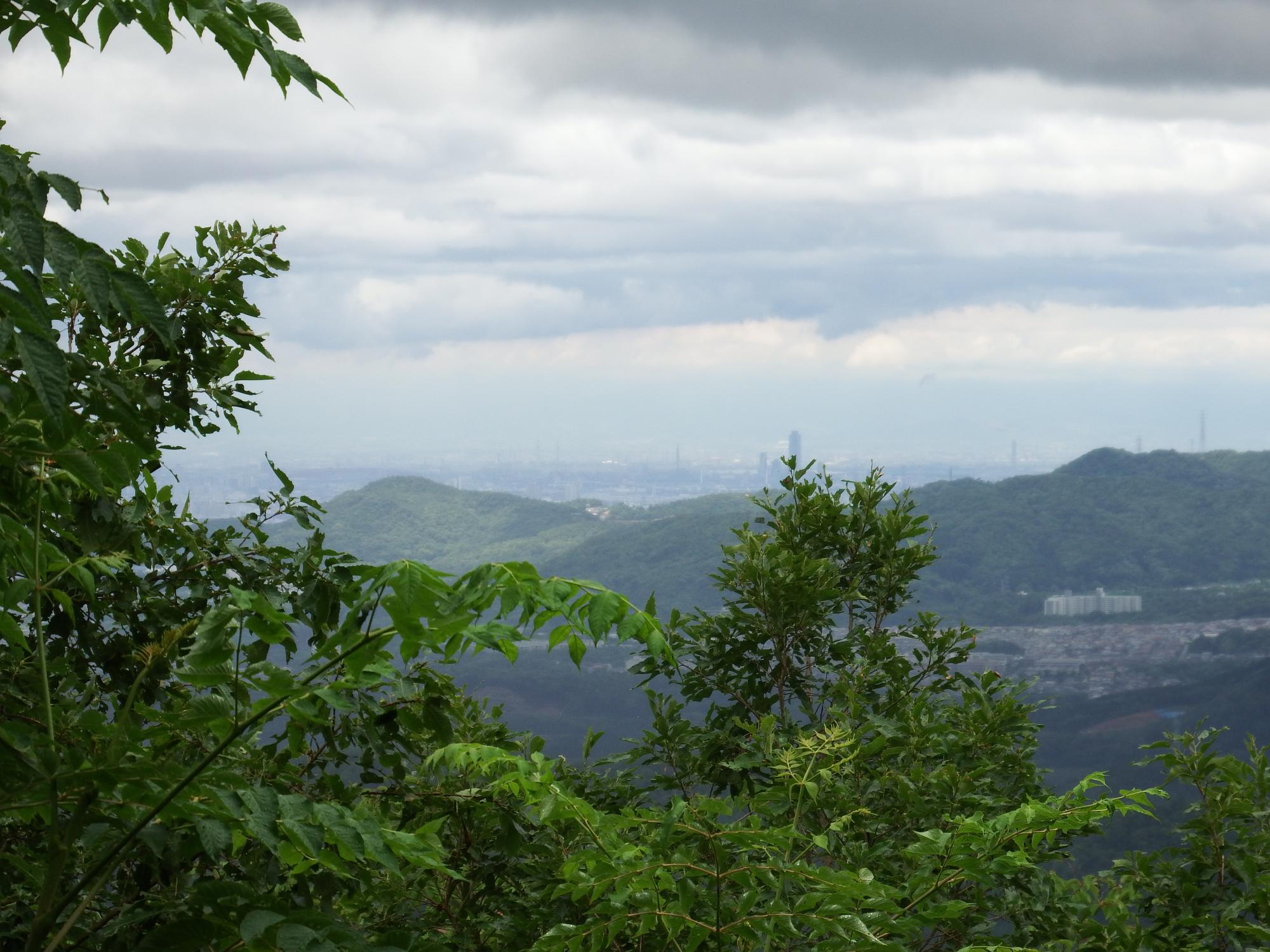 ヒカゲチョウみっけ。クマザサを掻き分け20分ほどあるくと小さな展望スペースのようなところに出てきました。向こうに見えるのは大阪市内です。