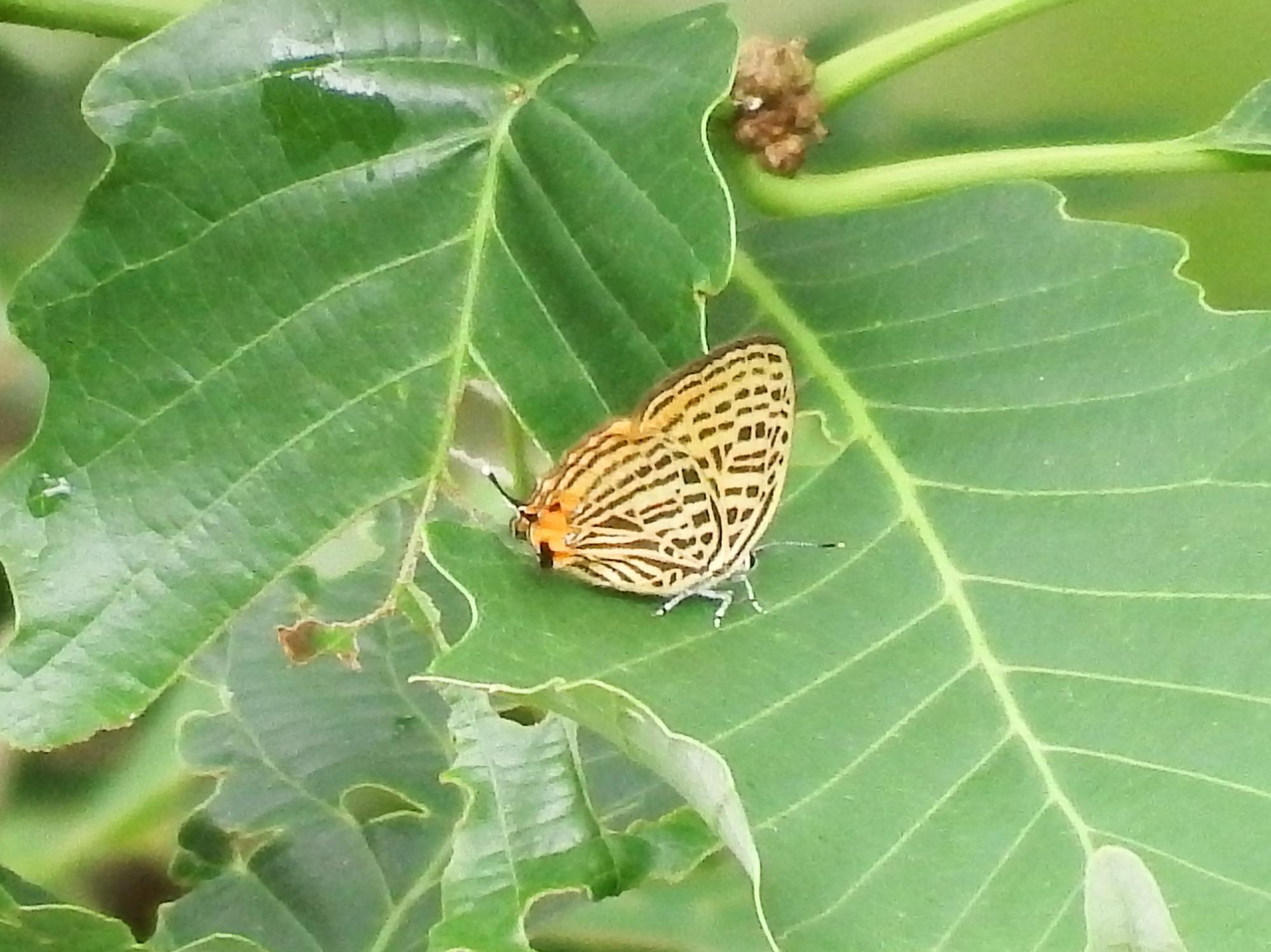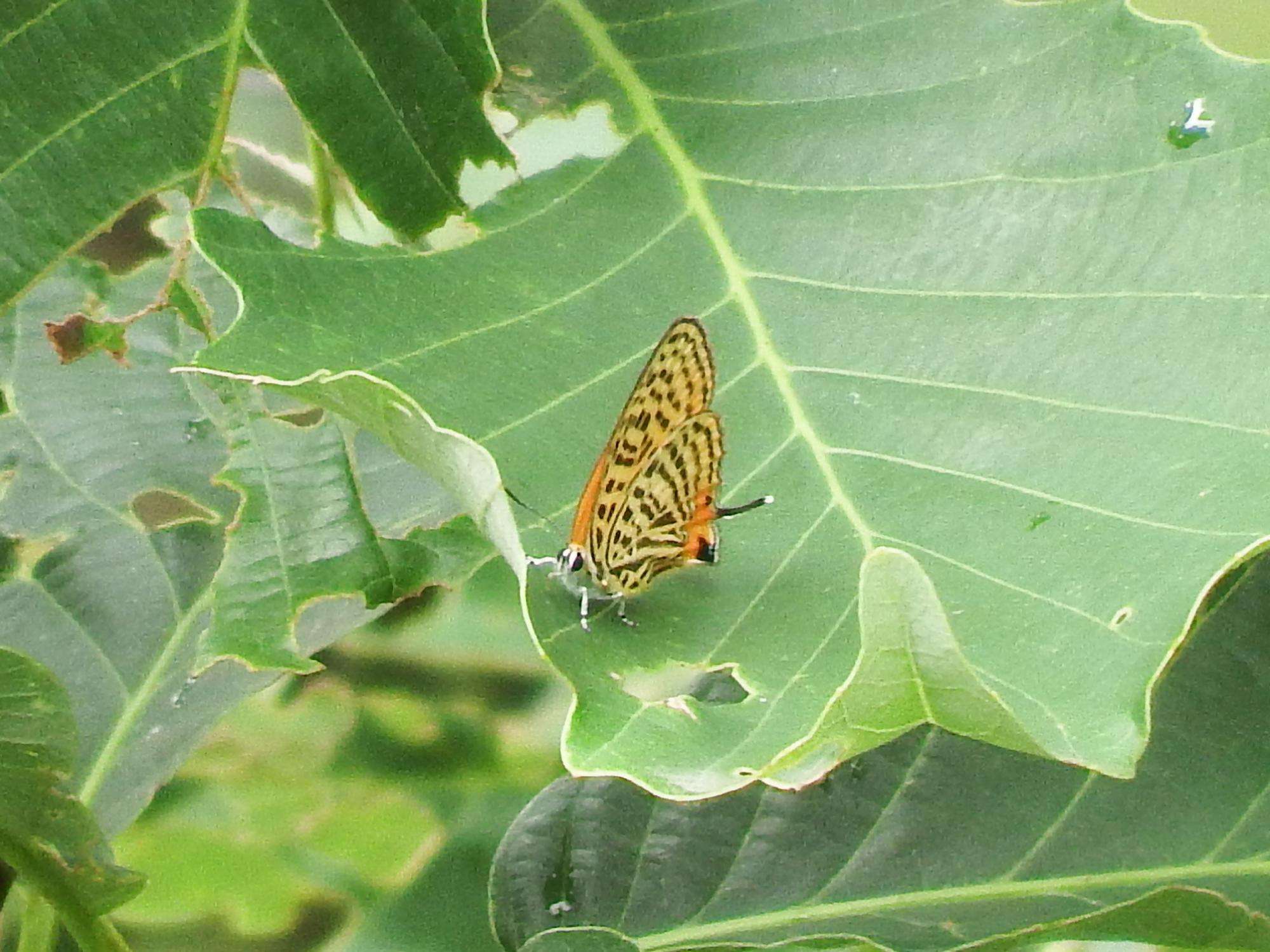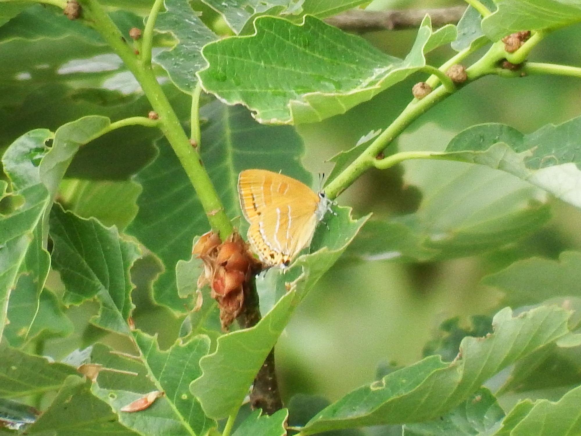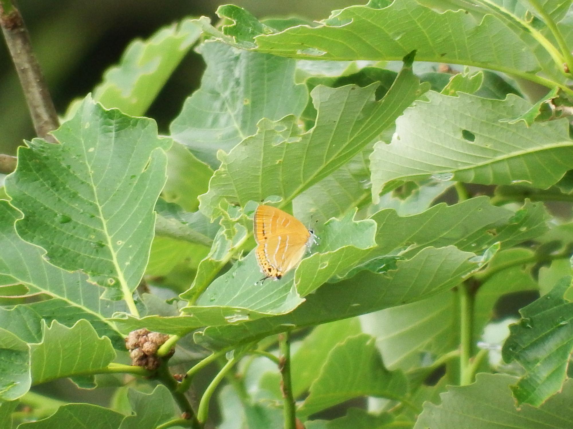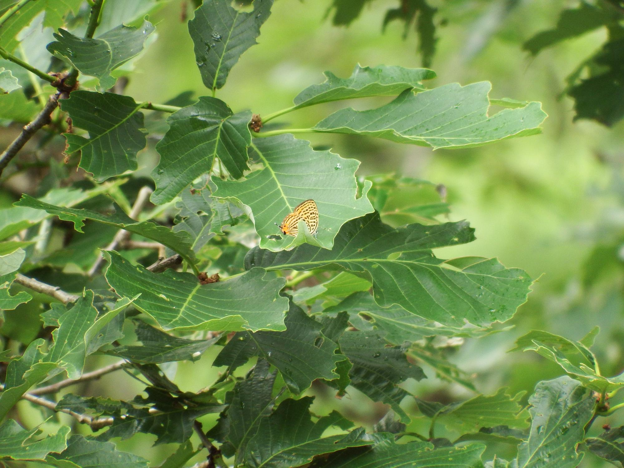 10mほど先の木の葉っぱに黄色いのが止まっているのを見つけました。ズームしてみるとウラナミアカシジミ、ゼフィルス25種の1種です。ゼフィルス・コンプリートを目指して、ウラナミアカシジミをゼフィルス1号と呼ぶことにします。