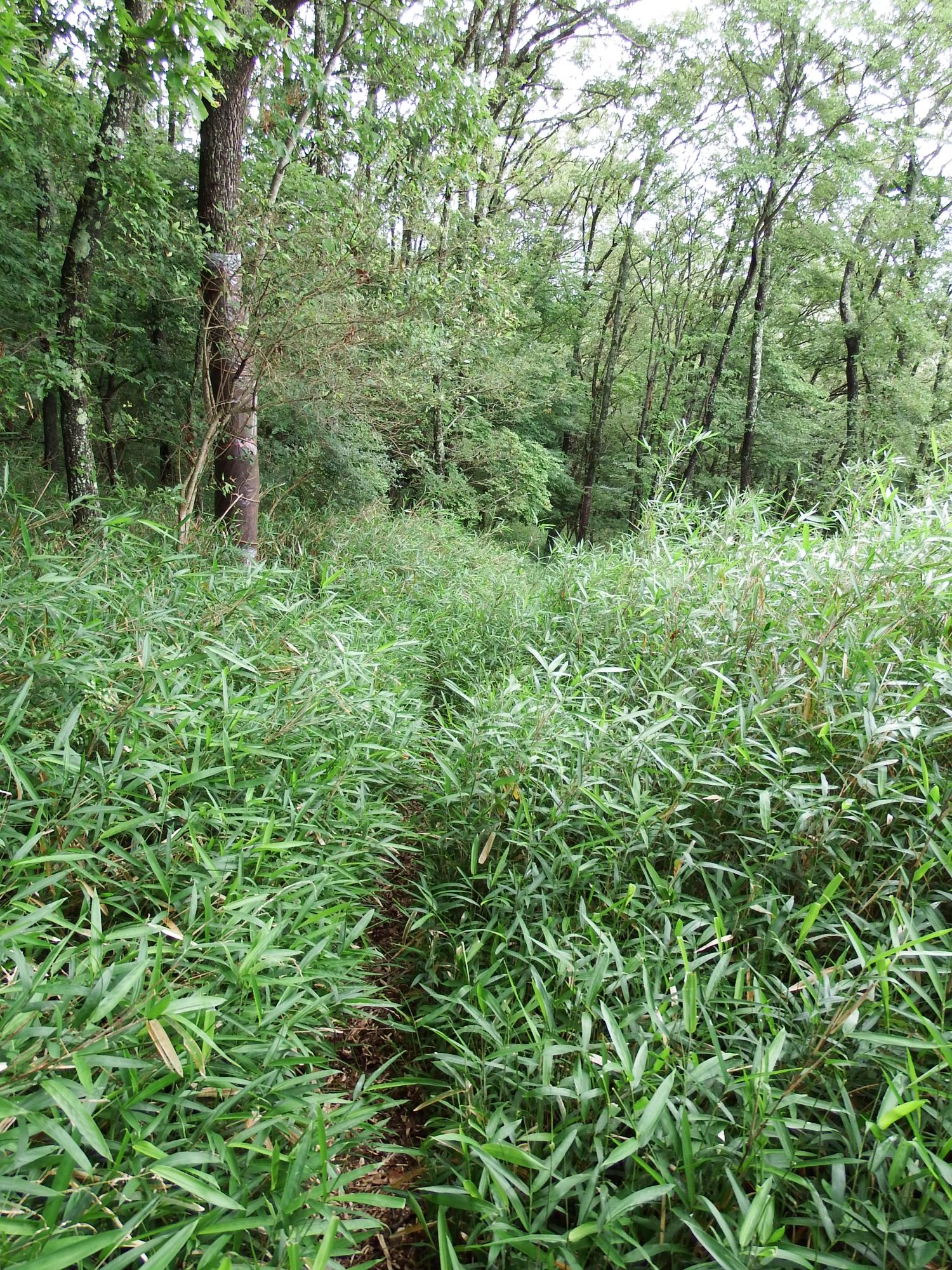 ゼフィルスの森トラストとある看板があって、道が3つに分かれています。ゼフィルスの森の真ん中の道を選んで進んでいくと、クマザサに覆われた道がどんどん狭くなっていきます。