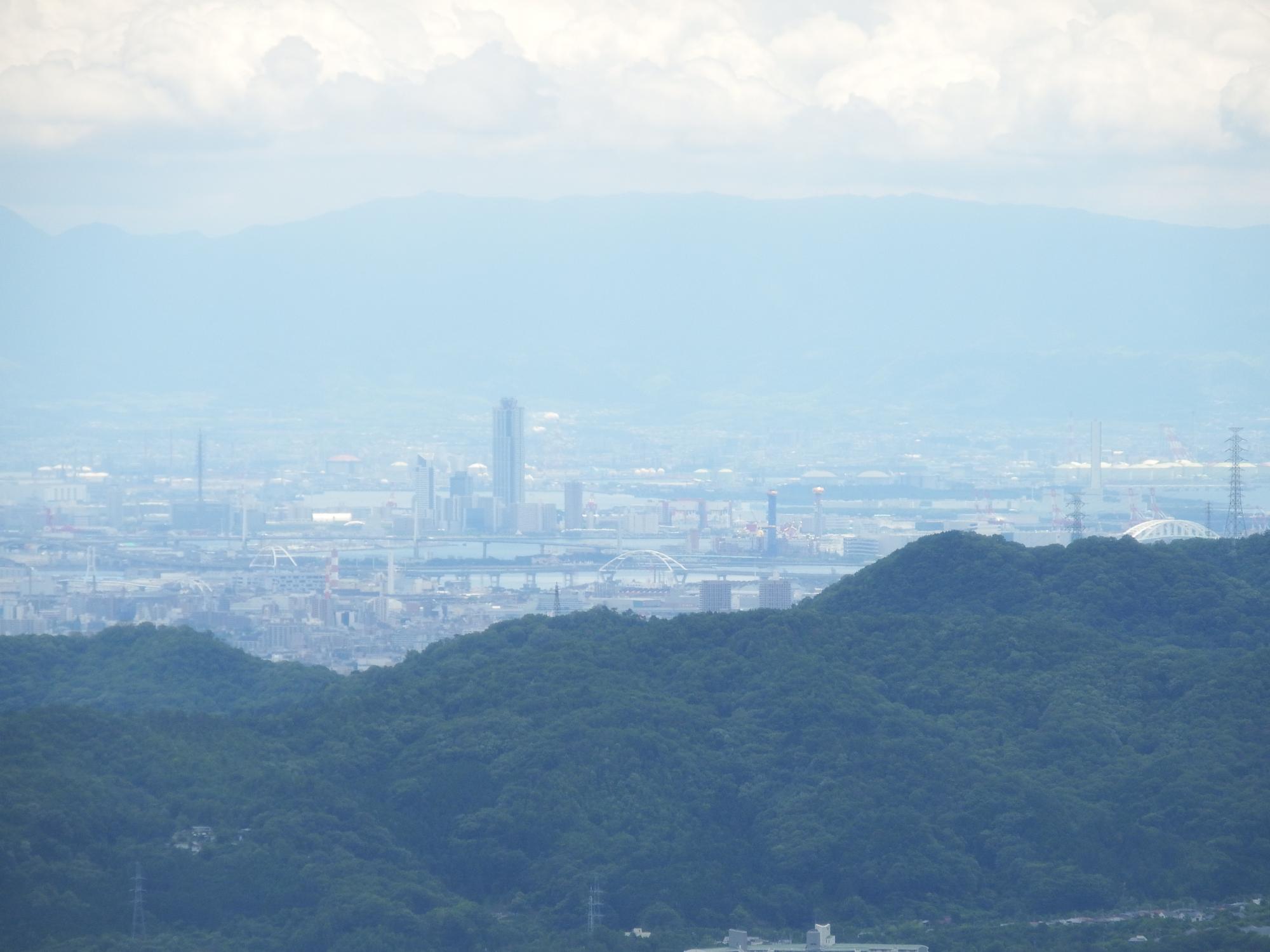 梅田のビル群の向こうにハルカス、そのはるか向こうにPLの塔まで見えます。