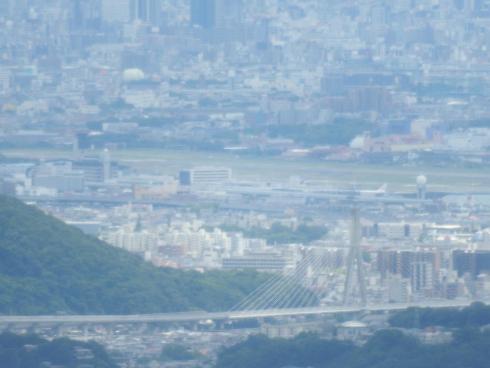 阪神高速池田線の斜張橋ビッグハーブの向こう、大阪空港に駐機しているJAL機が見え、その向こうは淀川、海老江辺りです。