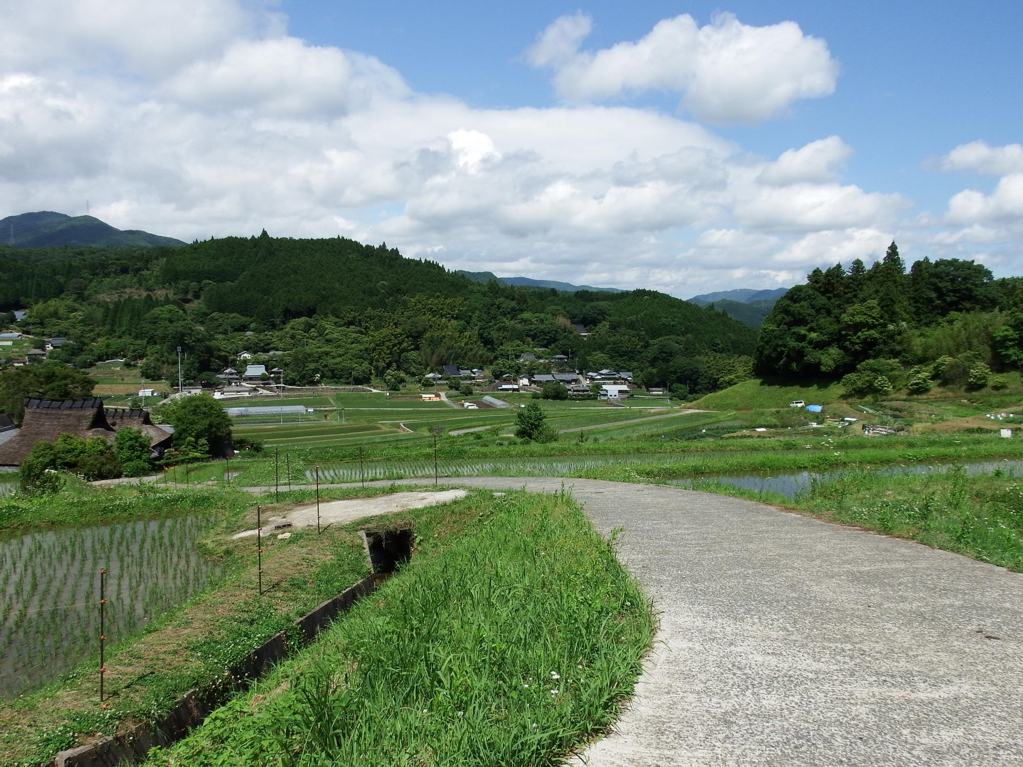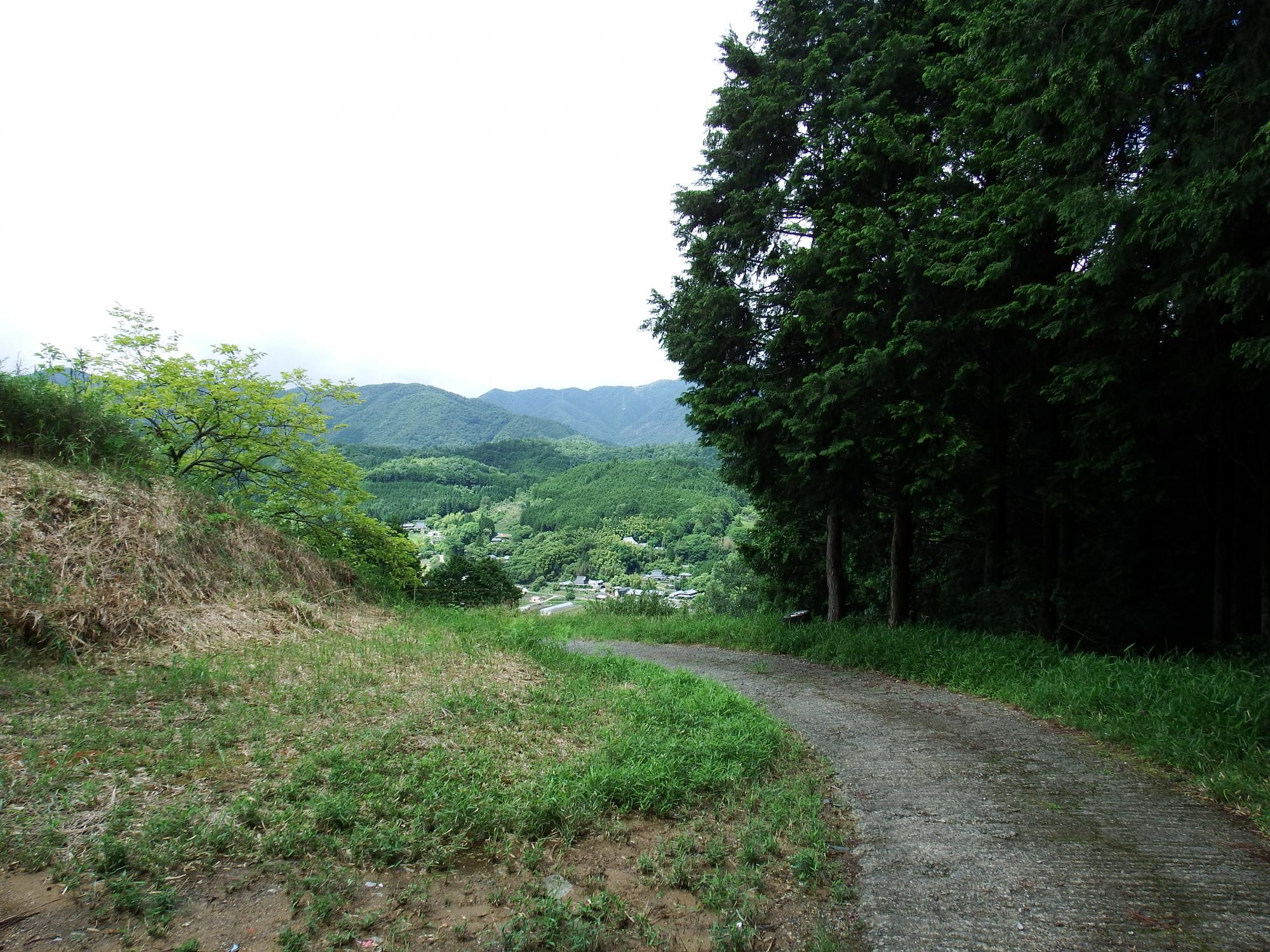 運動会の音を避けたいので山頂から反対側へ下りることにします。かなり急な下り坂で膝はガクガク、時々後ろ向きに歩いたりしながら林道に出て、九十九折の林道を下ると、ようやく谷が開けてきました。