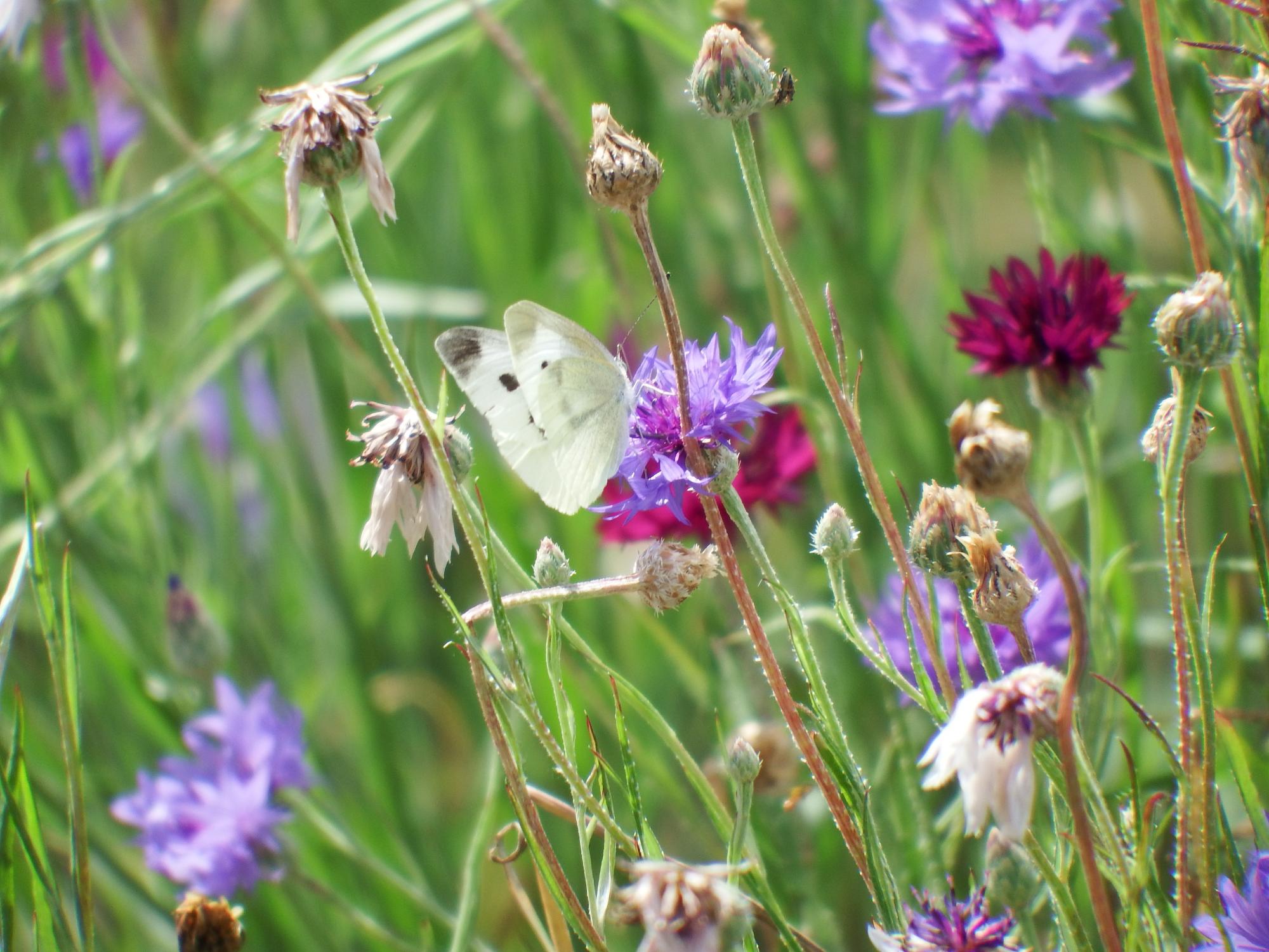 棚田の中の農道を下りて行きます。モンシロチョウが止まる紫やかえんじ色の花はたぶんネギの仲間のアサツキたぶんヤグルマソウ。