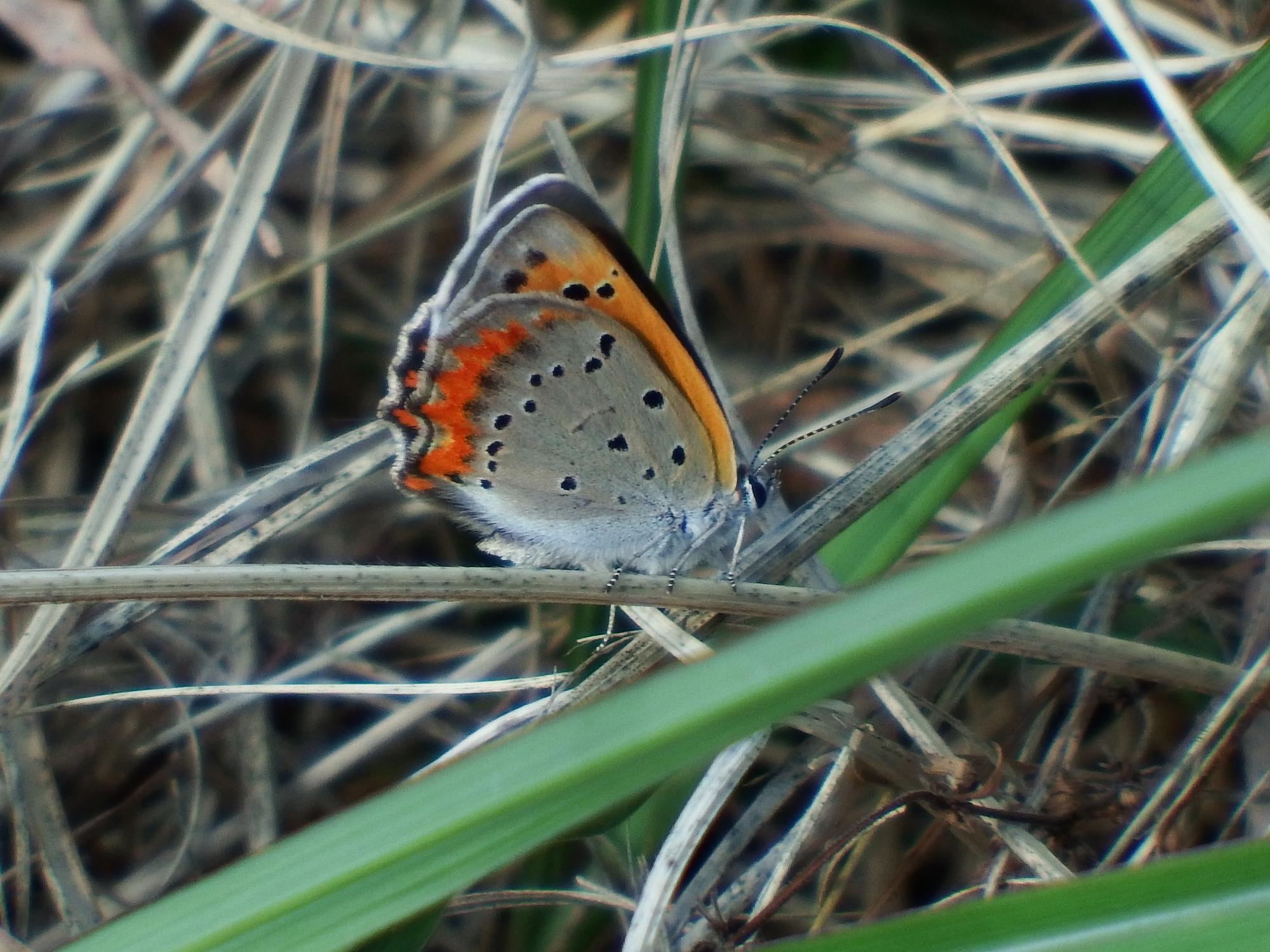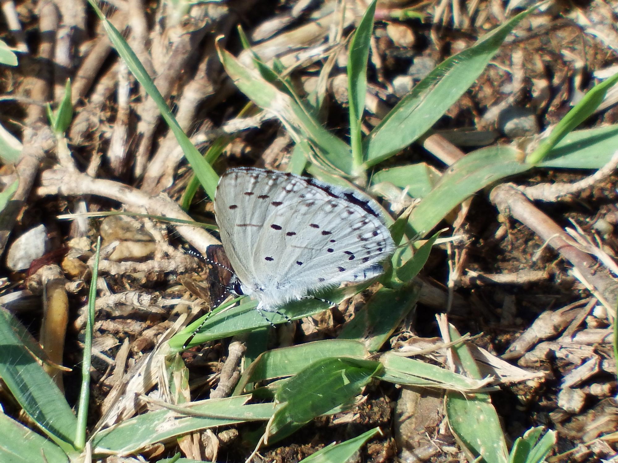 ツバメシジミとかと比べると同じシジミチョウでもかなり大きいですが、それでも10m先の1円玉を撮っている感じです。もうちょっと近づきたいのですが、間は急なスロープにクマザサが茂っていて断念。それでも無駄足覚悟で来た甲斐はありました。