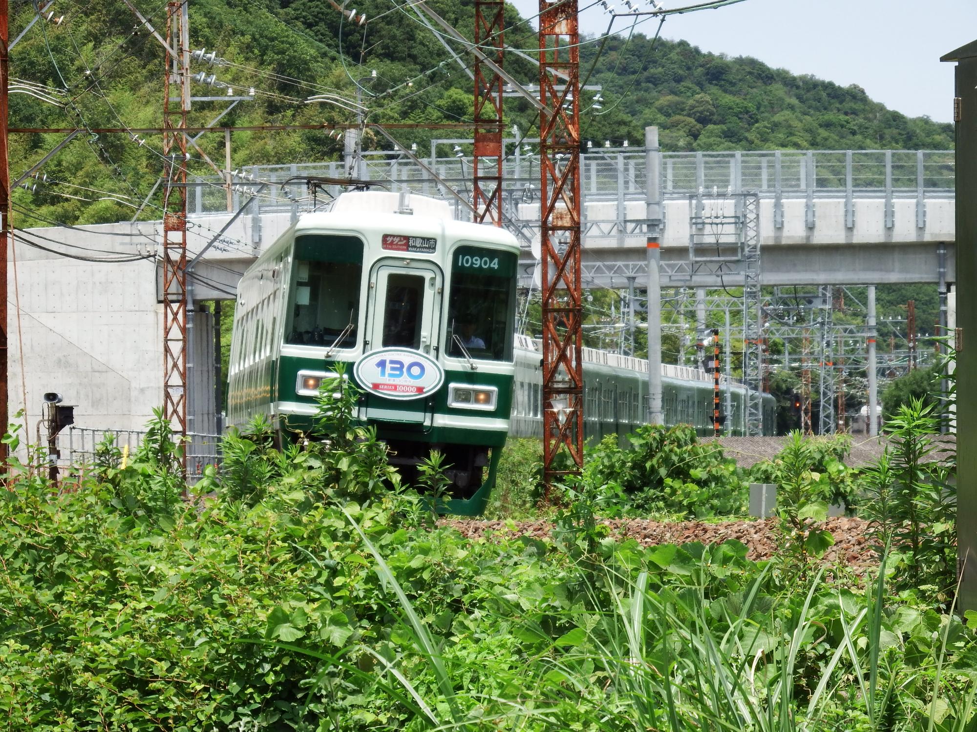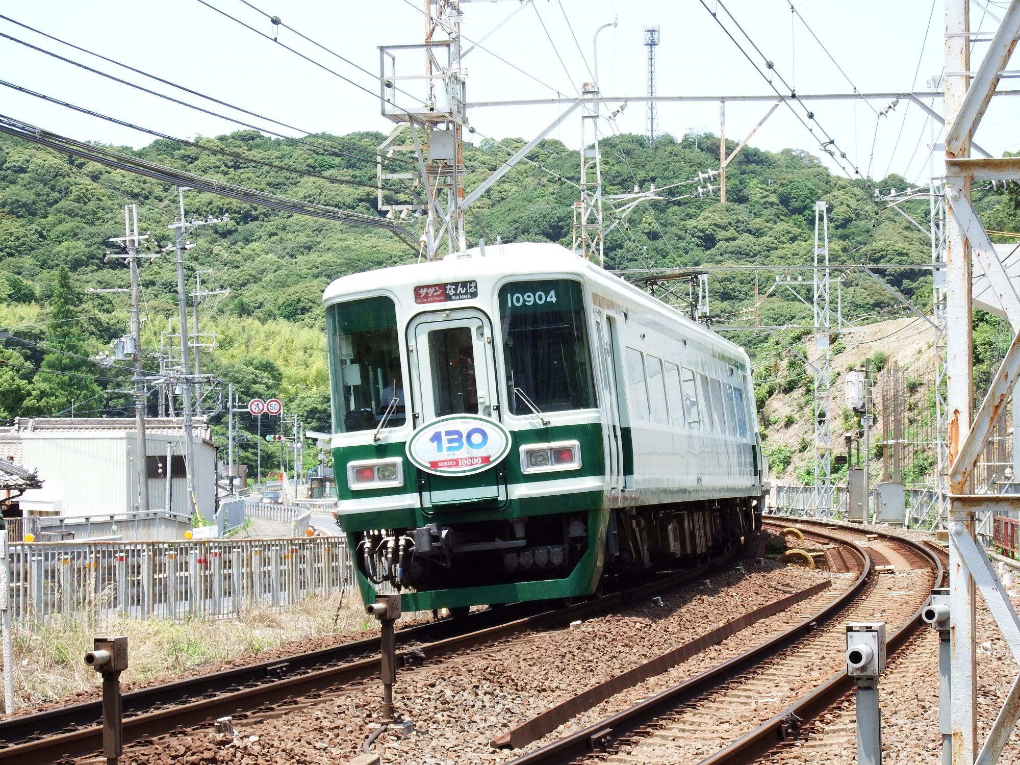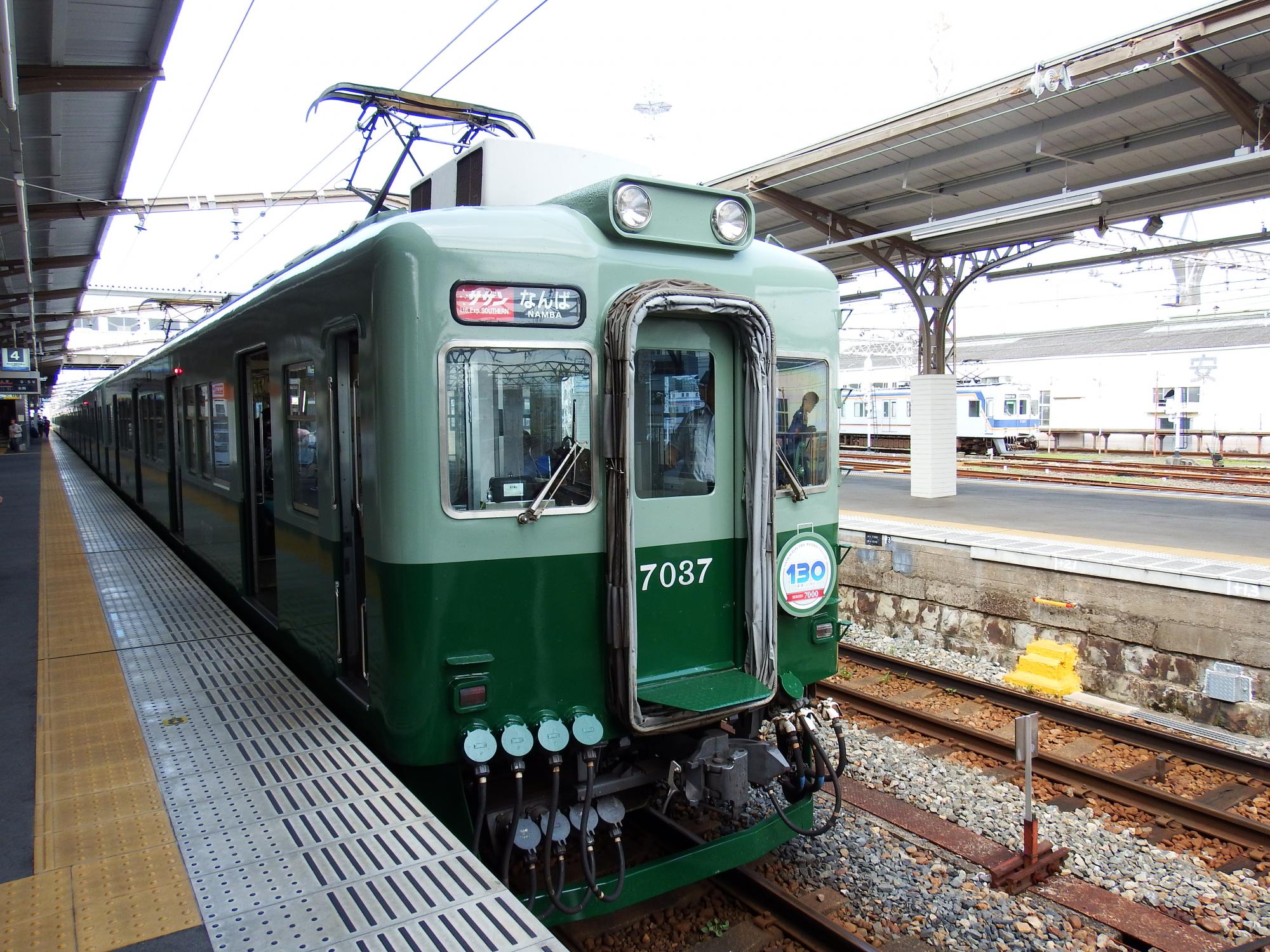 この7037編成以外、通常塗装の7000系が走っているのを見ることはなく、羽倉崎の車庫に何編成か止まっているのを見かけました。特急サザンだけでなく、急行や普通で走っているところも見たいのですが、リバイバルカラーは4両編成だけ、しかも電気系統の仕組みから7000系は4連単独では運用を制限されているらしく、10000系とセットでリバイバルカラーにして花道を飾る、という演出は、出来る限りの工夫を重ねた結果と思われます。