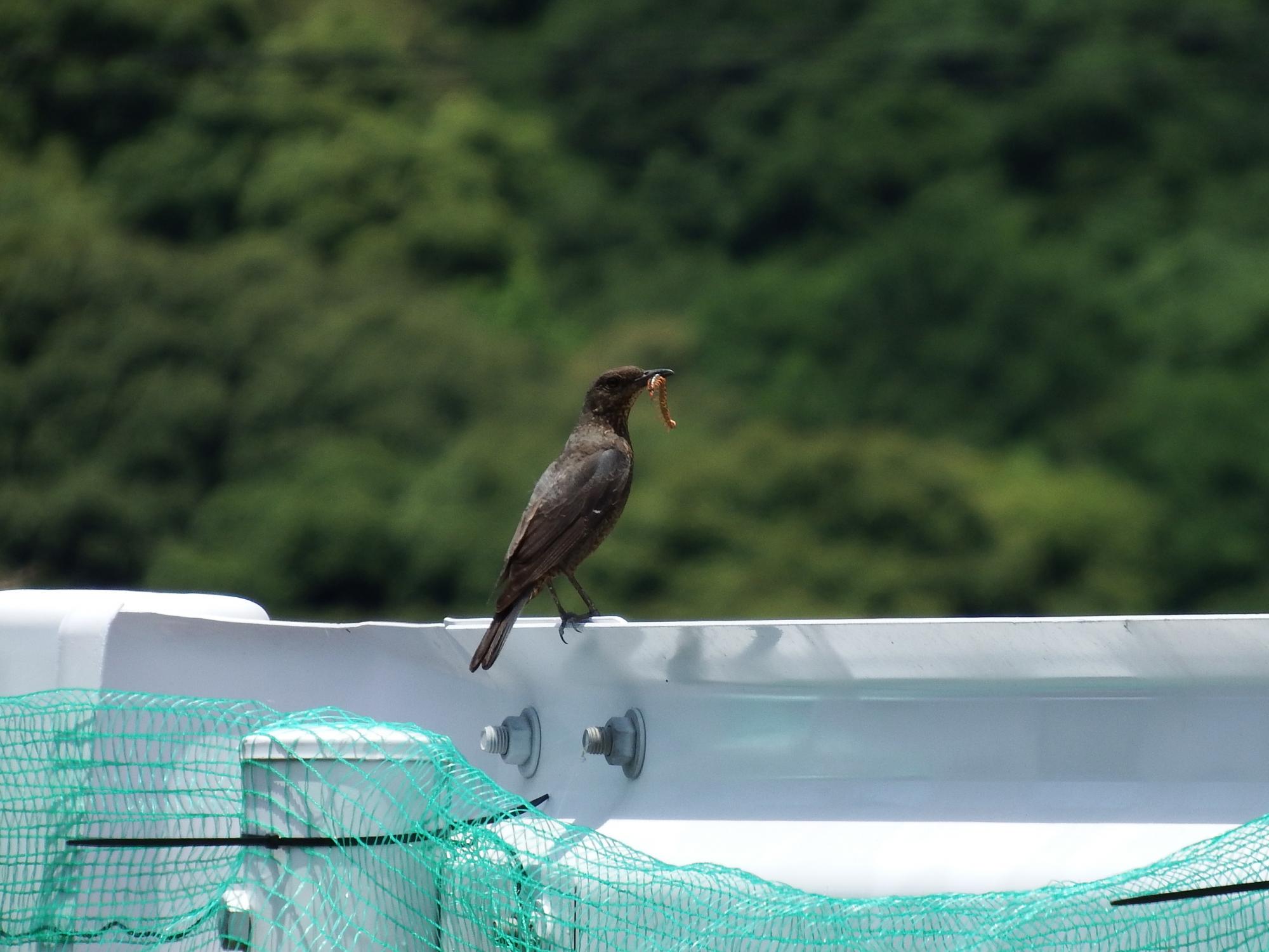 イソヒヨドリ♀が小さなムカデか何かを咥えています。