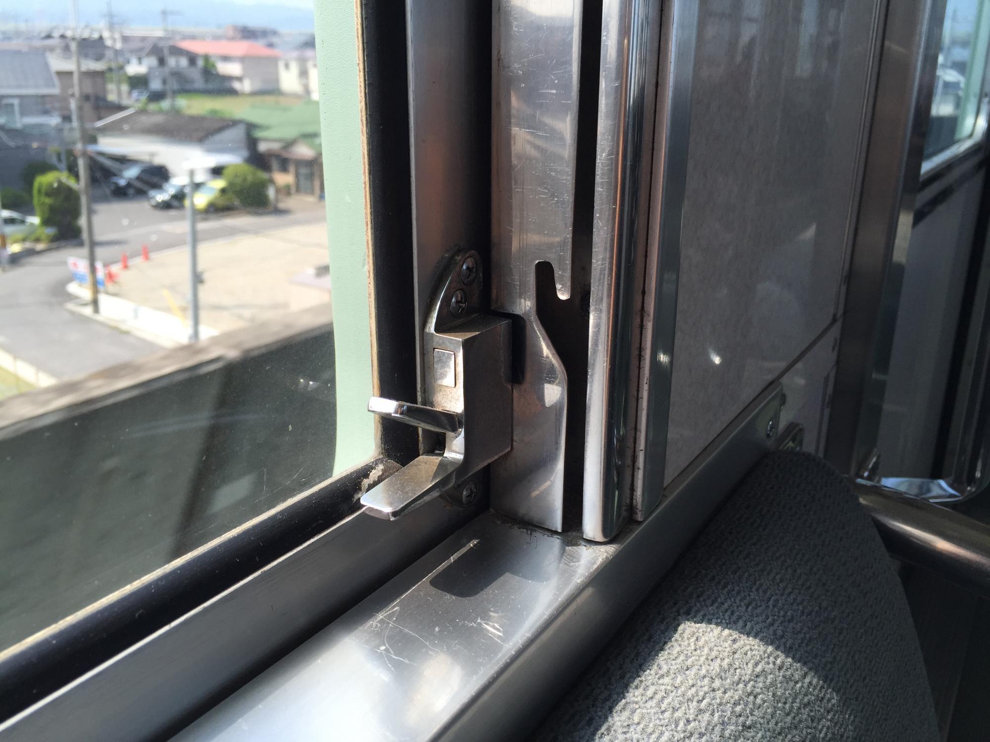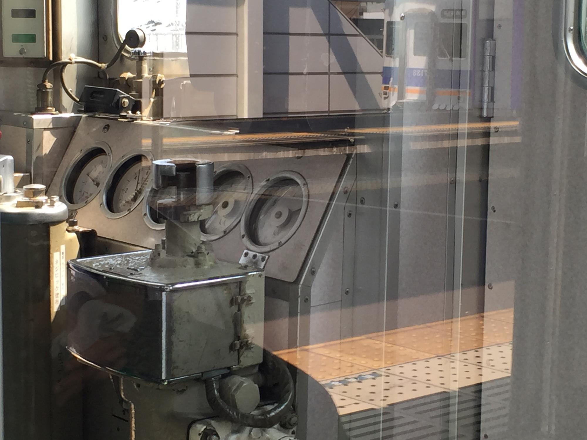 昭和感たっぷりのマスコンとブレーキの運転席、2枚式昇降窓の留具。