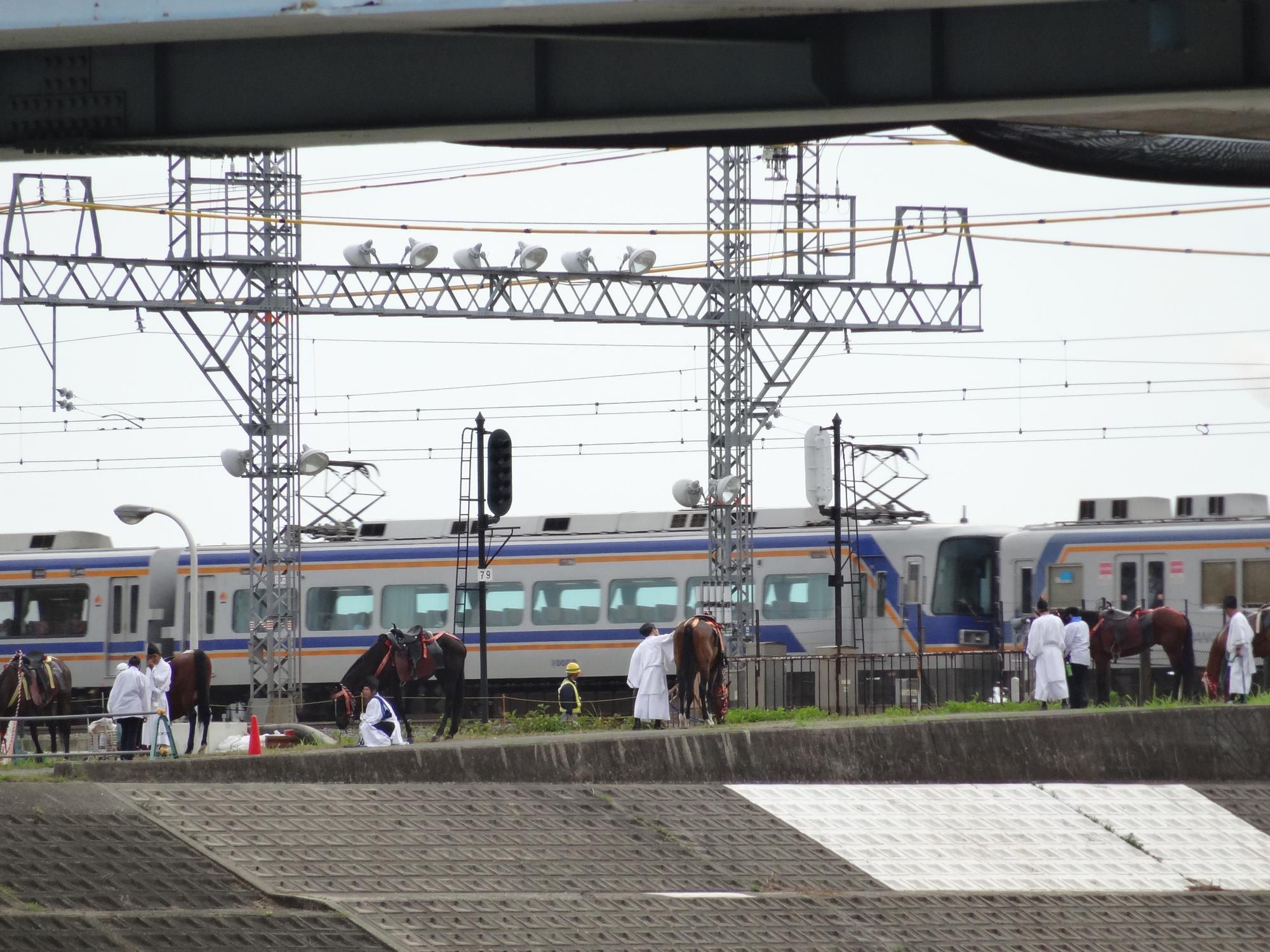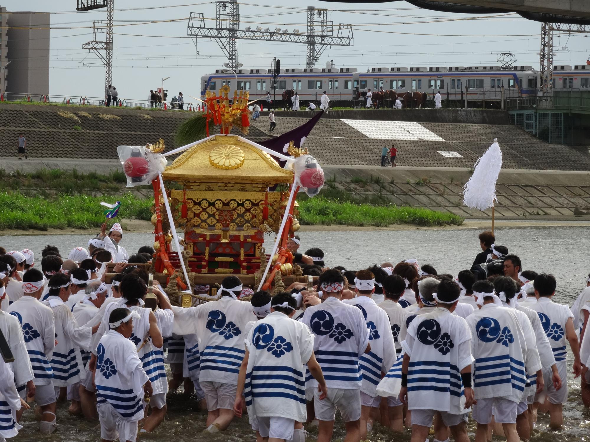 そろそろ馬がやってきてもいいはずですが、現れません。土手の馬と神官装束の御者と緑の7000系が一番撮りたかったシーンなのですが、どうやら今年は馬の行列は行われなかったようです。となるとお神輿と緑の7000系のシーンが撮れるかです。