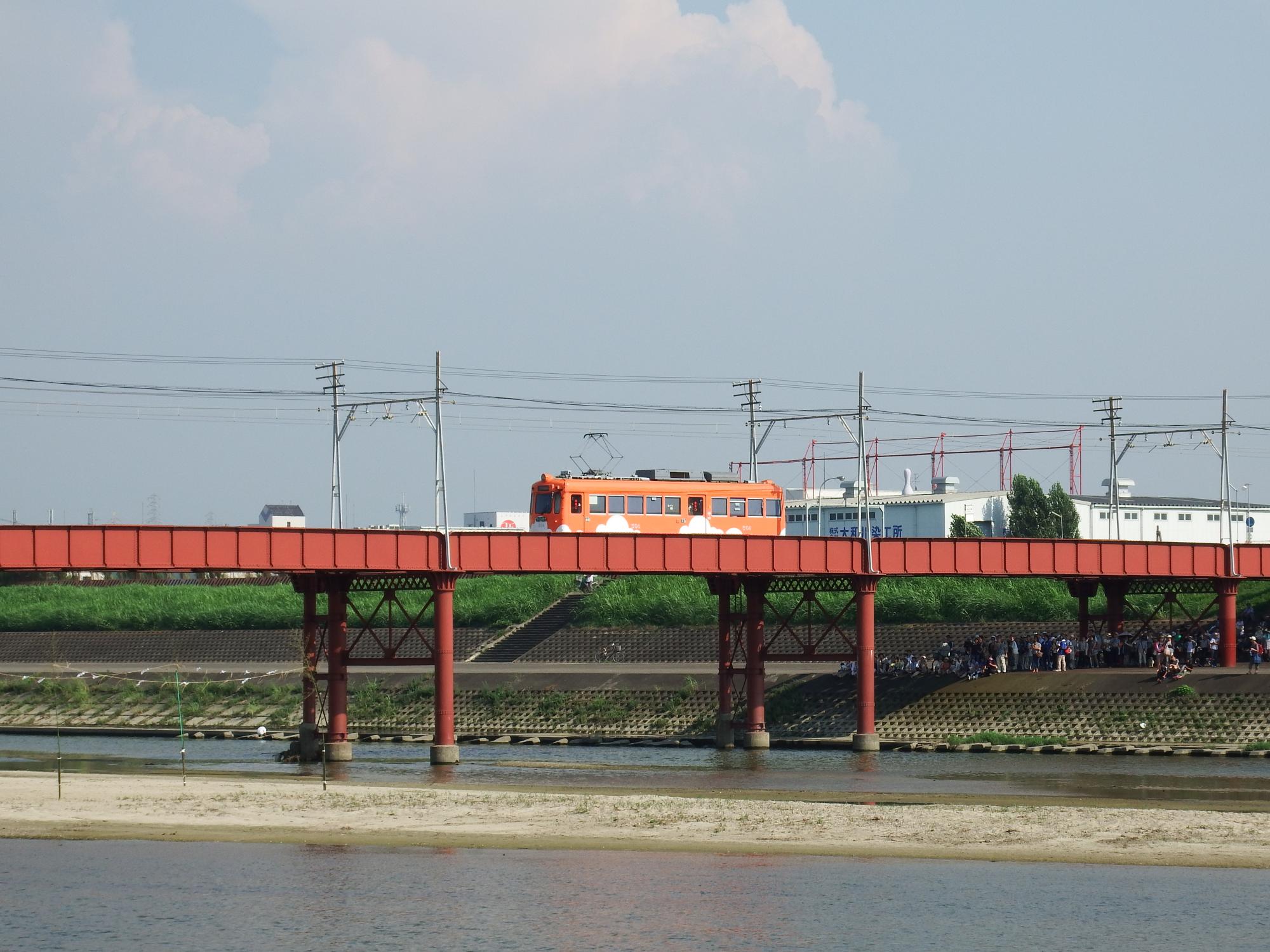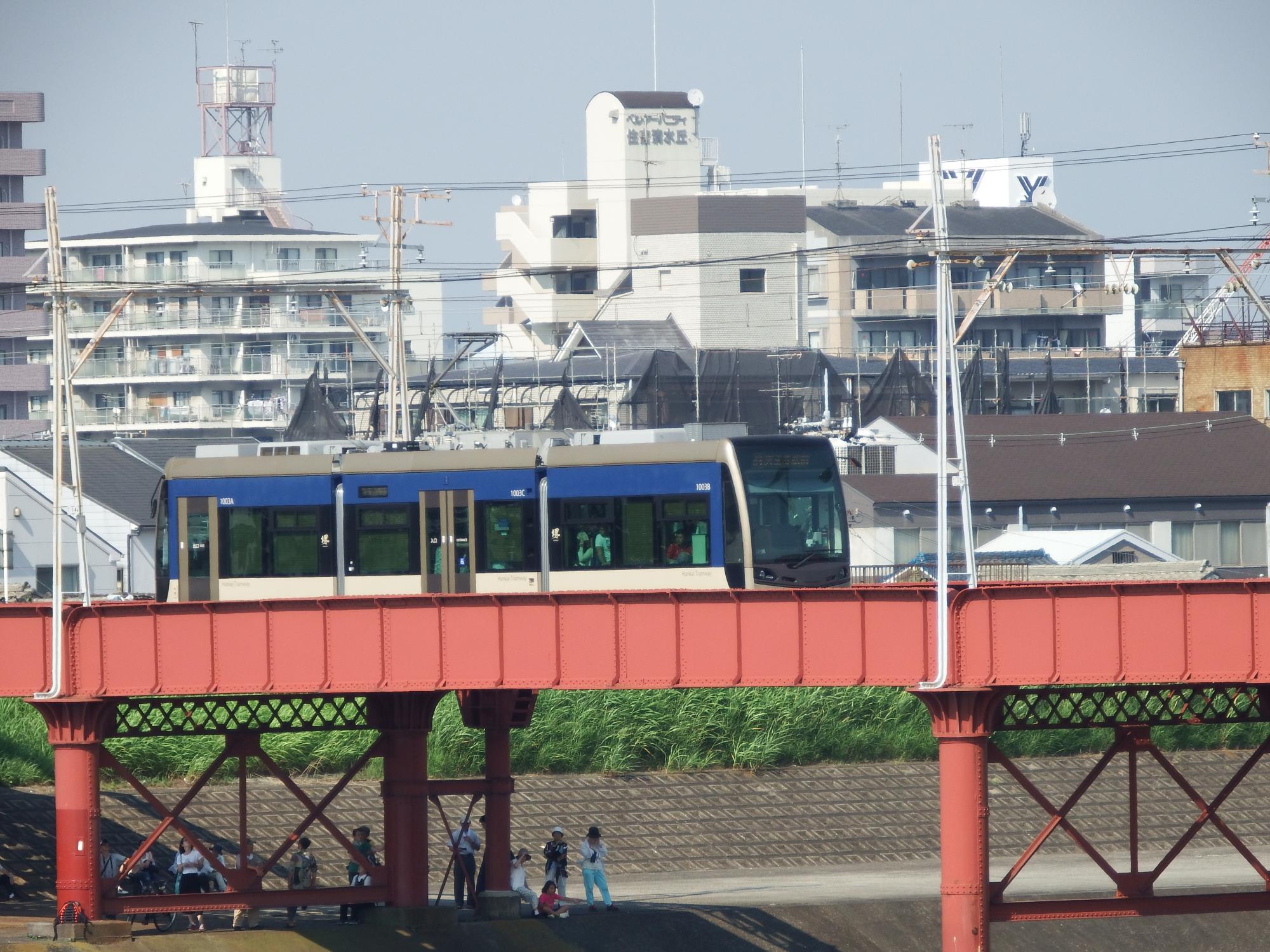 この春に登場したばかりの堺トラム第3編成青らんと、オレンジの雲塗装になったモ504。日陰の少ない河川敷で鉄橋が貴重な陰を提供してくれています。